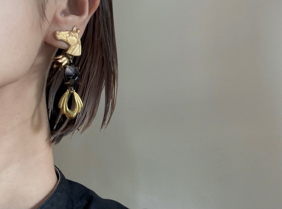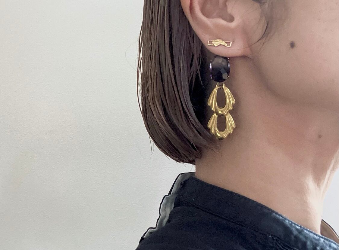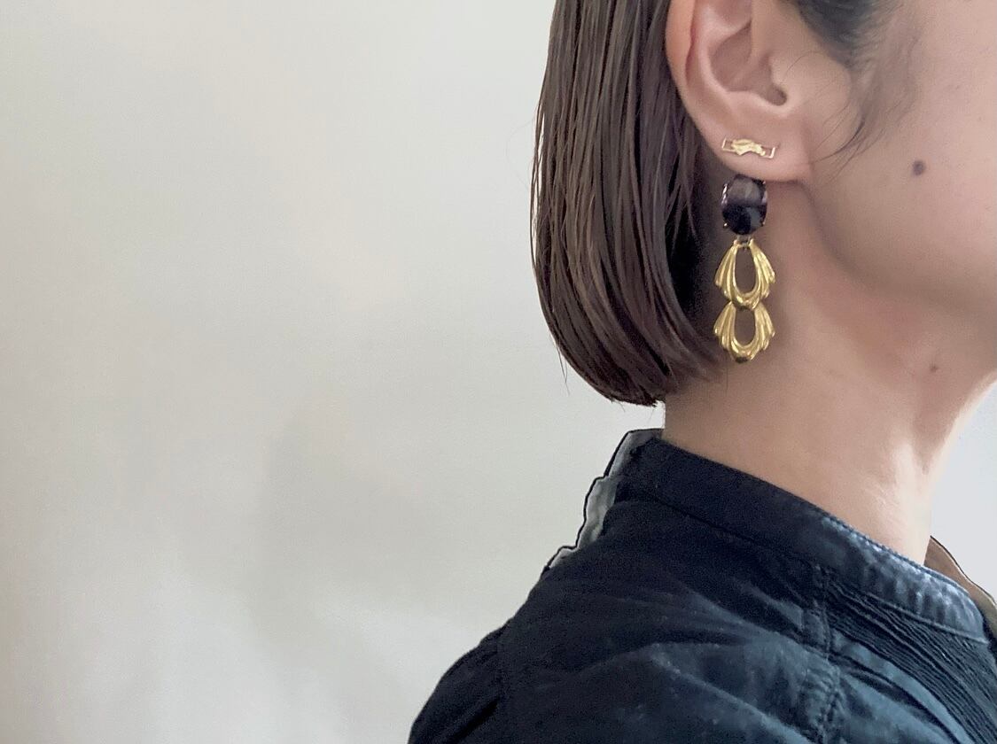 ヴィンテージパーツを組み合わせてアシンメトリーなピアスを作りました。