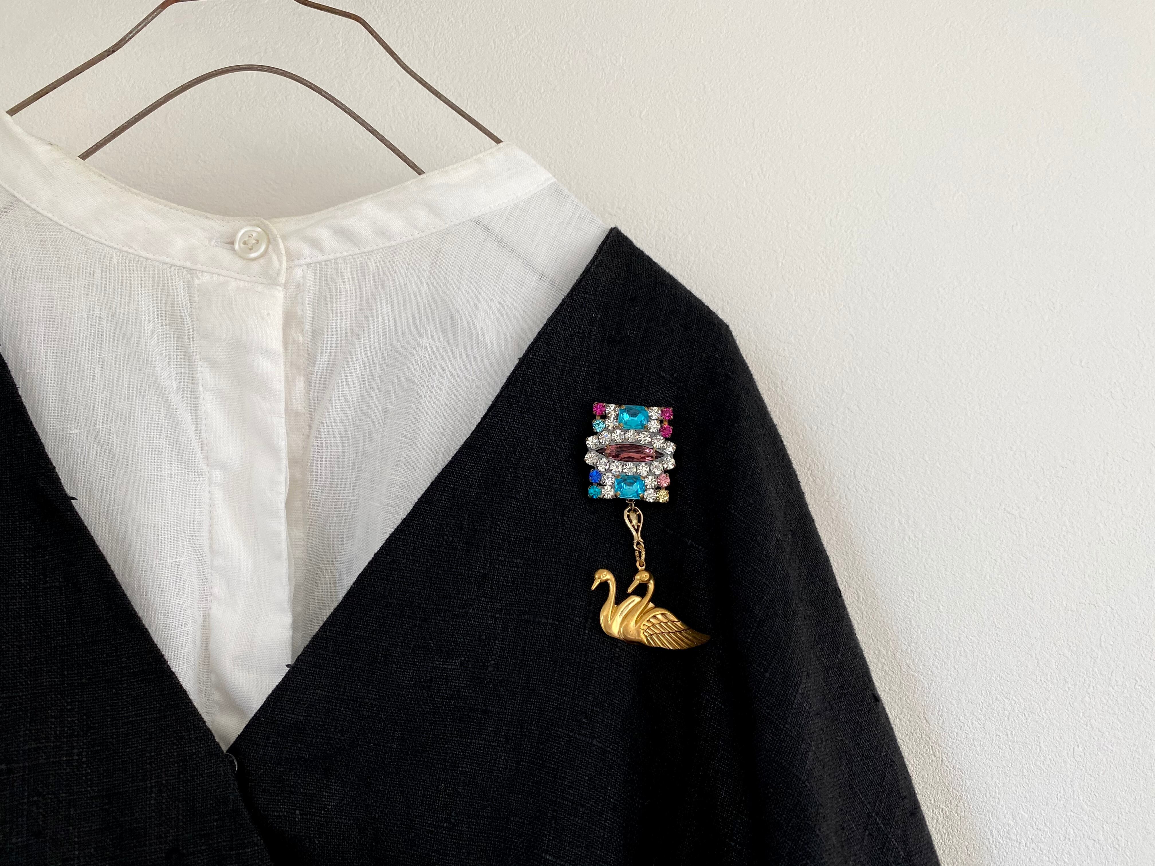 キラキラと美しく、個性的な形のラインストーンのヴィンテージボタンに、優雅な印象の白鳥の真鍮チャームを添えました。