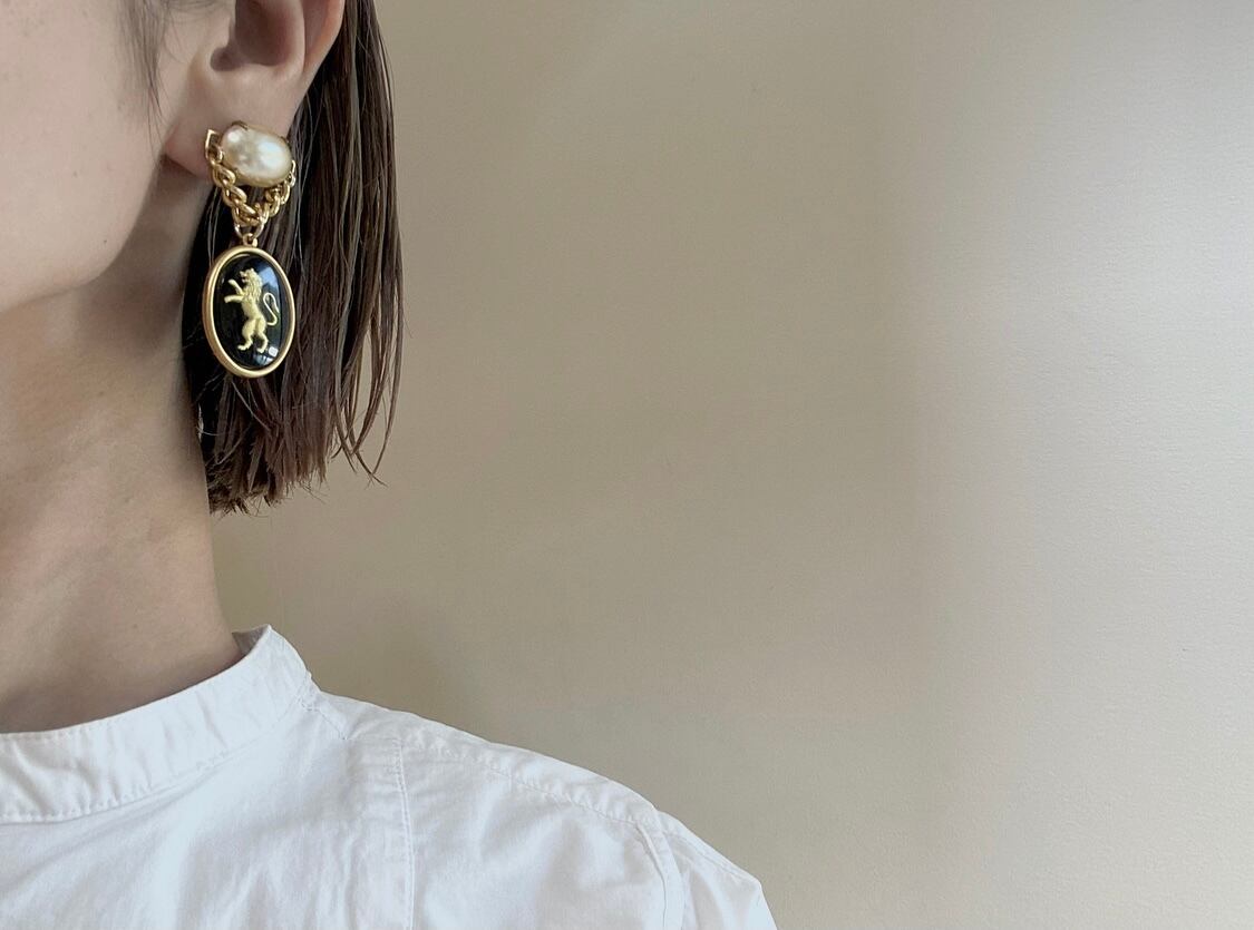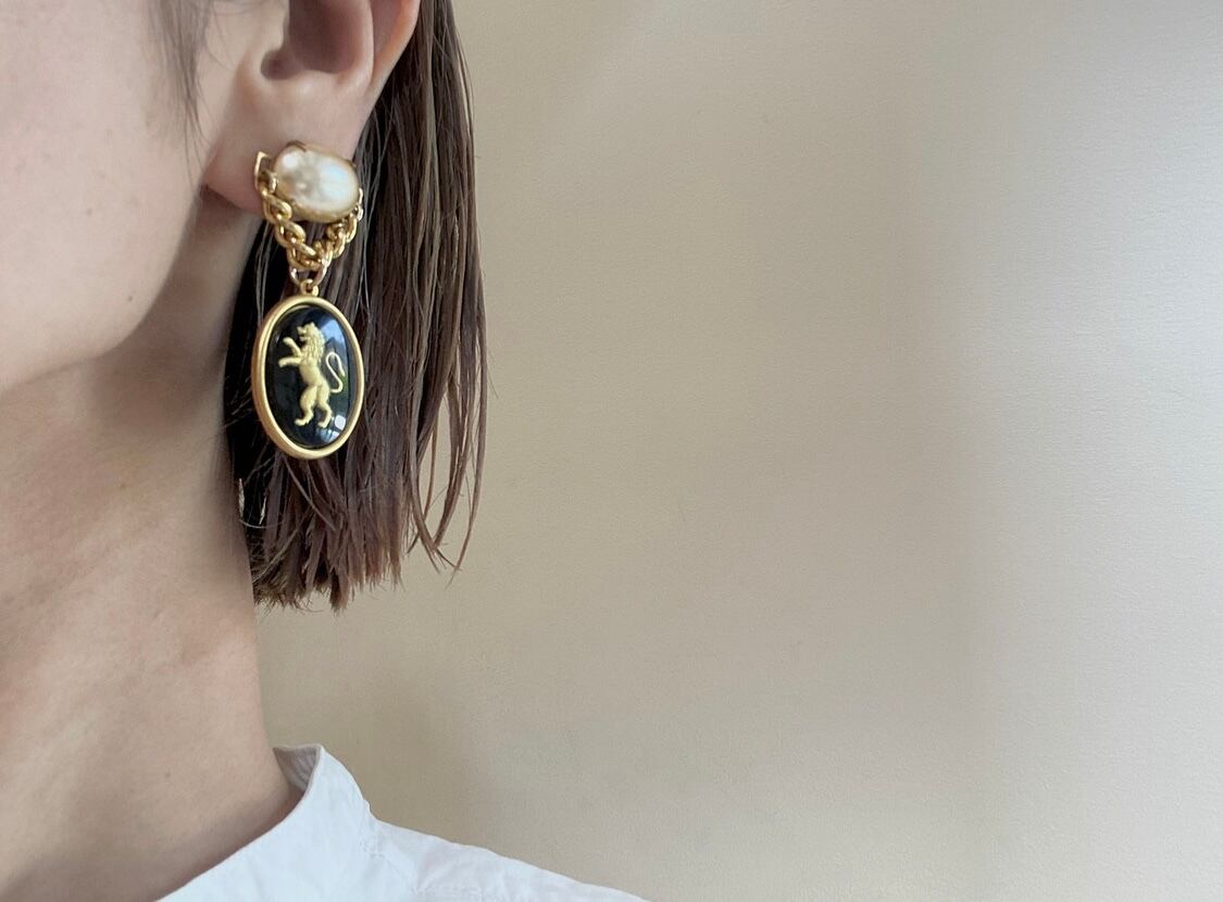 ライオンのヴィンテージガラスパーツ、やシールドモチーフの真鍮パーツに太めのチェーンを組み合わせて、カッコよく少し辛口な雰囲気に仕上げました。
