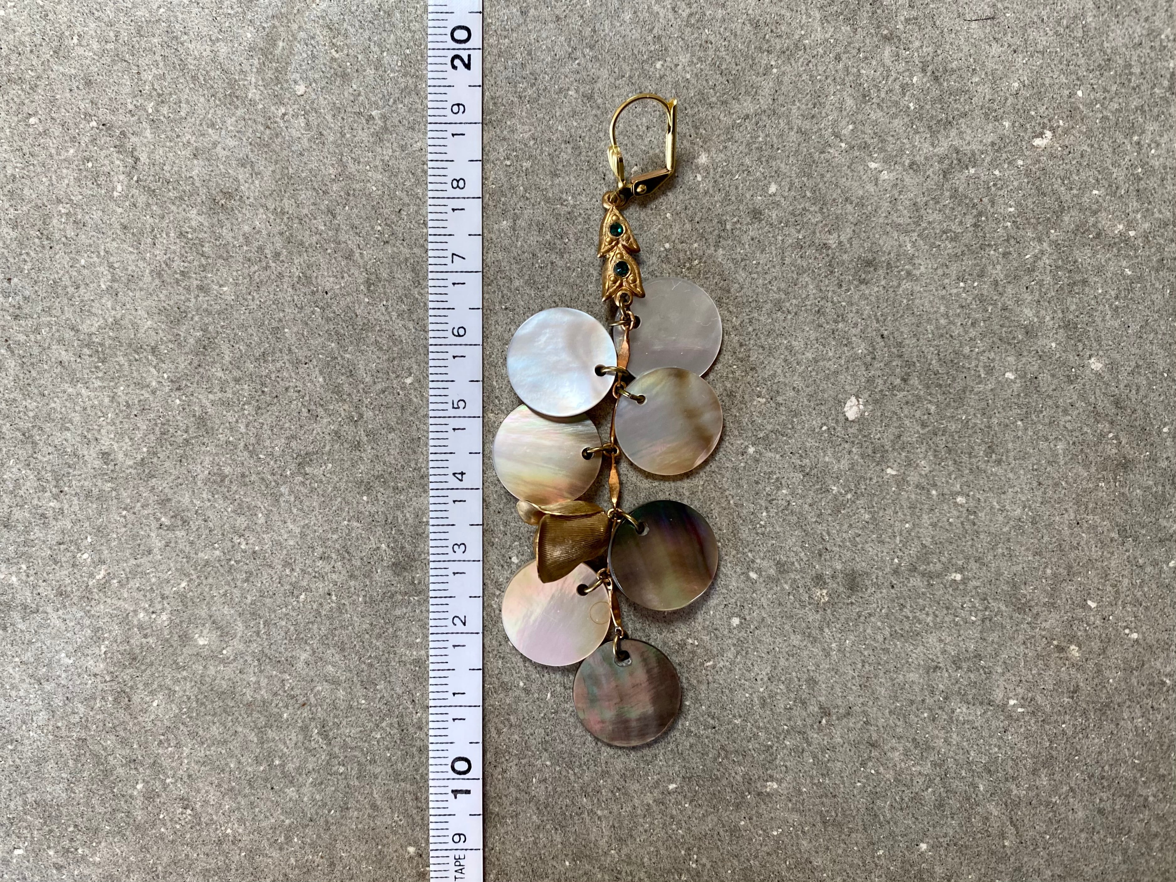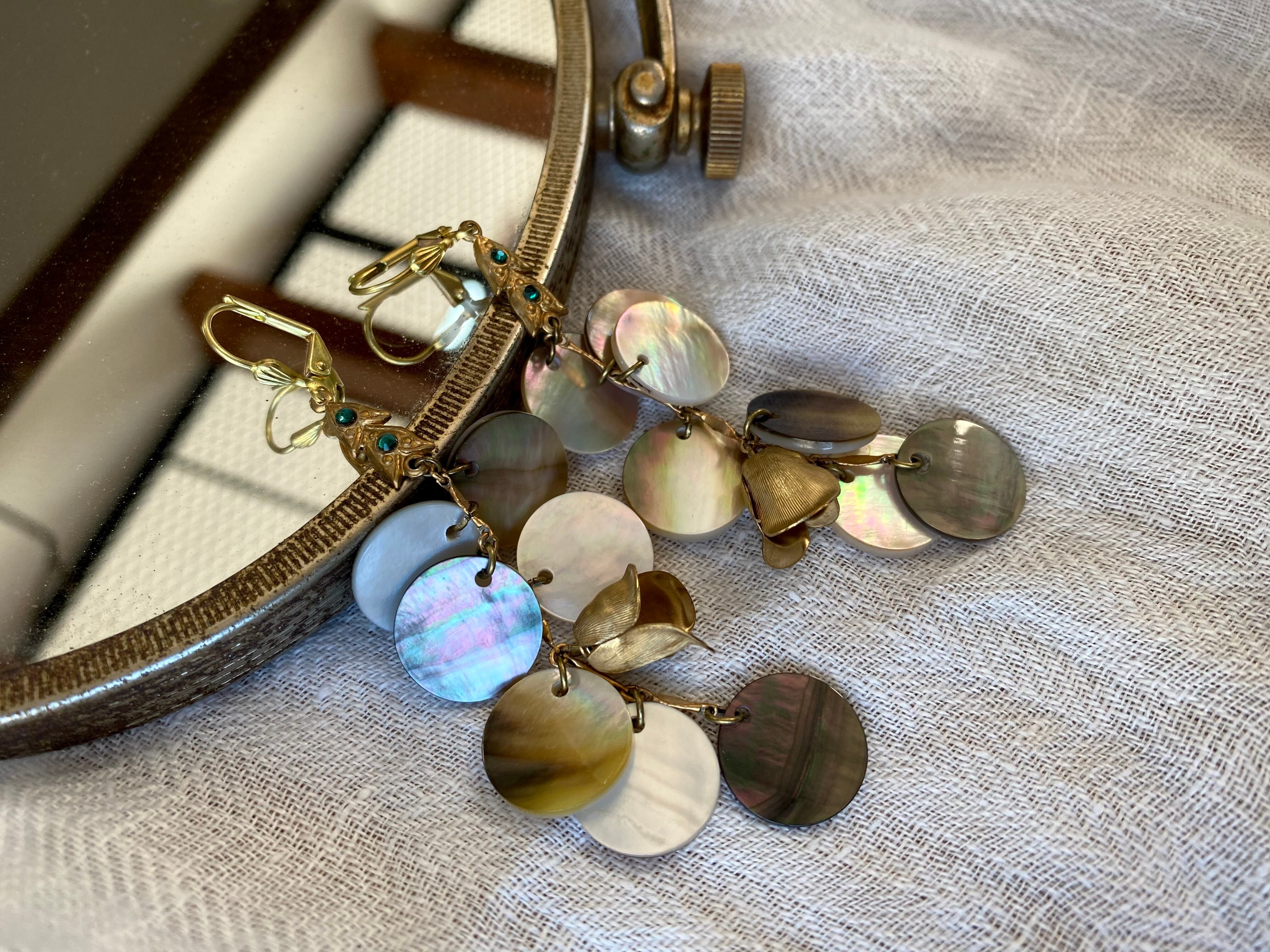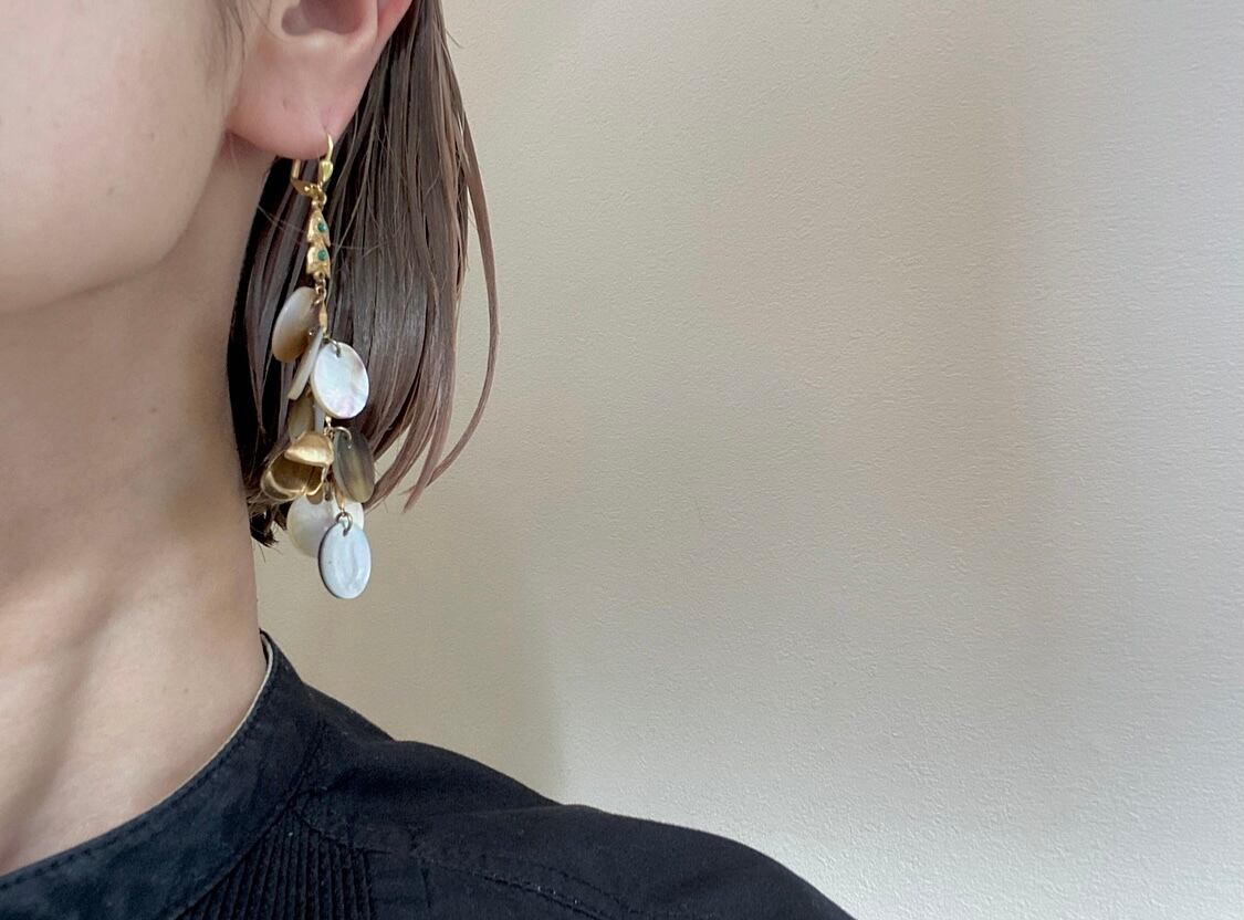 シェルパーツや真鍮パーツを組み合わせてピアスを作りました。