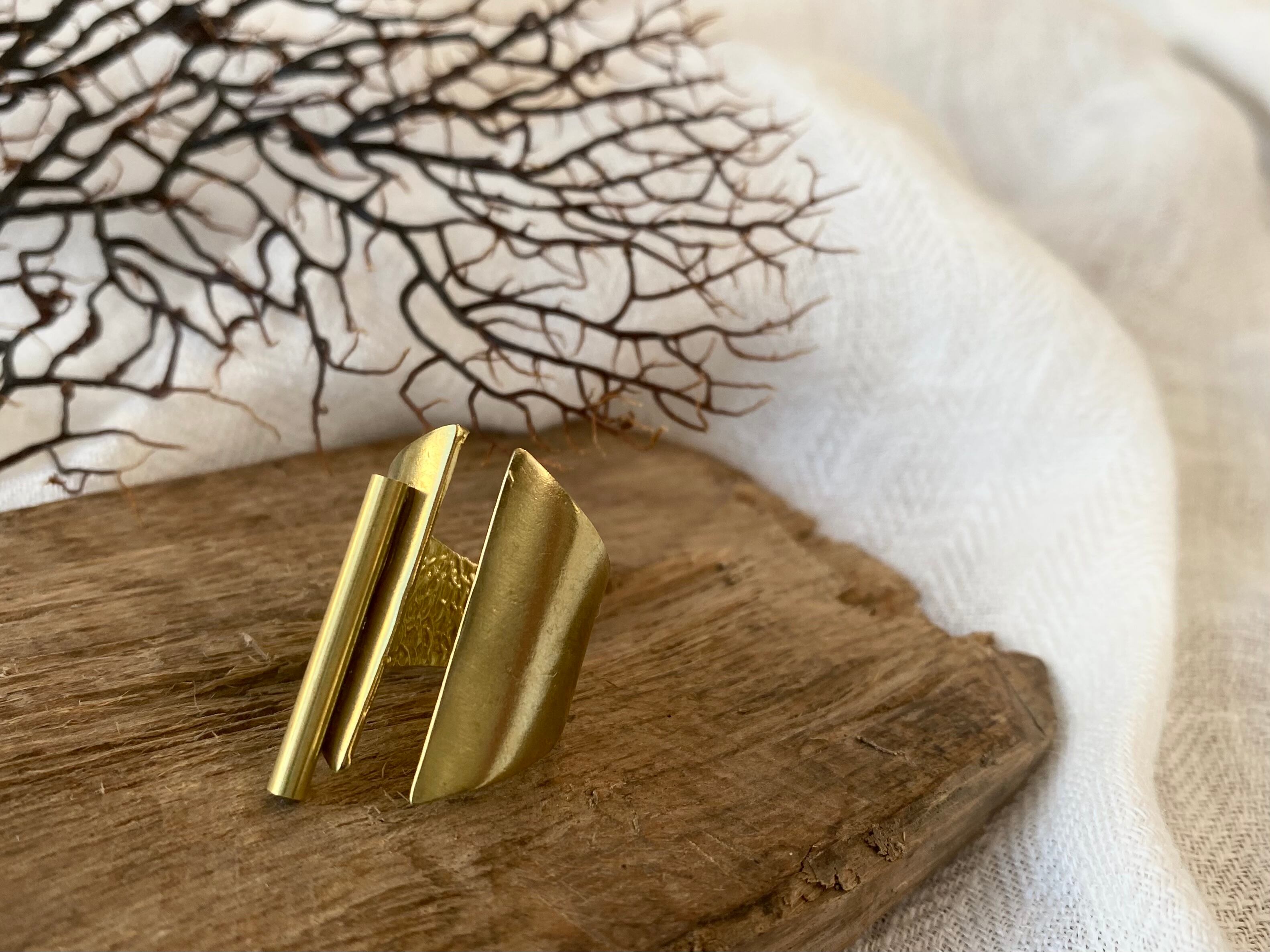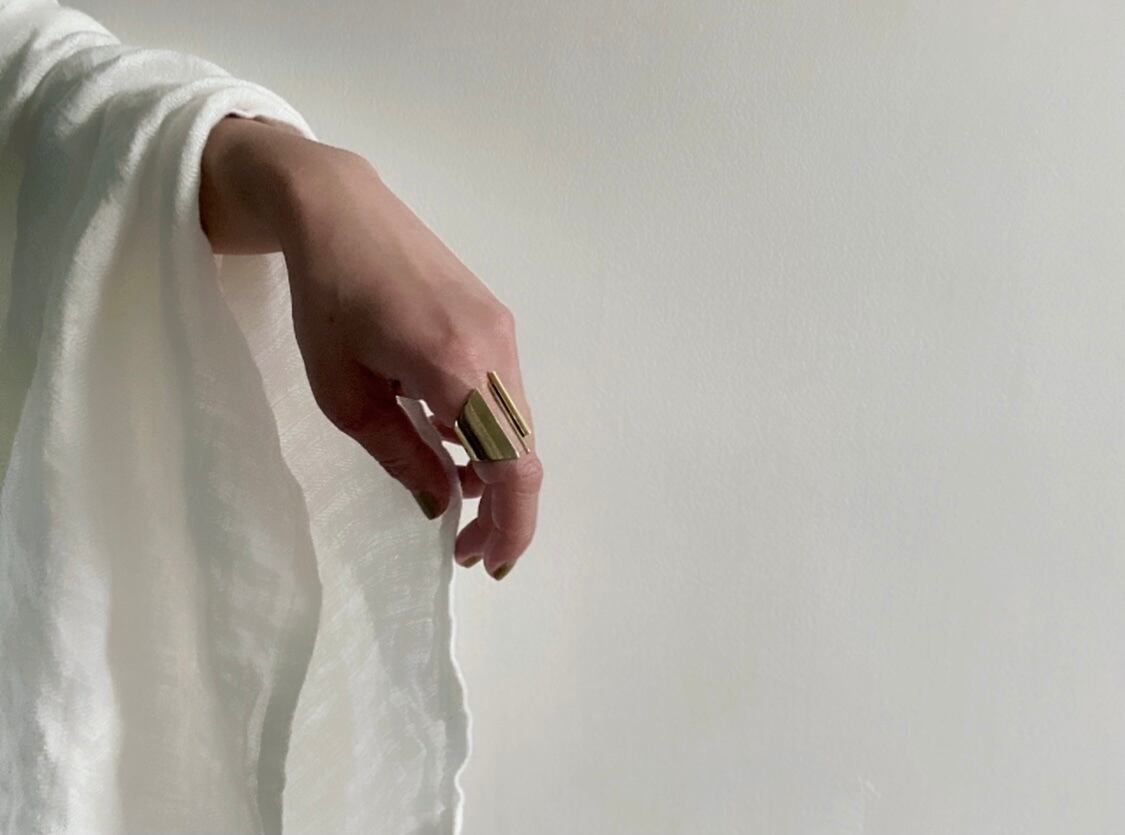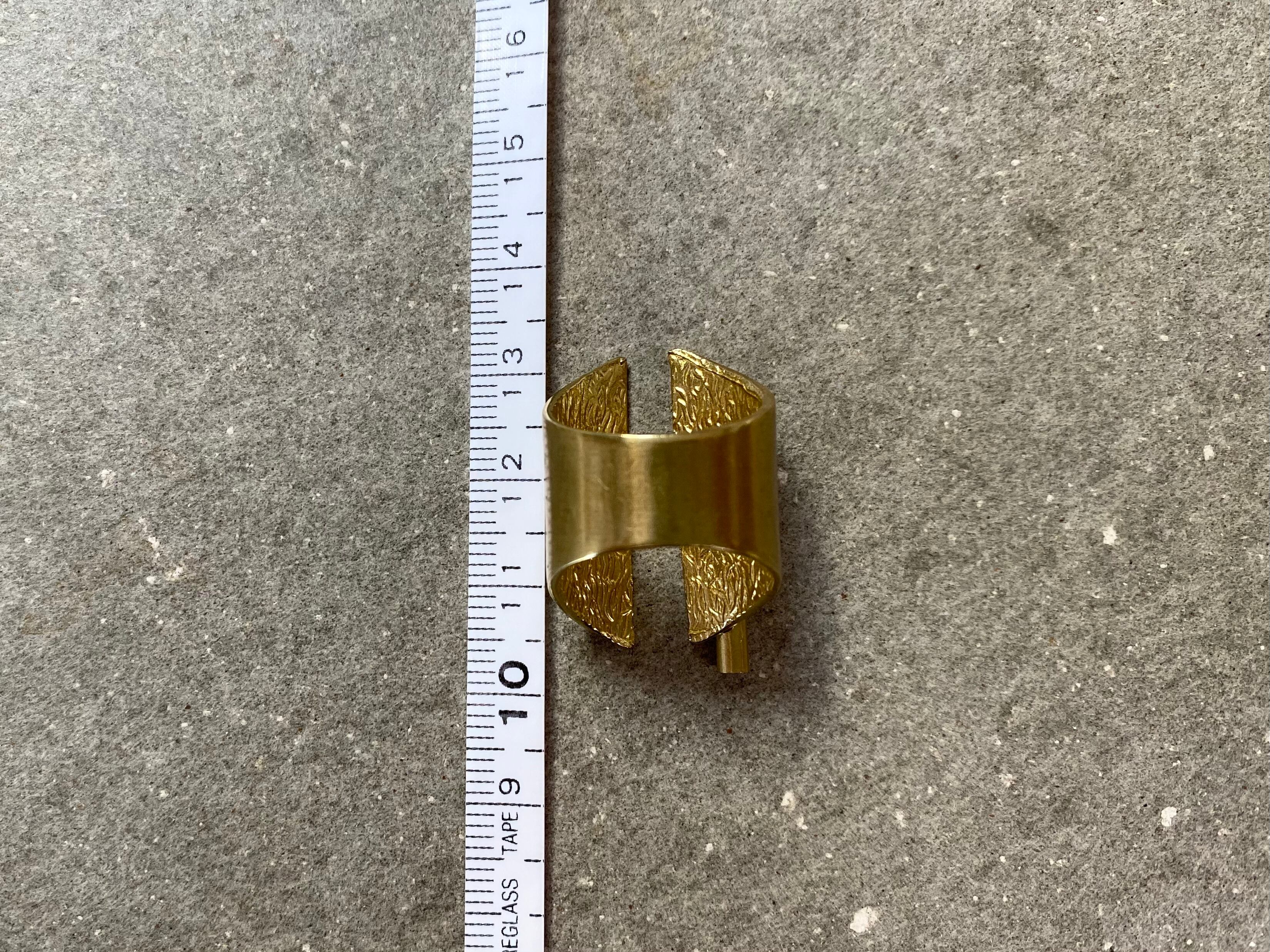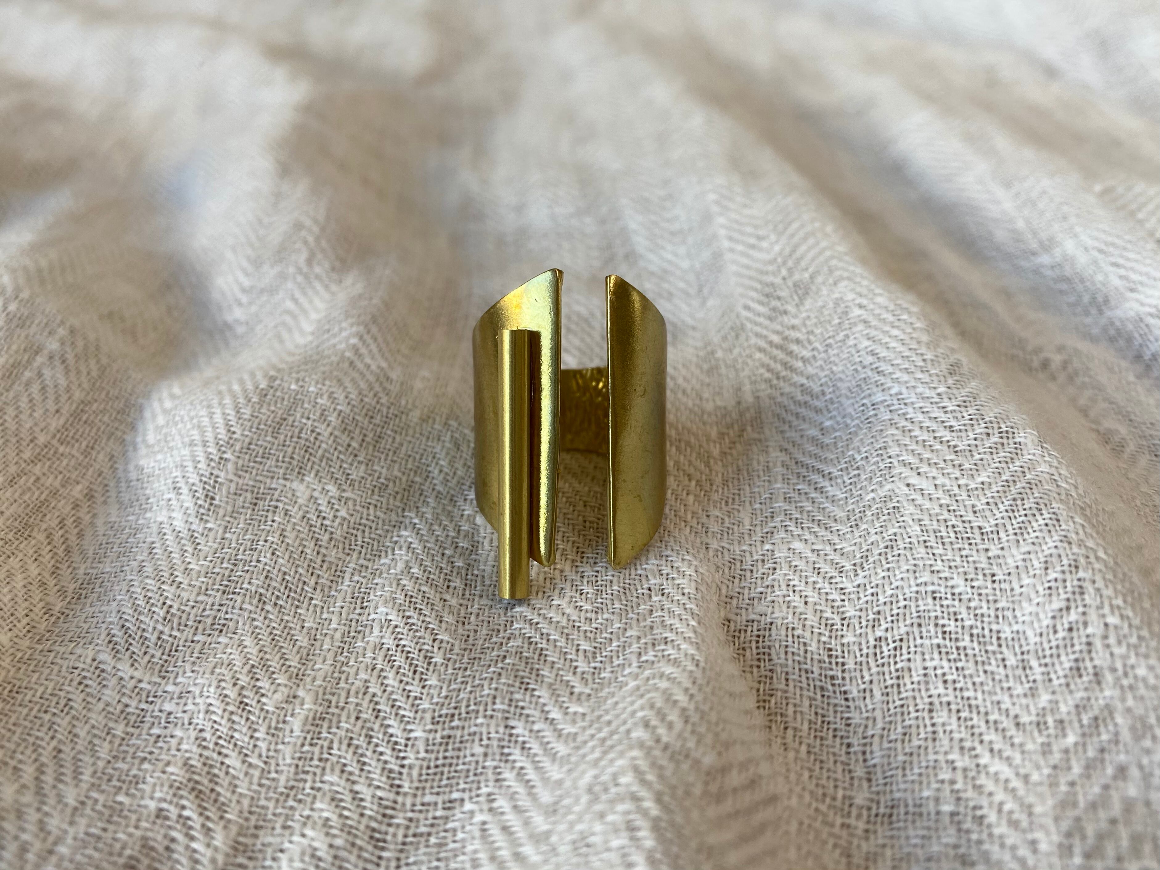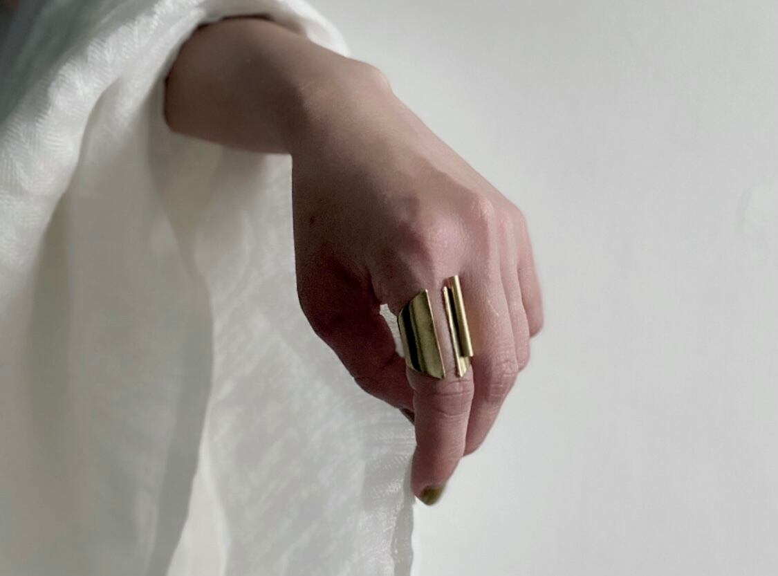 シンプルなデザインですが、スリットの入った太めのリングや、真鍮バーに個性が感じられる一品です。