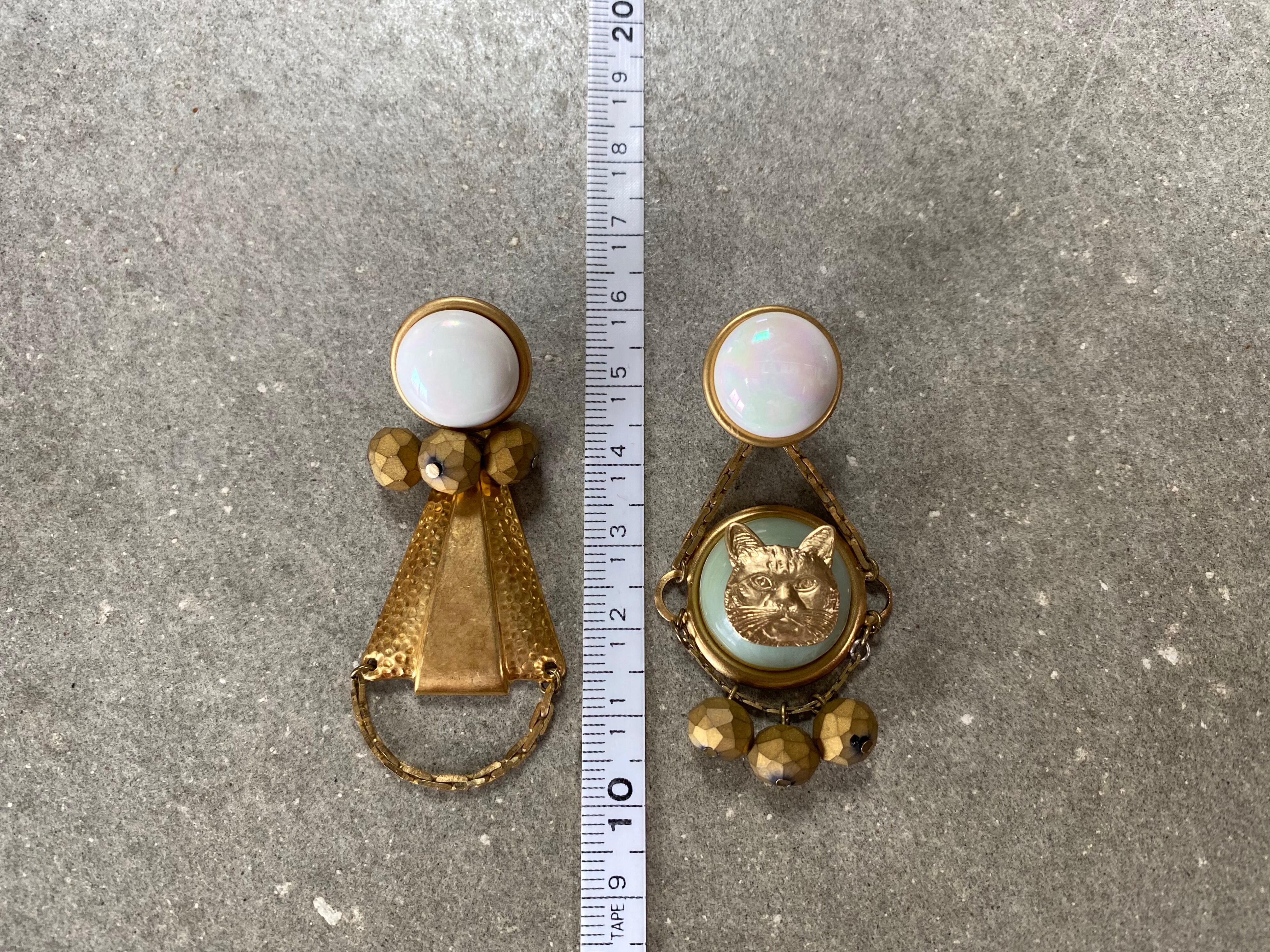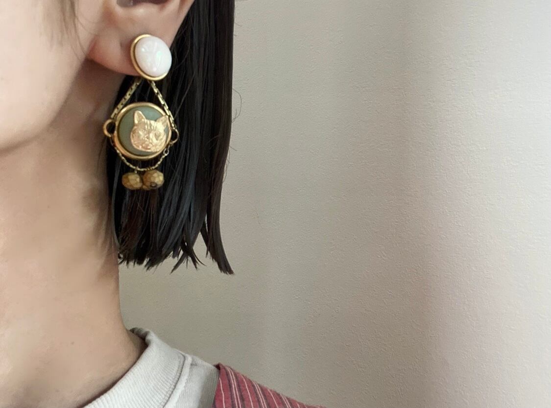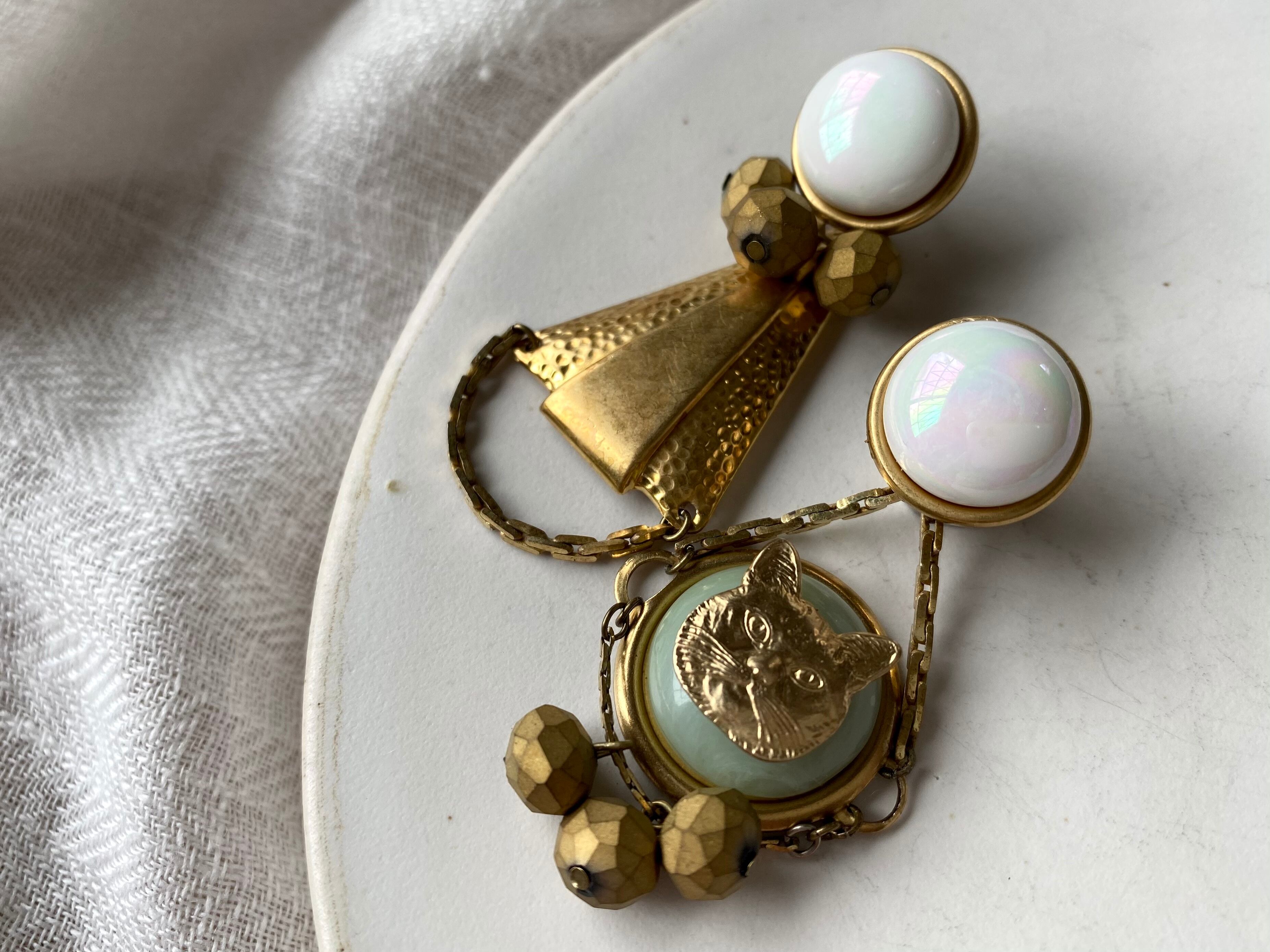 淡い翡翠色のカボションに真鍮のネコを置いたり、インパクトのあるトライアングルパーツを添えたりと遊び心満載ですが、艶やかな偏光色を纏ったミリアムハスケルのガラスカボションが、全体を柔らかく上品にまとめています。