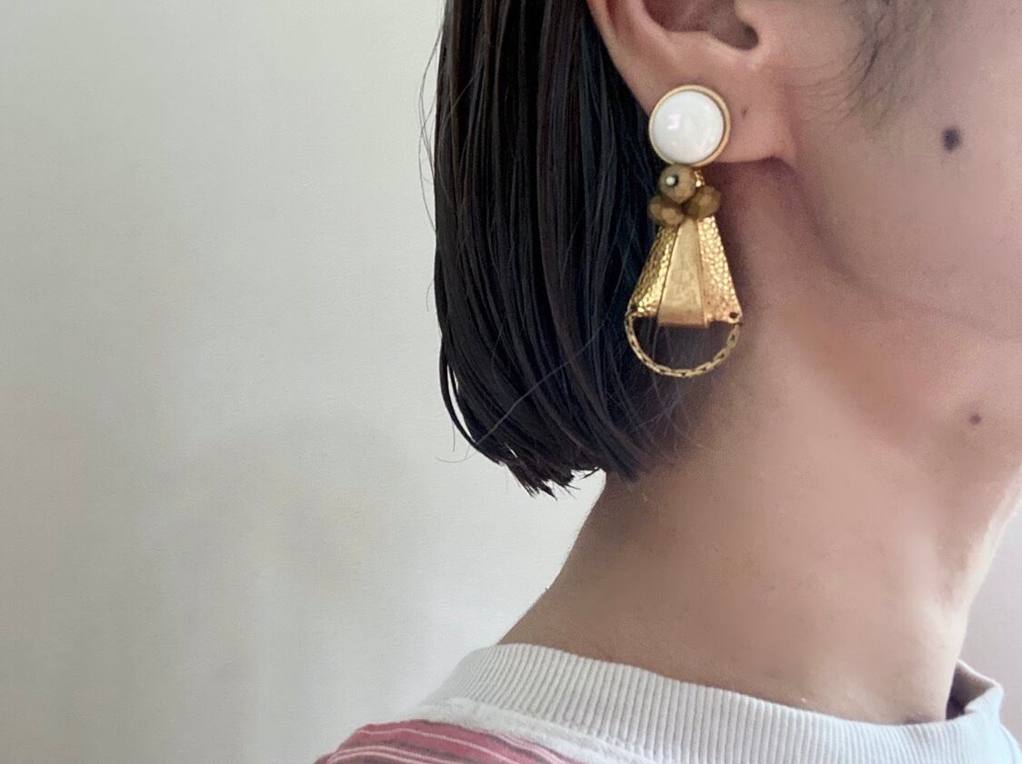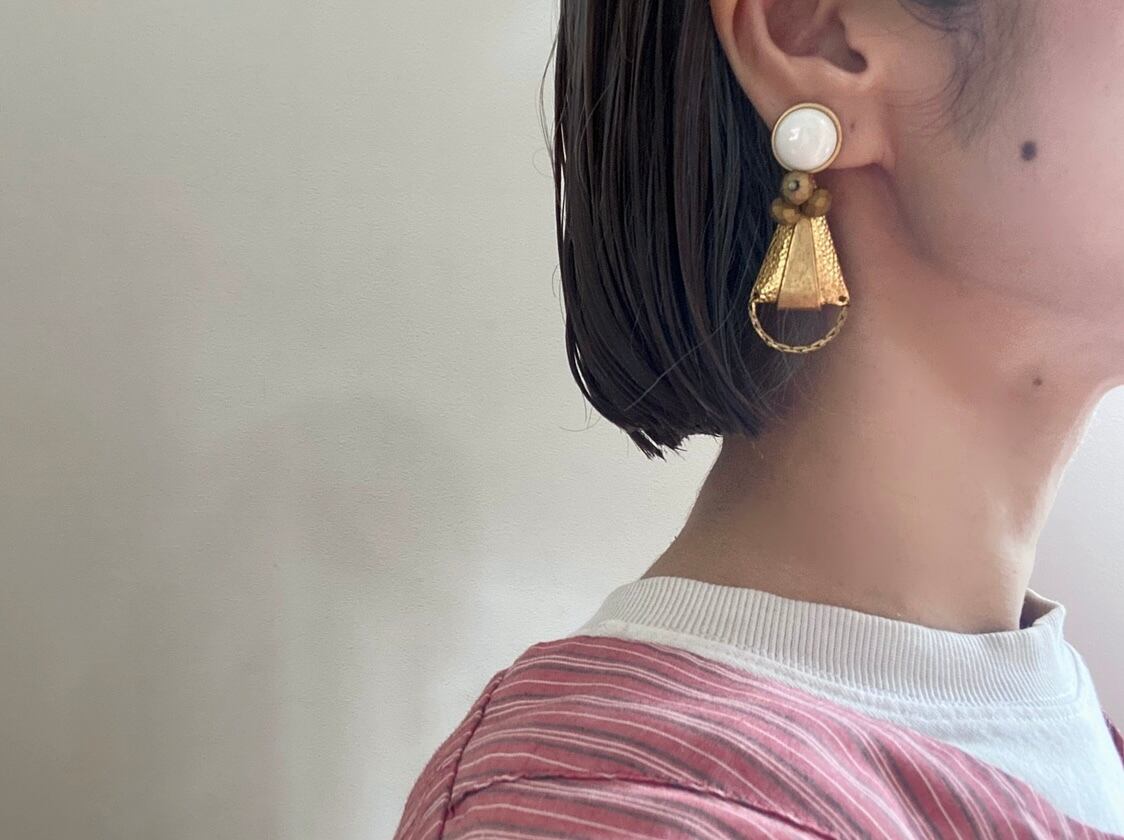 ヴィンテージパーツを組み合わせて、アシンメトリーなピアスを作りました。