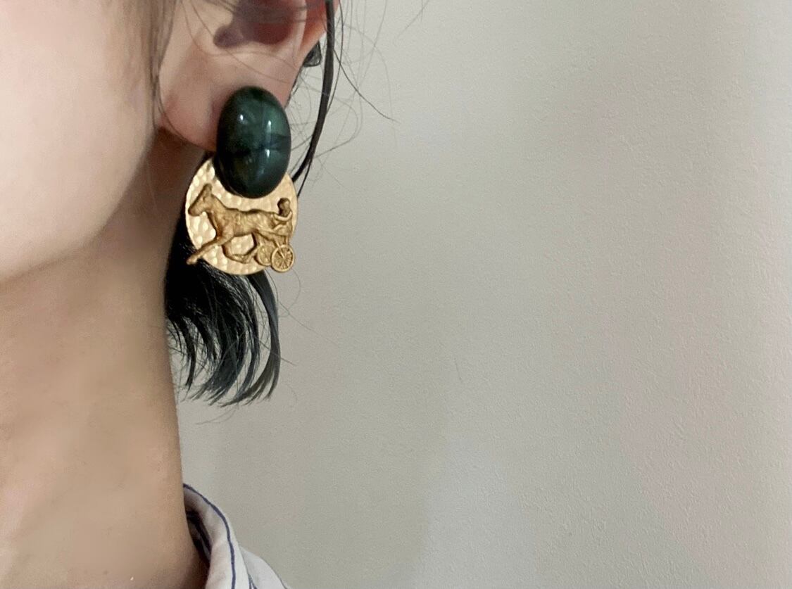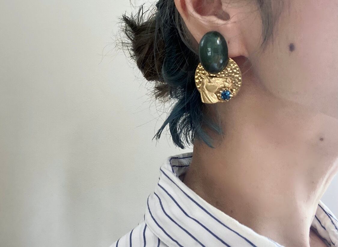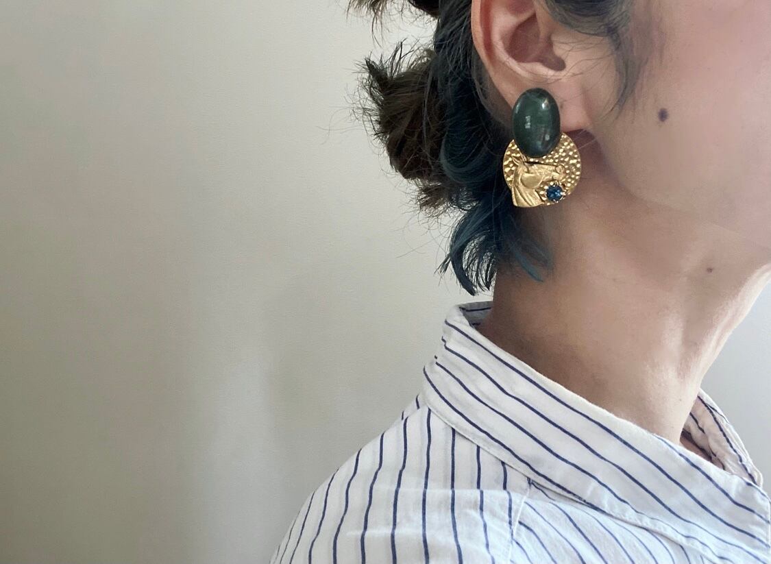 うっすらとゴールドのマーブルが入ったオリーブグリーンのカボションに、真鍮パーツが良く合います。