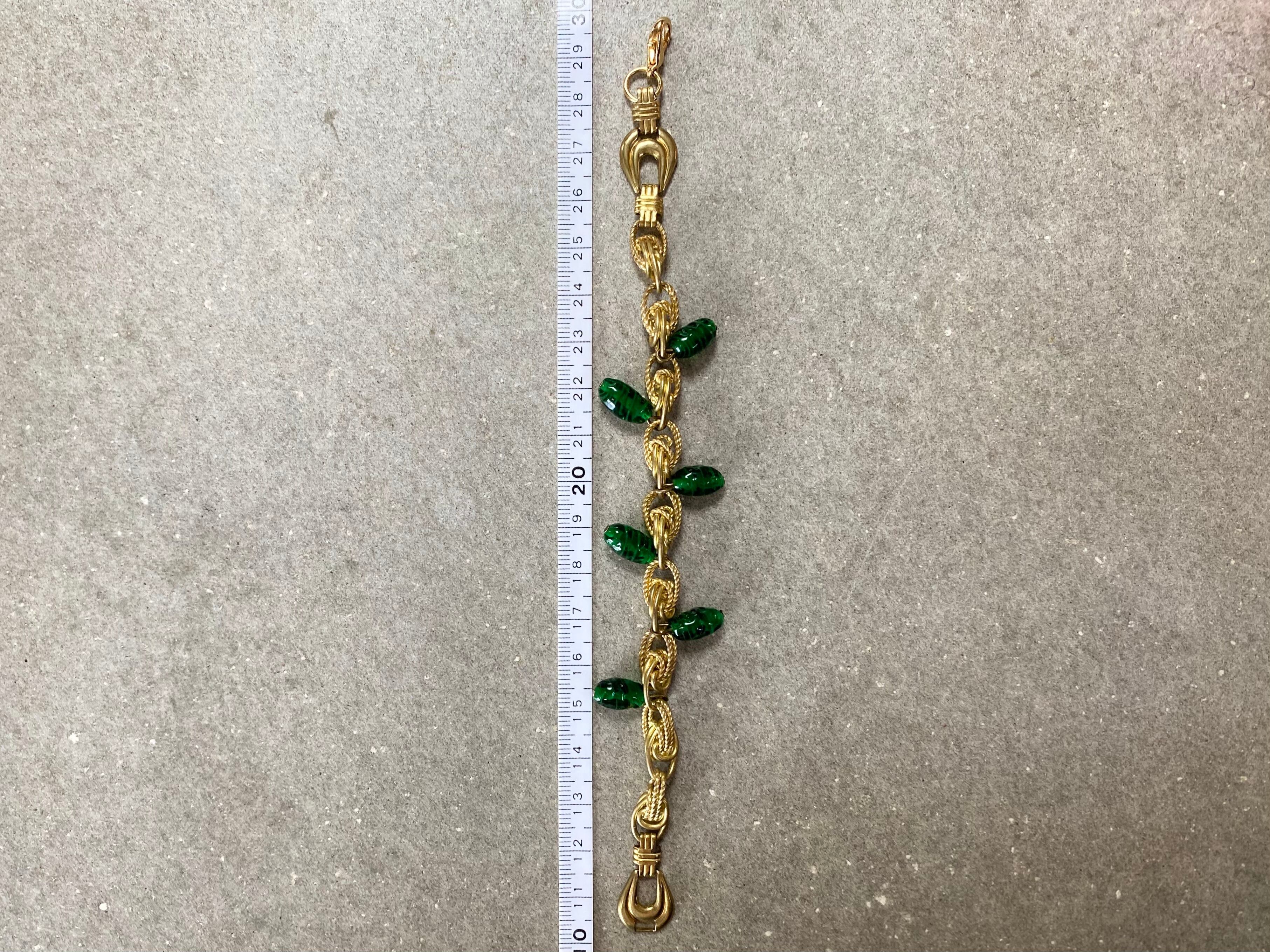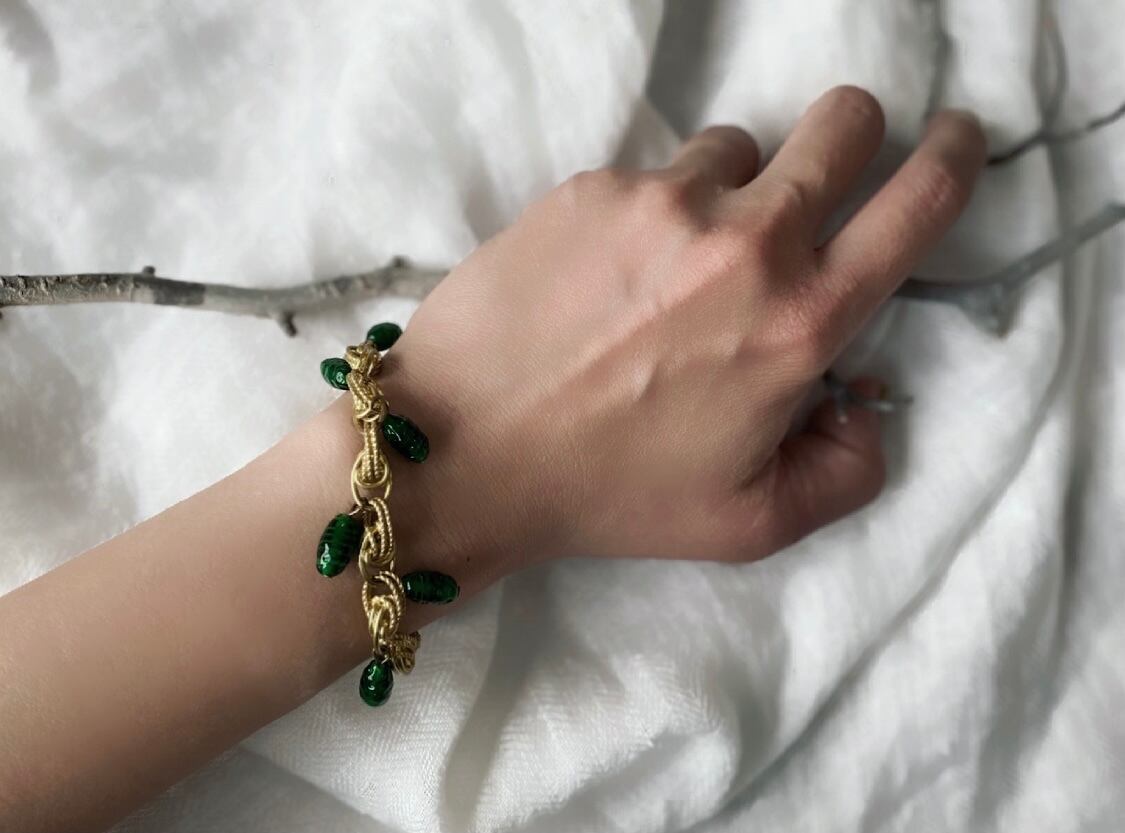 デザイン性の高い真鍮のチェーンに、美しく印象的なグリーンのジャパンヴィンテージガラスが添えられています。