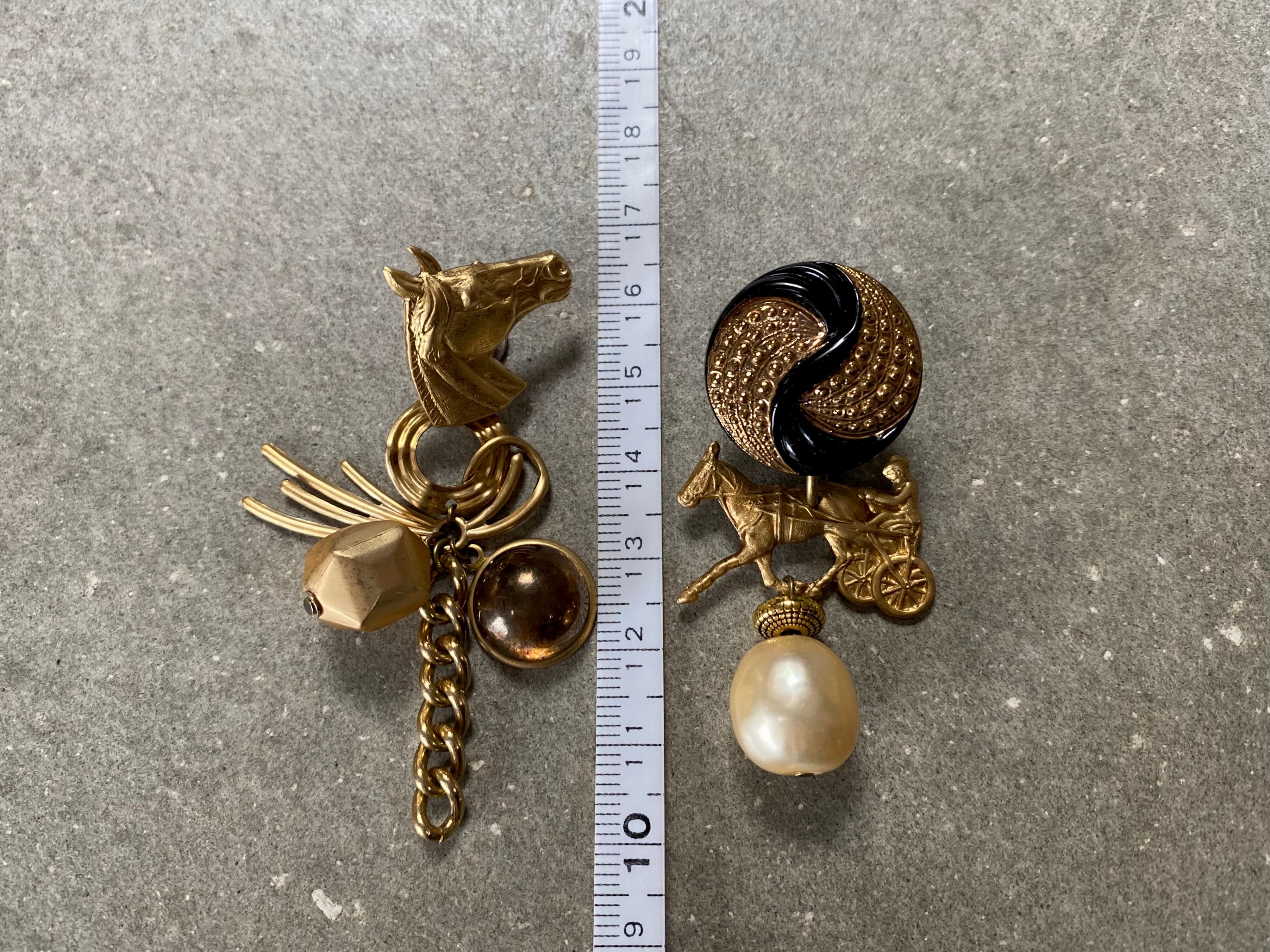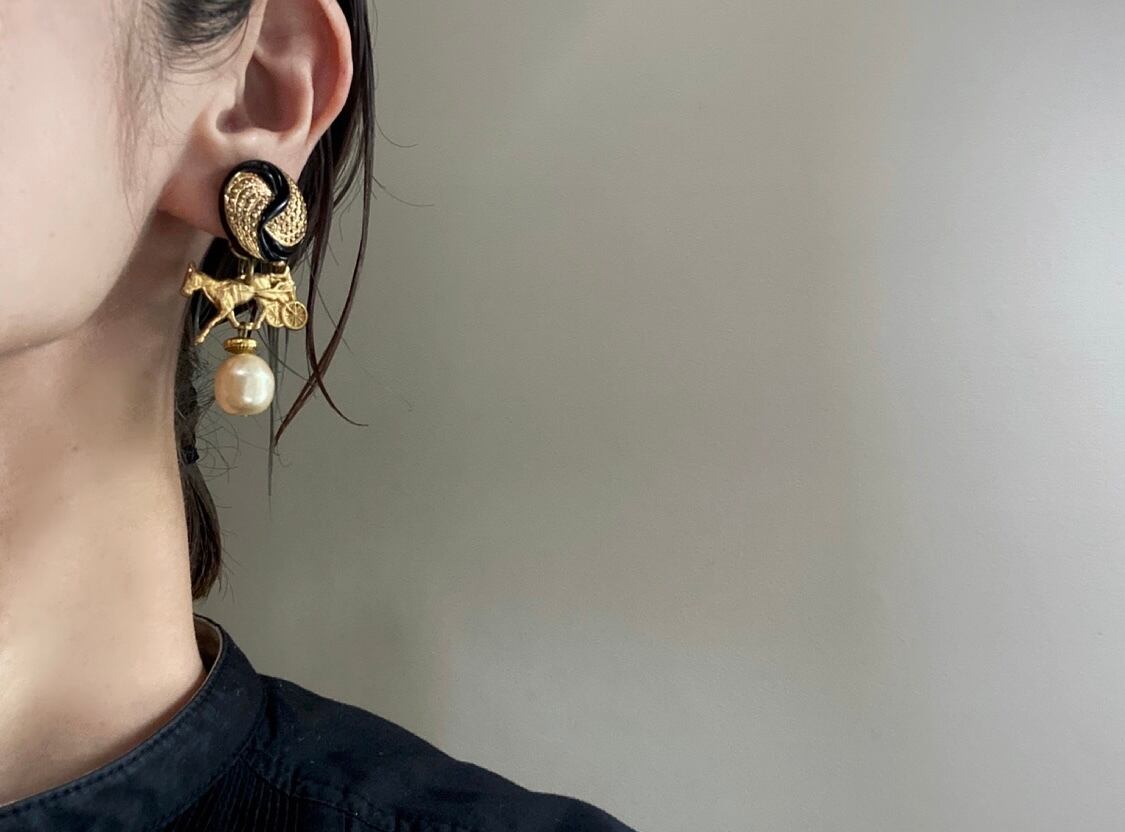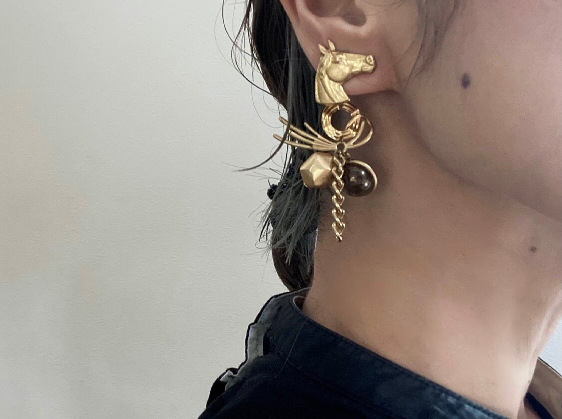 個性的なヴィンテージボタンに負けない馬のモチーフを合わせ、アバンギャルドなデザインの中に、パールやシックなヴィンテージガラスなどを添えて上品に仕上げました。
