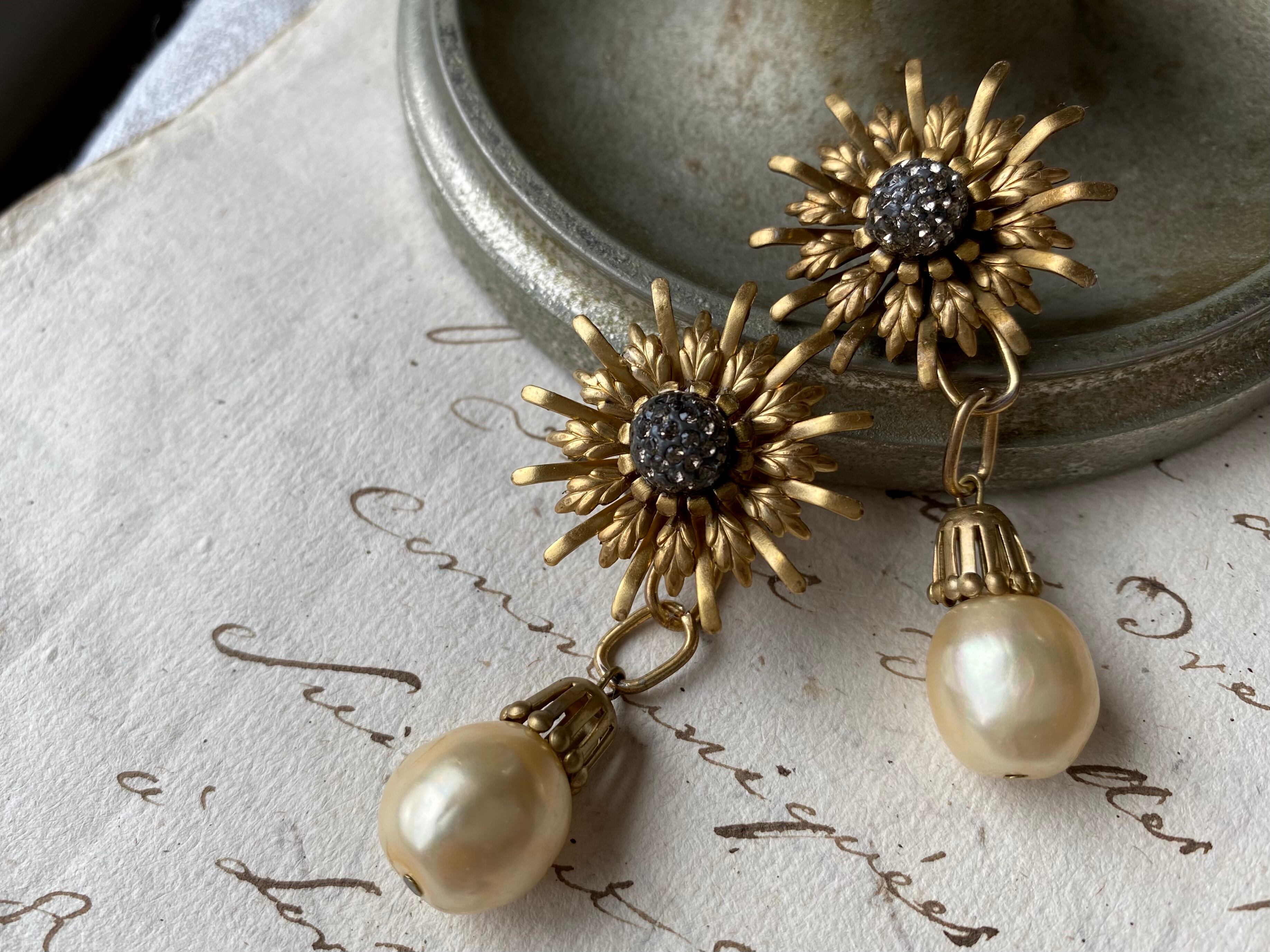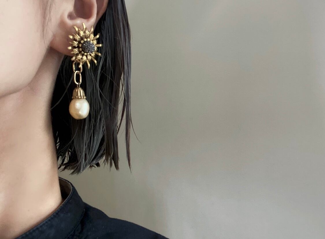 個性的なボタニカルパーツやキラキラと光ラインストーンビーズ、まろやかなヴィンテージガラスパールと、上品で華やかなパーツが詰め込まれています。