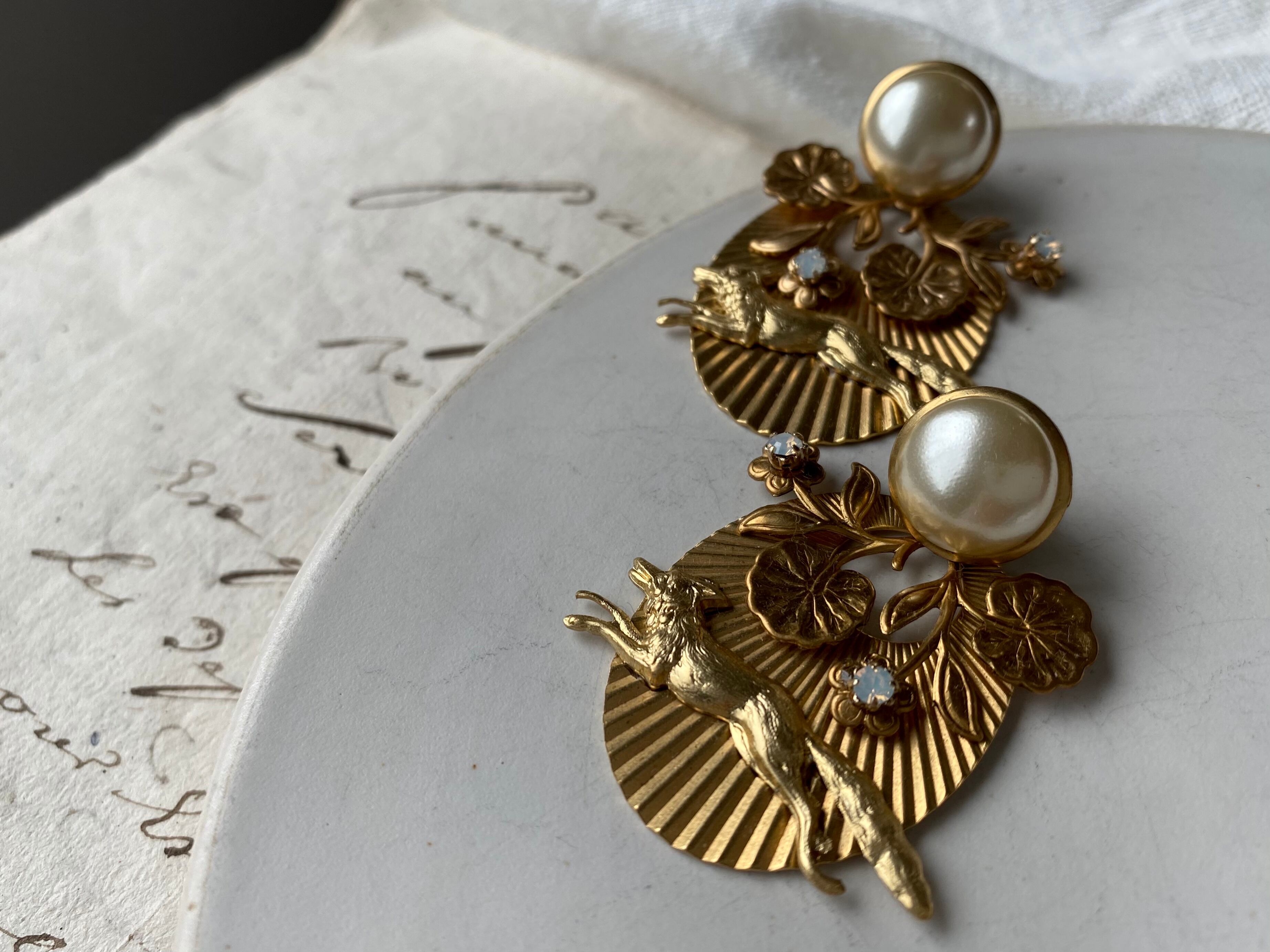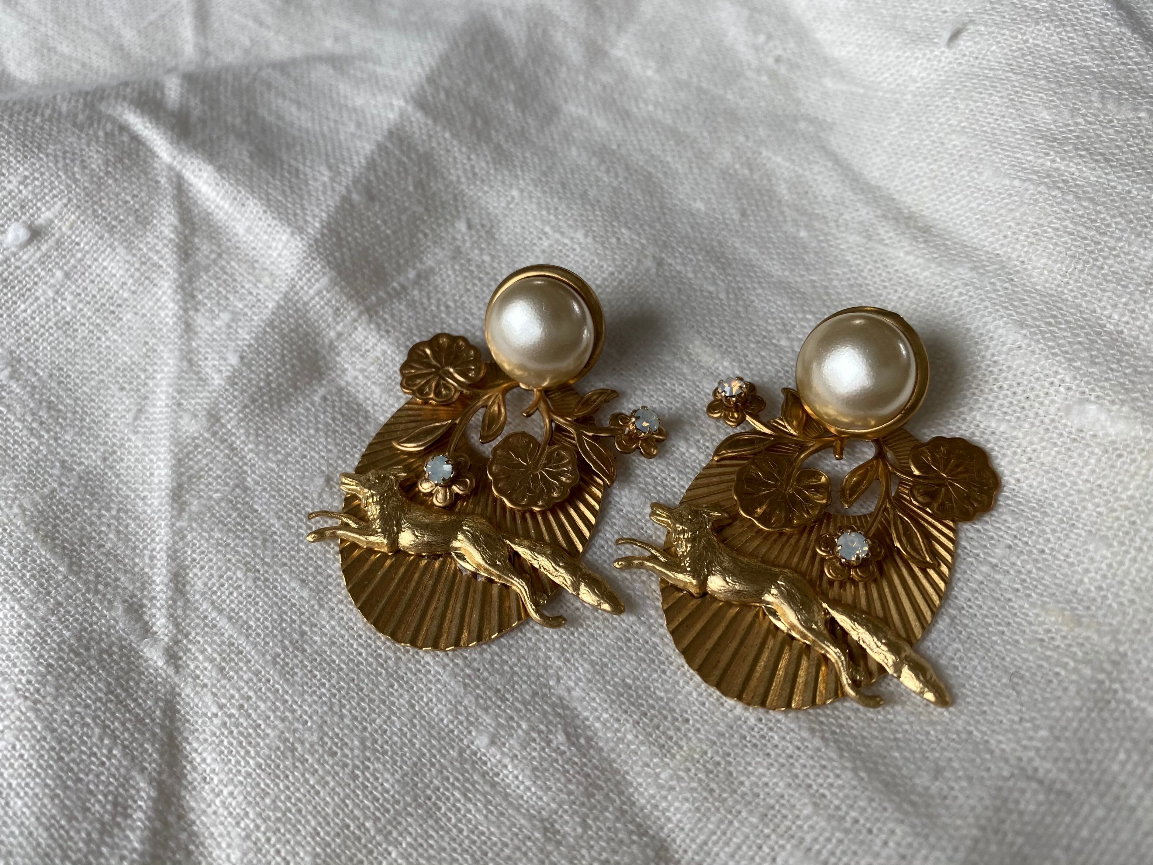 ガラスパールやオパールカラーのスワロフスキーが繊細で柔らかな雰囲気ですが、キツネモチーフなどの個性的な真鍮パーツに大人の遊び心が感じられます。
