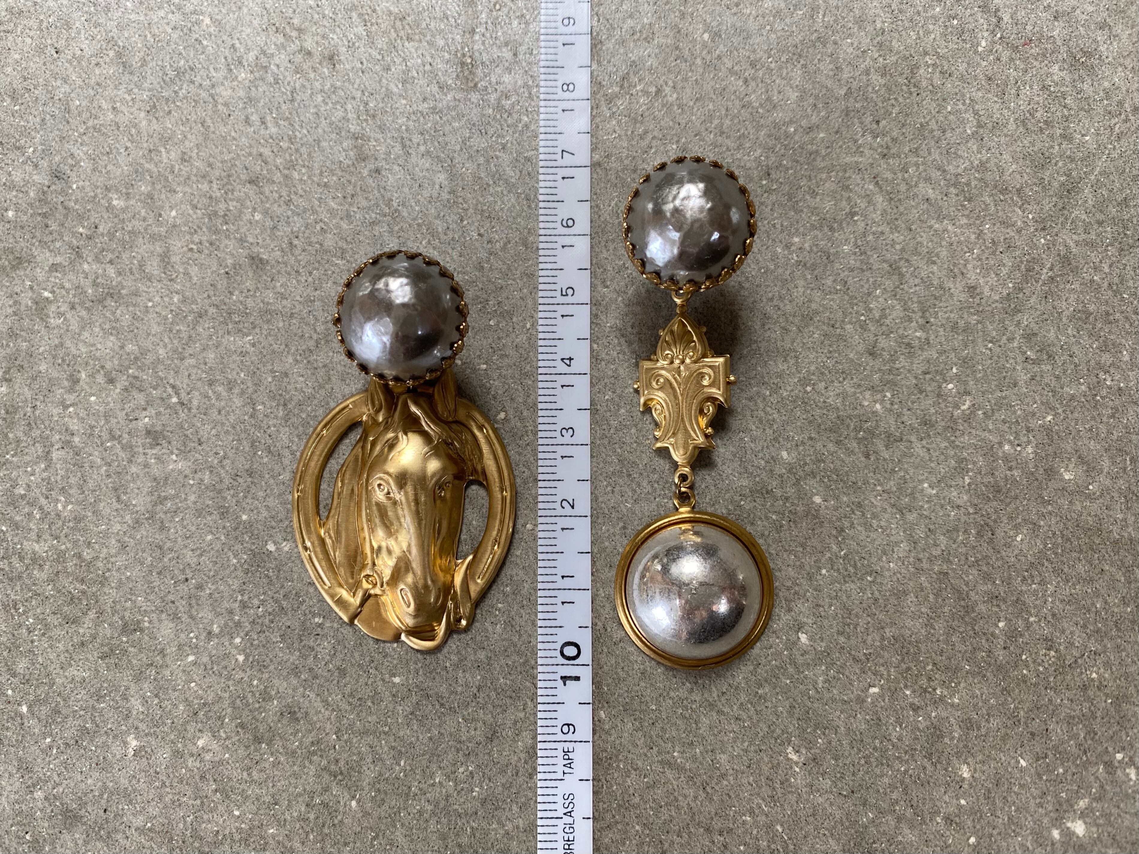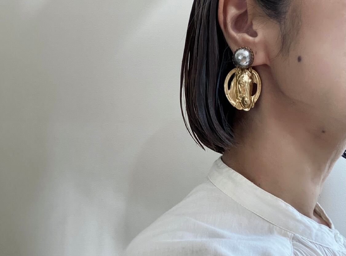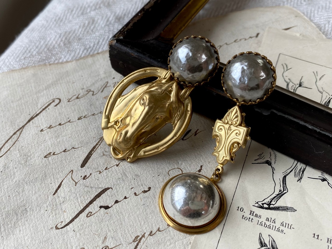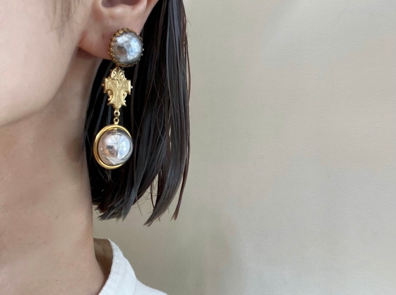 ヴィンテージパーツを組み合わせてアシンメトリーなピアスを作りました。