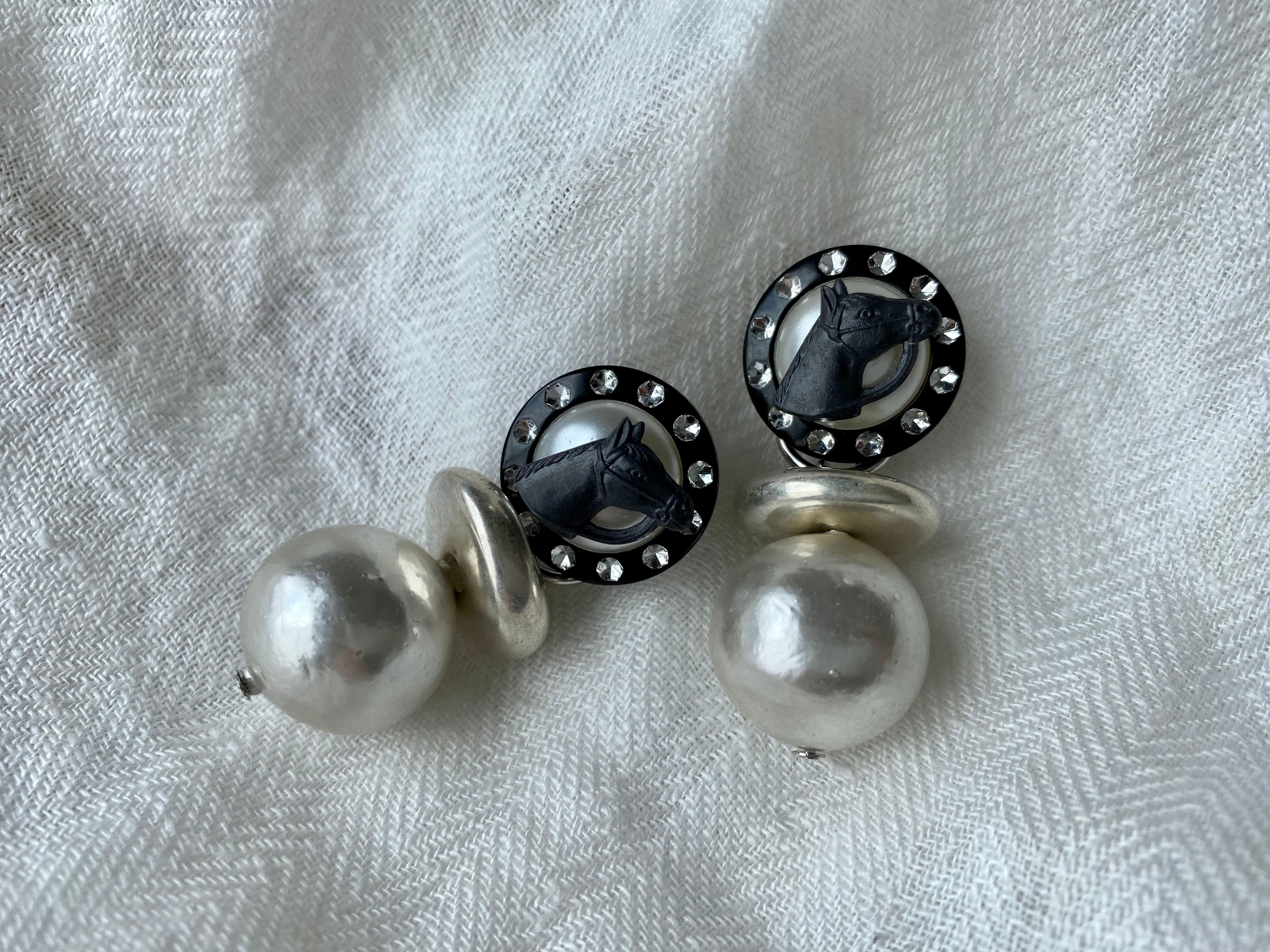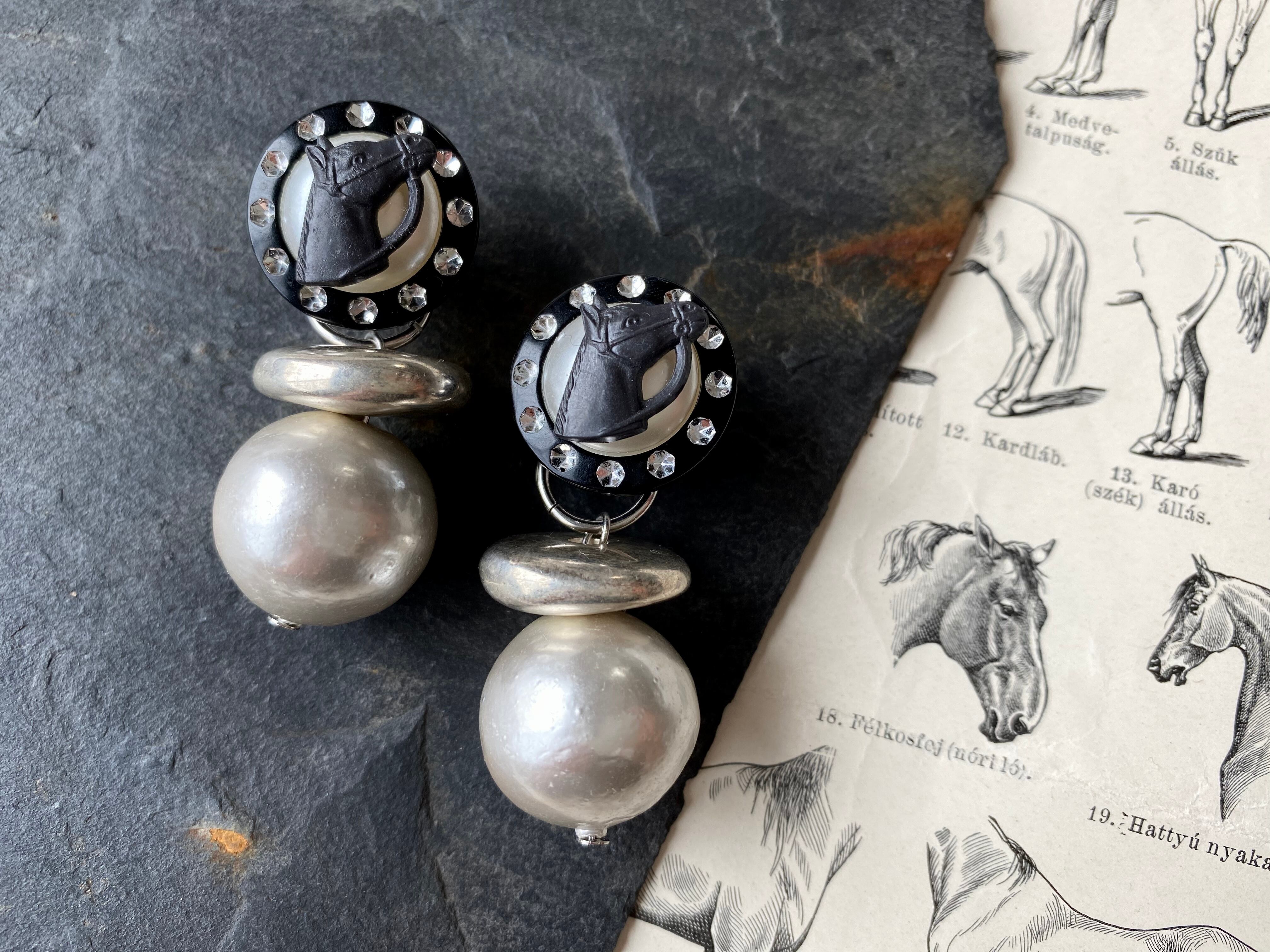 ドイツヴィンテージのシルバーカラーコットンパールがシックな雰囲気ですが、ラインストーンに縁取られたヴィンテージボタンの中央にホースヘッドを置いたり、ボリュームカンのあるスペーサーを挟んだりと、個性的な仕上がりです。