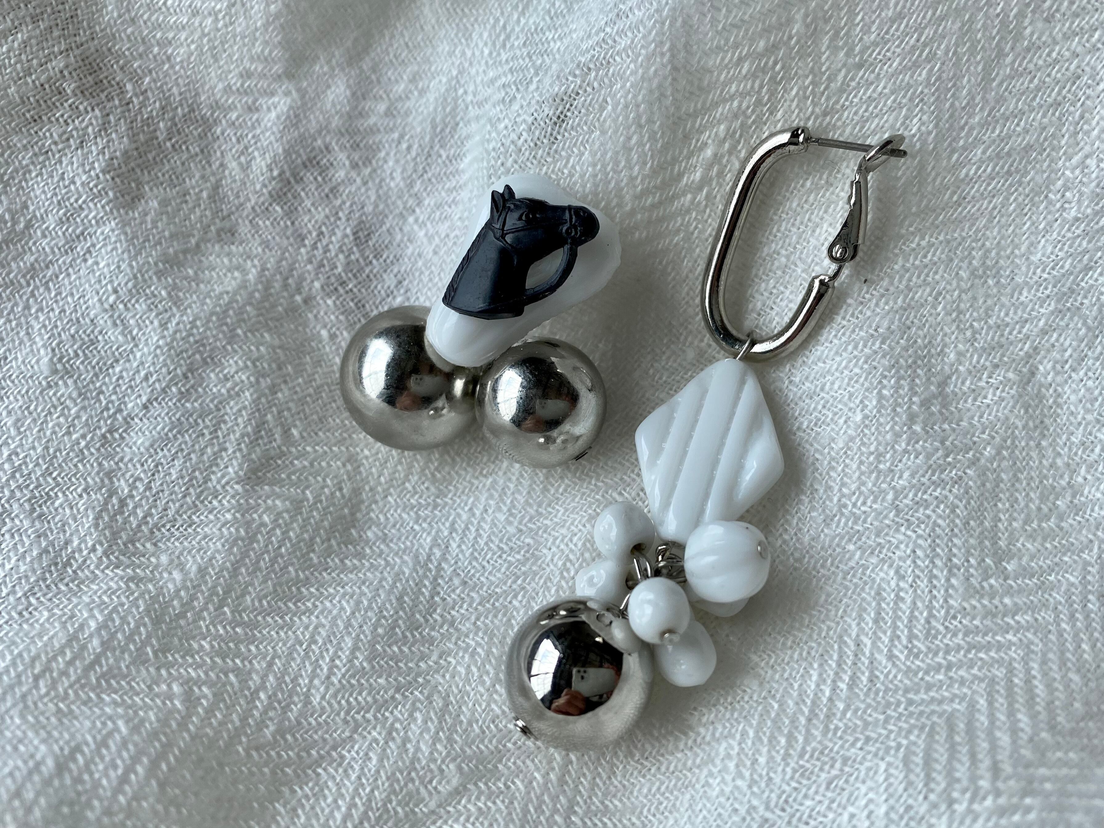 ヴィンテージパーツを組み合わせてアシンメトリーなピアスを作りました。