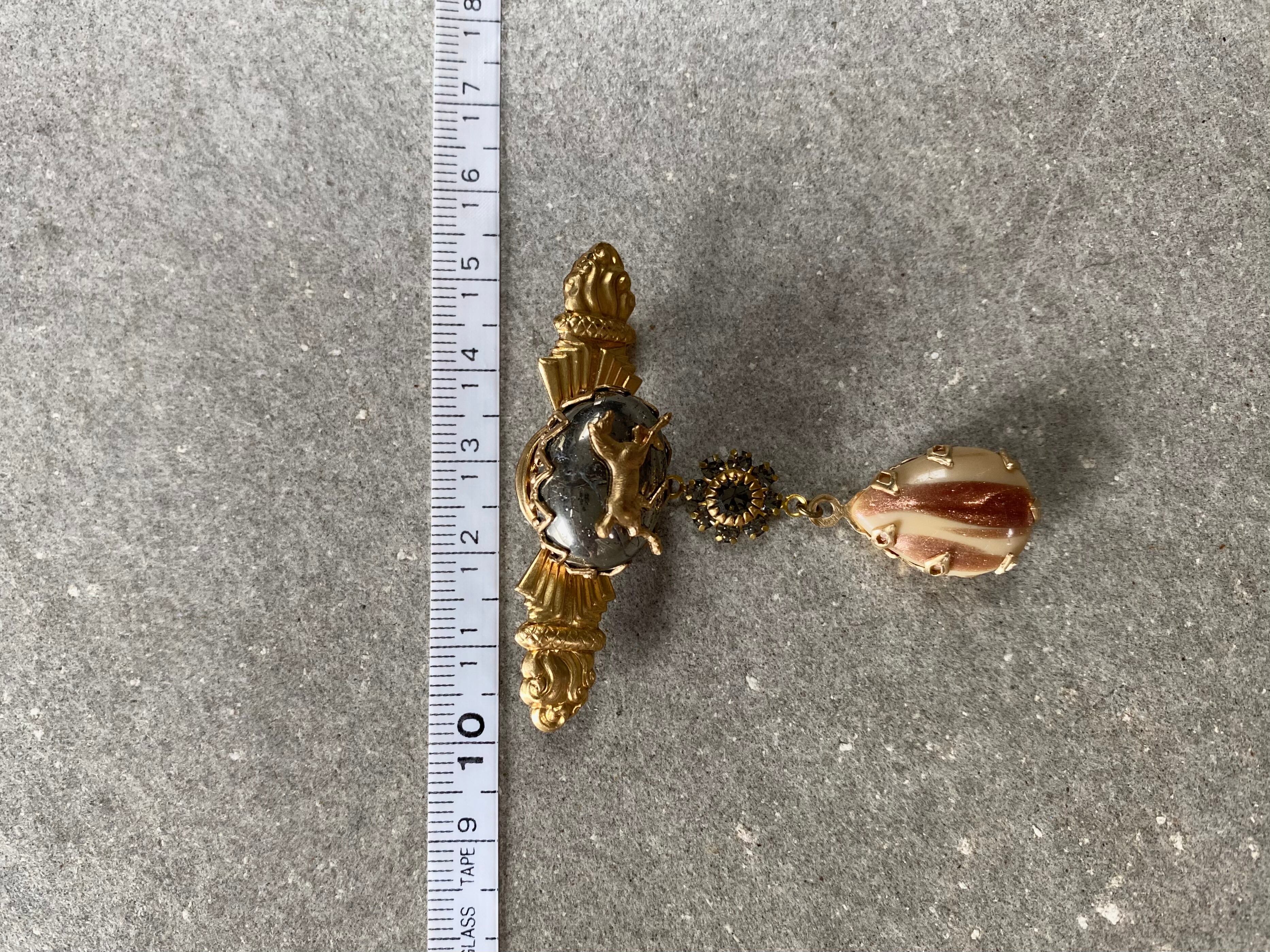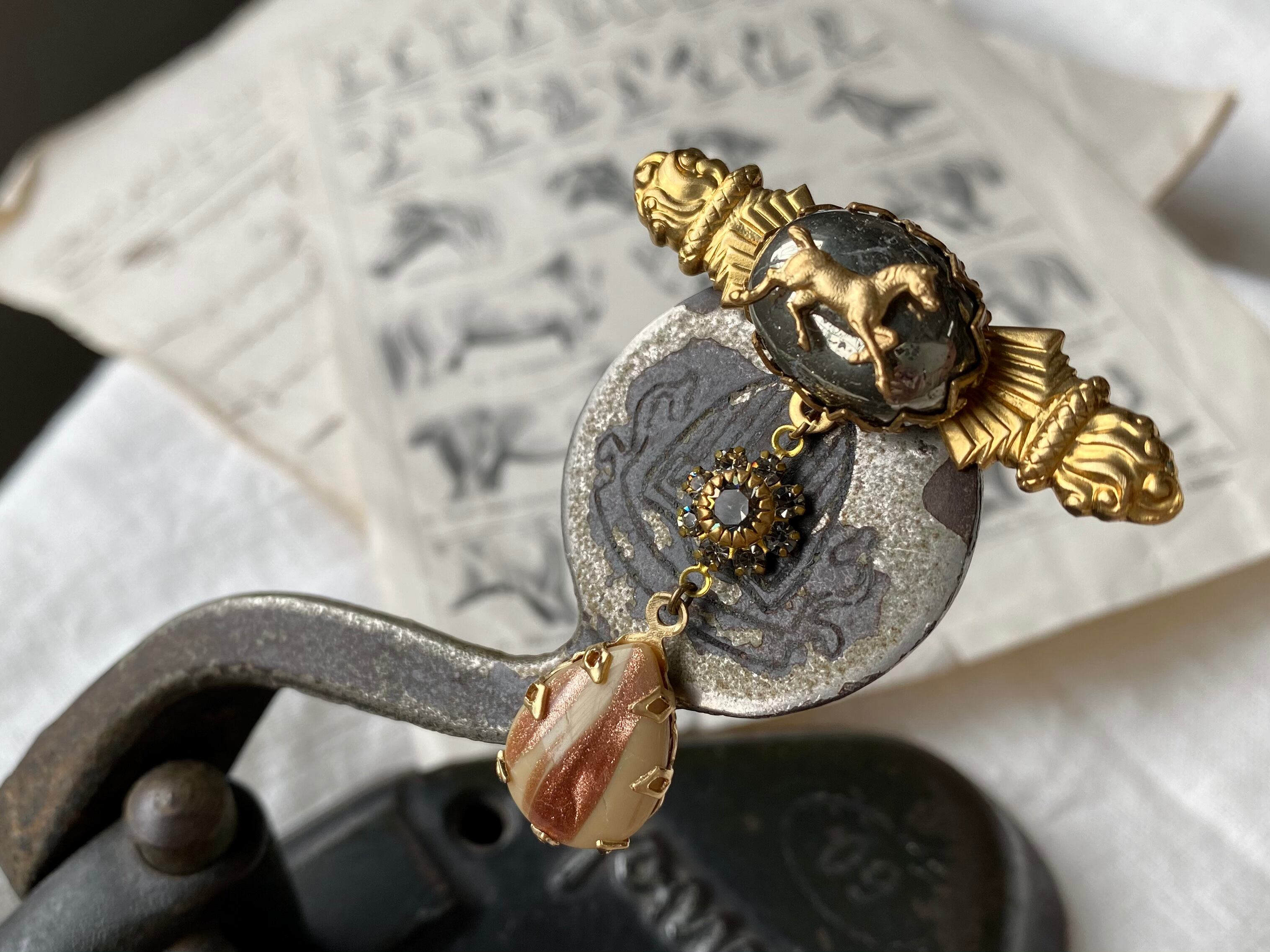 天然石やスワロフスキー、ヴィンテージガラスなど雰囲気のあるエッセンスをギュッと詰め込んだ、贅沢なブローチを作りました。