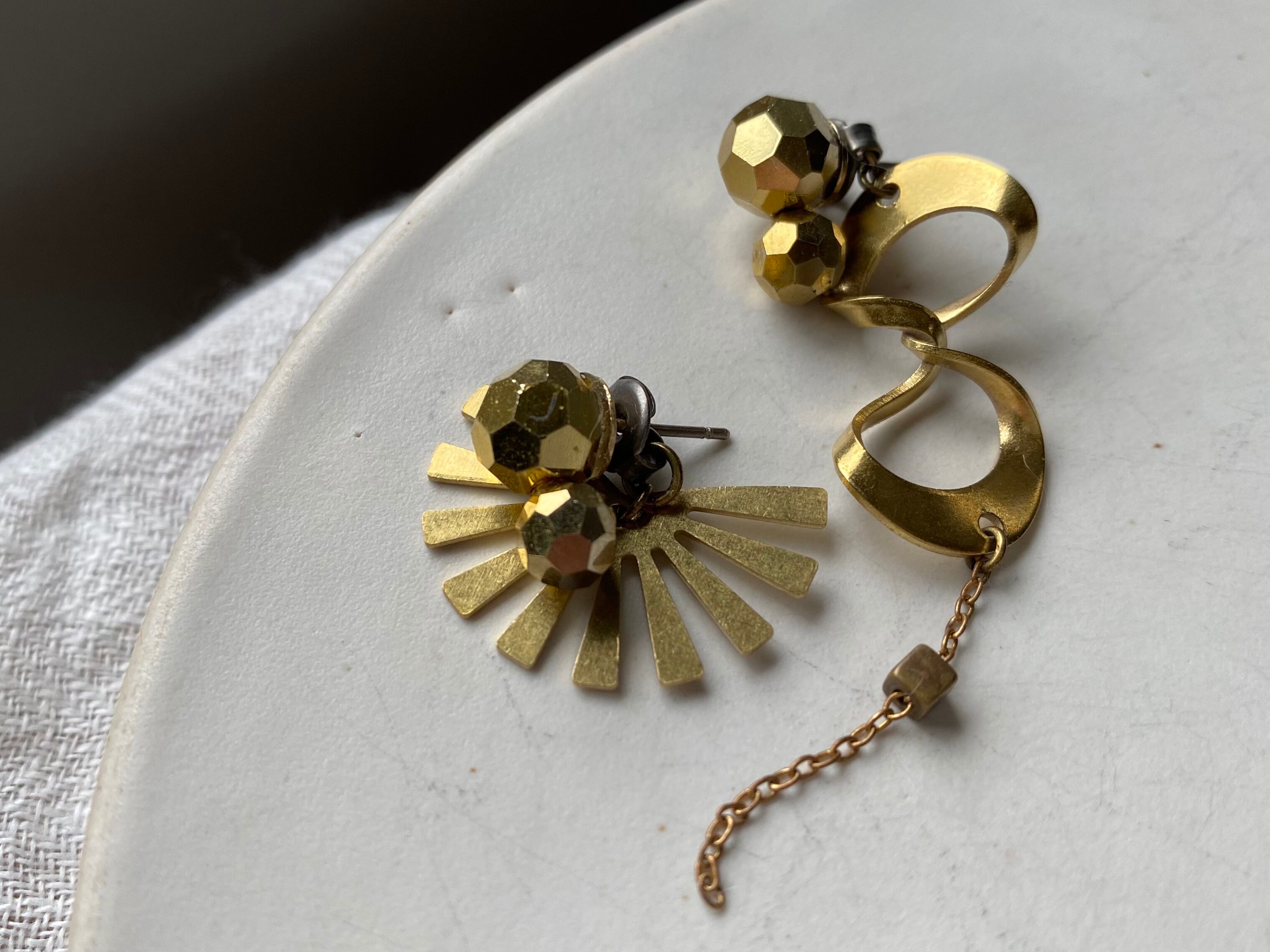 ヴィンテージパーツを組み合わせてアシンメトリーなピアスを作りました。