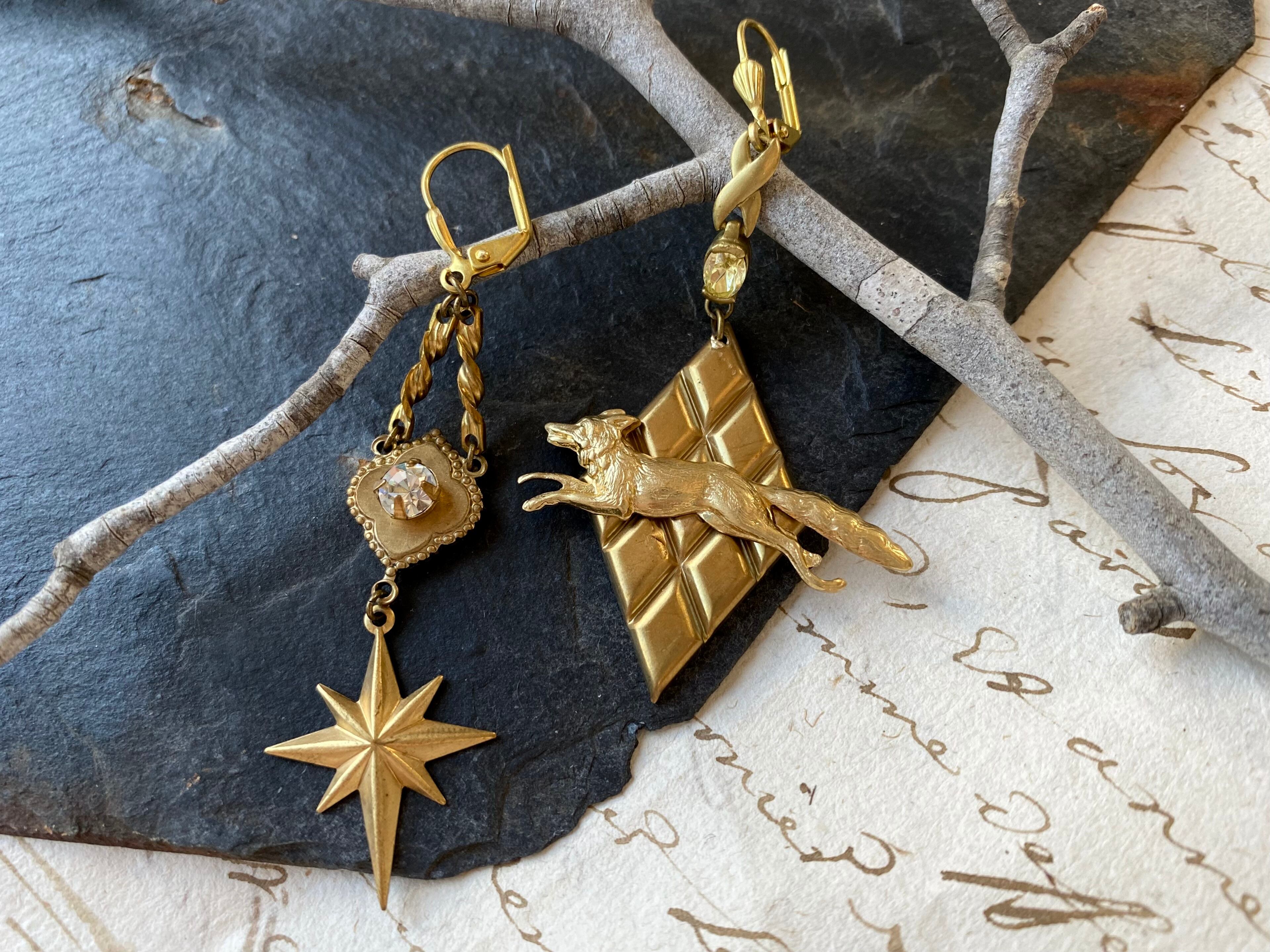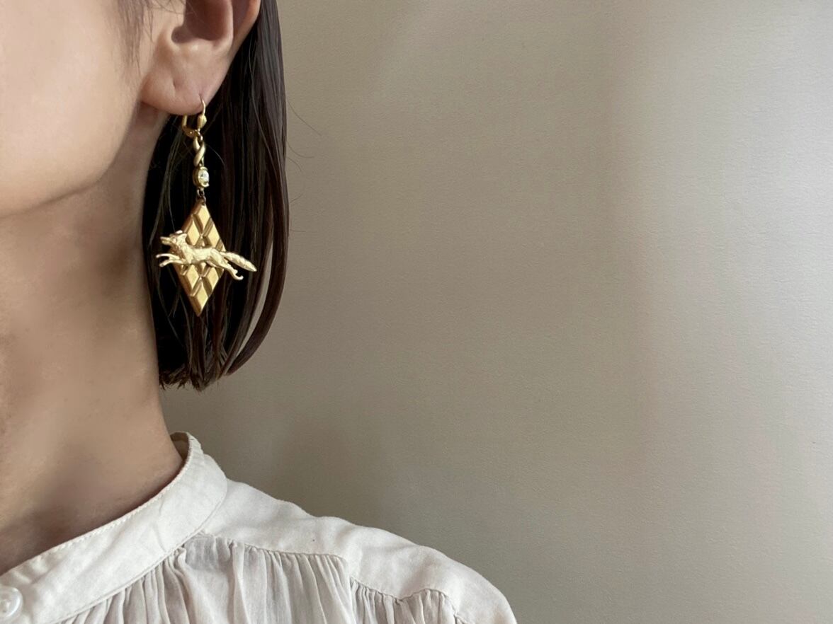 ヴィンテージパーツを組み合わせてアシンメトリーなピアスを作りました。
