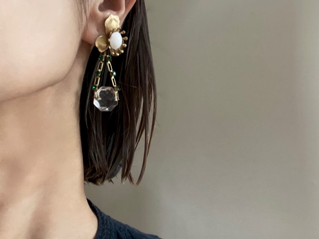真鍮のボタニカルパーツの中央につるりとしたガラスカボションを添え、清らかな雰囲気に仕上げました。
