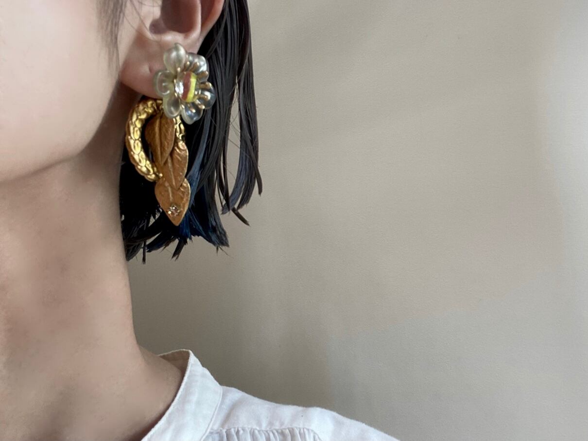 真鍮のボタニカルパーツを添えて、これからの季節にもピッタリなボリューム感のある仕上がりです。