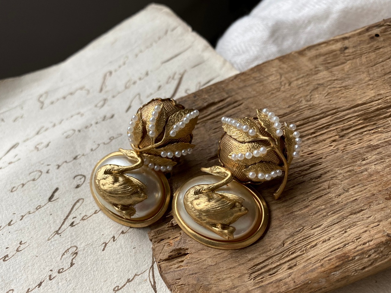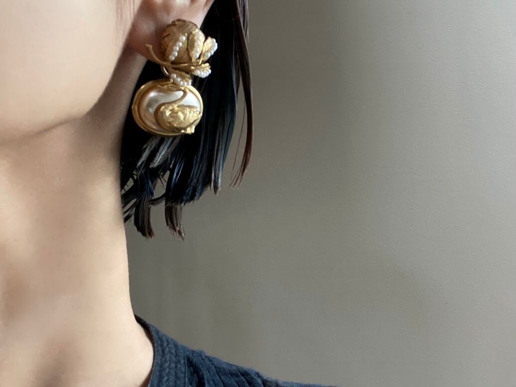ヴィンテージガラスパールには水鳥モチーフのパーツを乗せて、全体的に上品ながらも遊び心の感じられるデザインです。