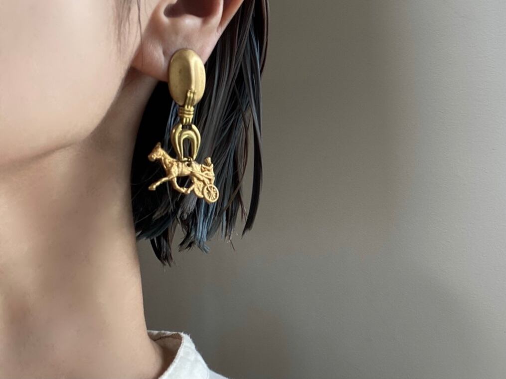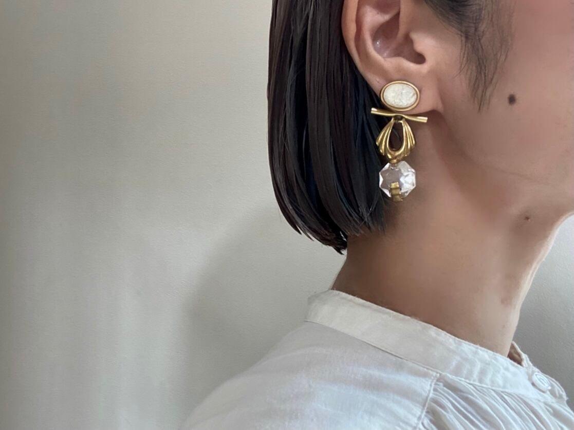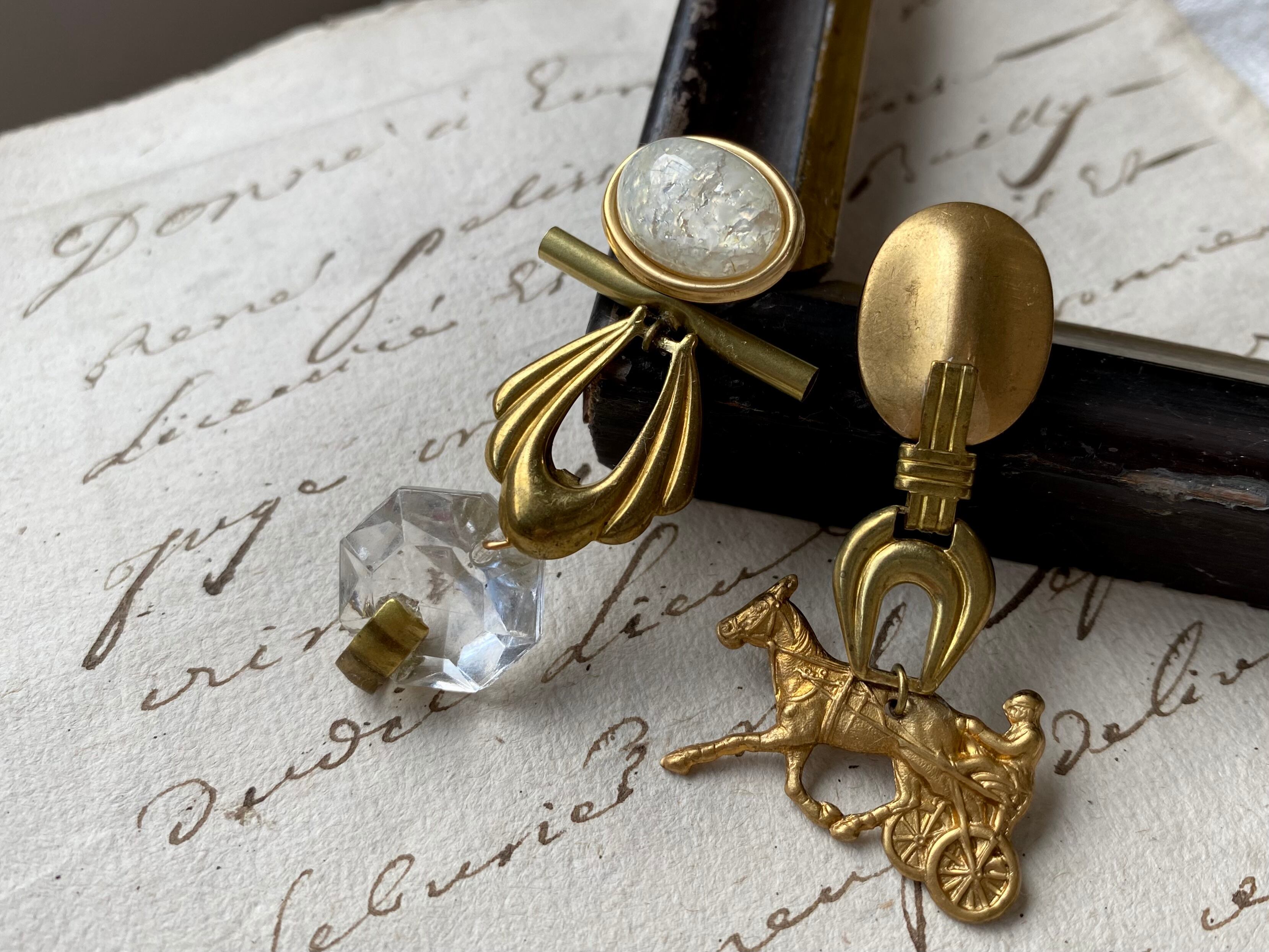 ヴィンテージパーツを組み合わせてアシンメトリーなピアスを作りました。