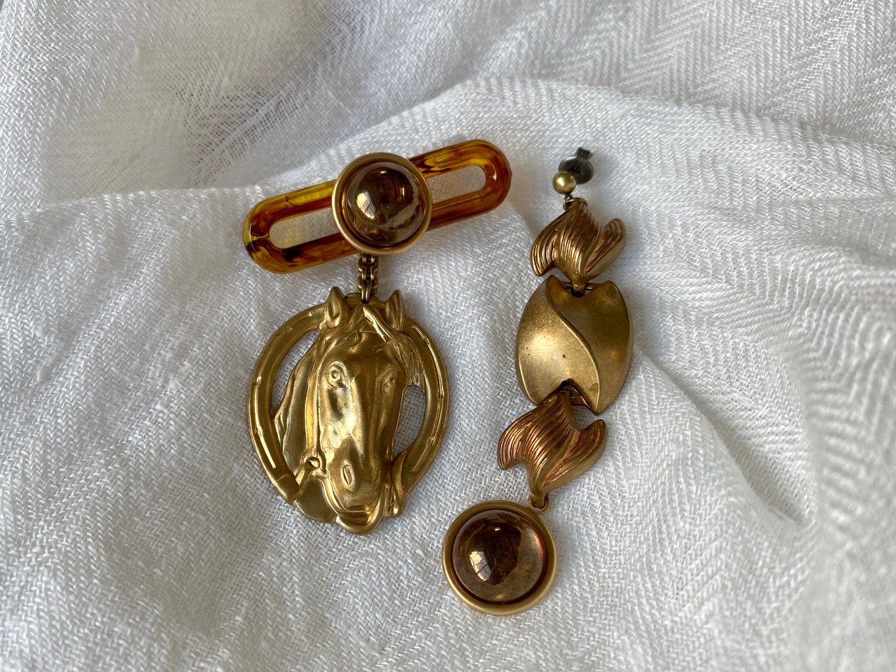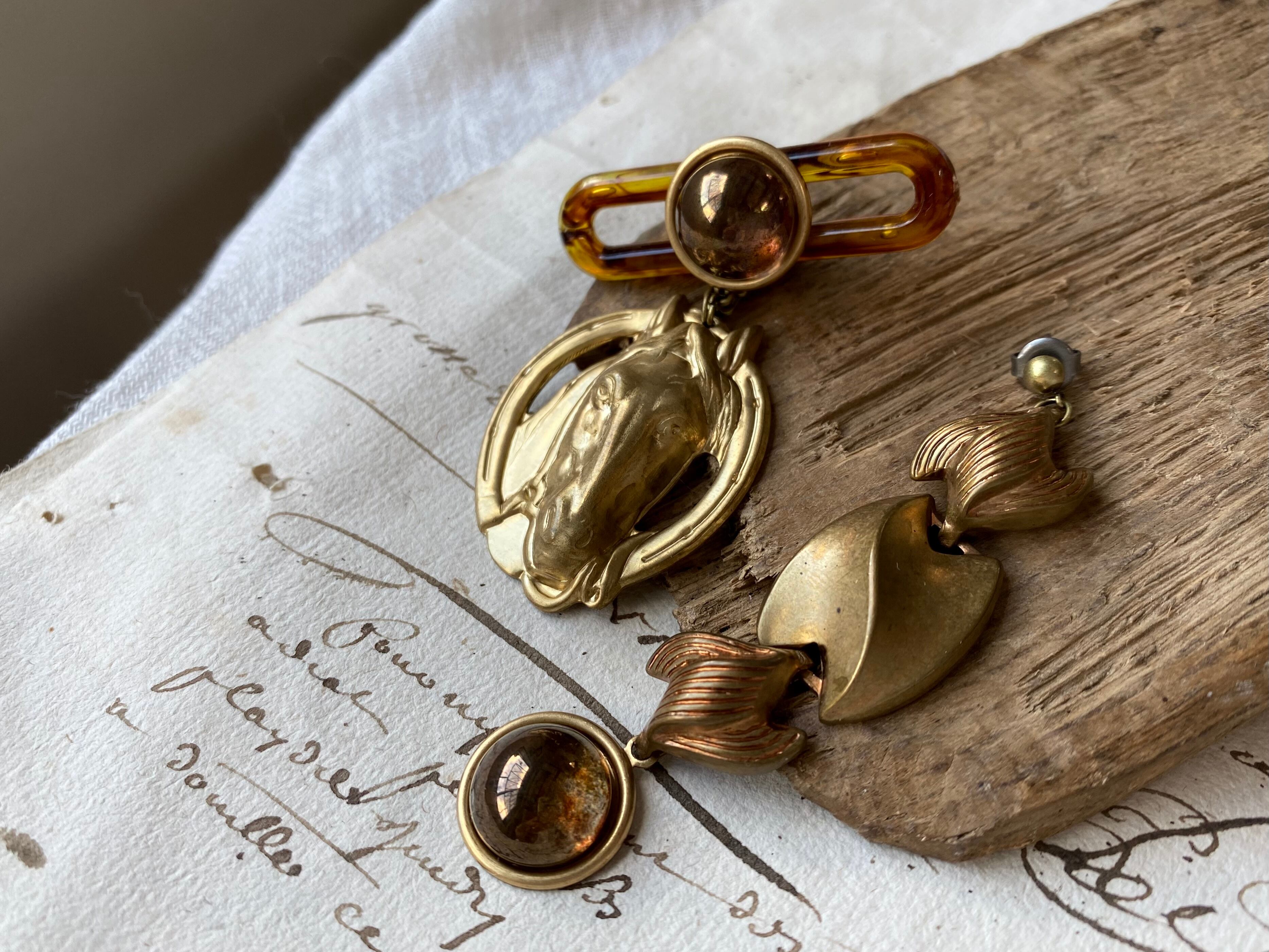 ヴィンテージパーツを使用して、アシンメトリーなピアスを作りました。