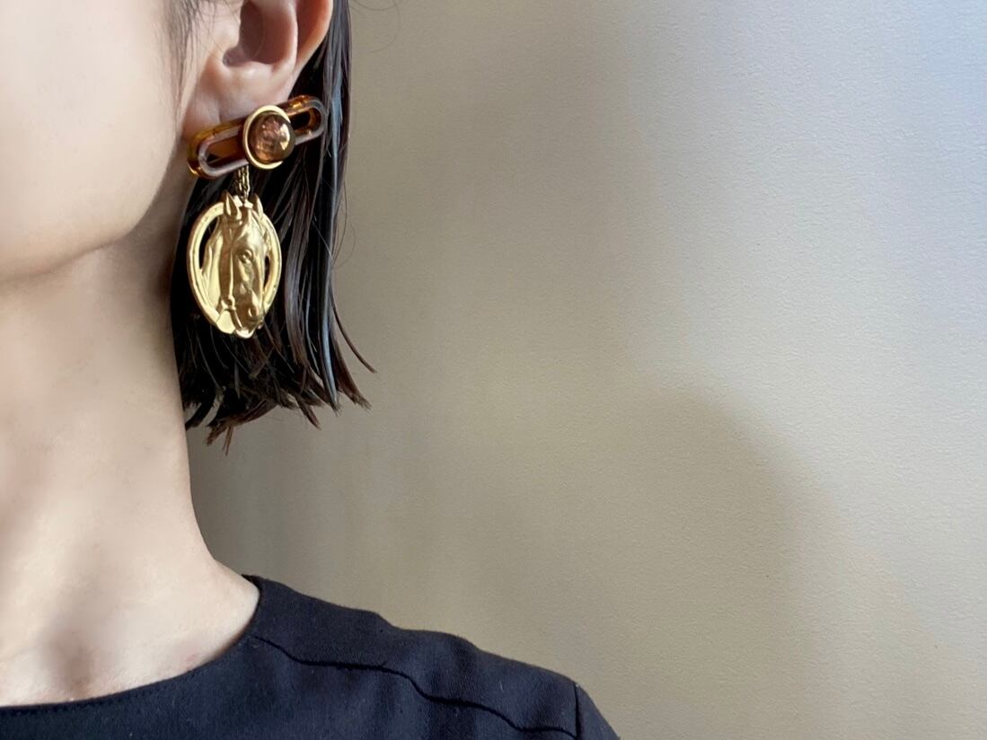 個性的なデザインでボリューム感もありますが、べっこうカラーとアンティークゴールドの組み合わせが肌馴染み良く、何にでも合わせやすい一品です。