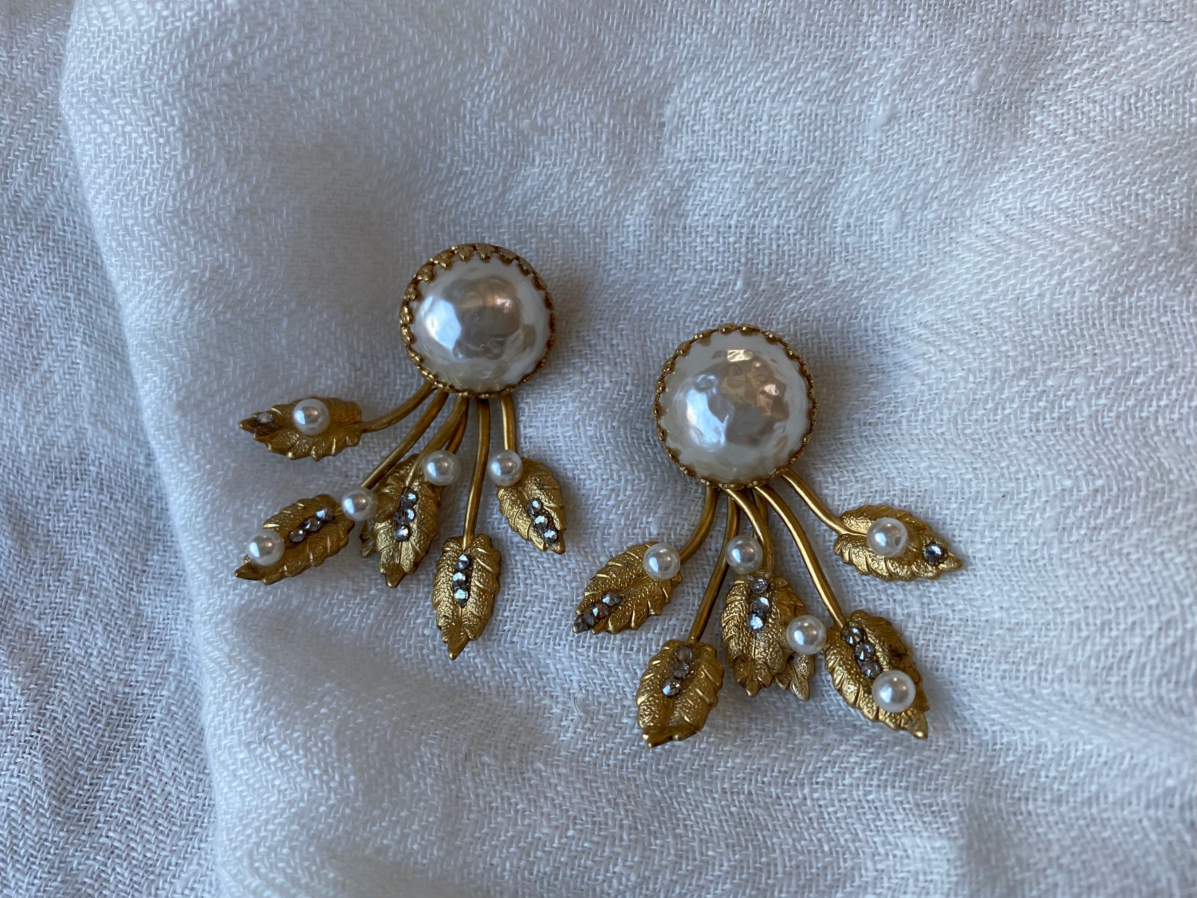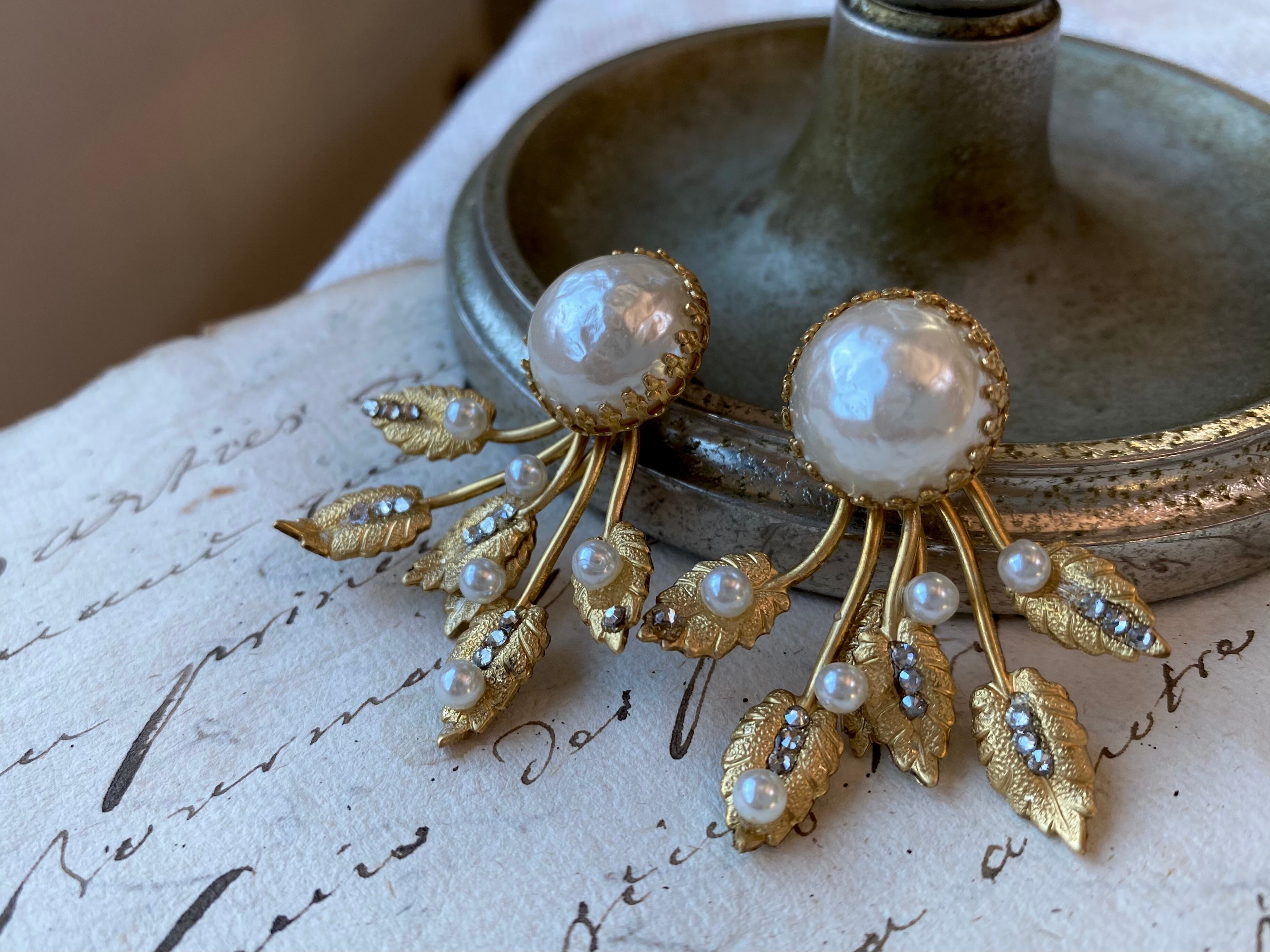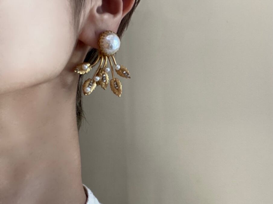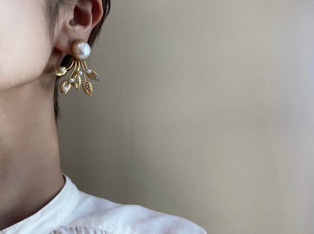 ボタニカルパーツの上にパールやスワロフスキーを散りばめて華やかさを出しました。