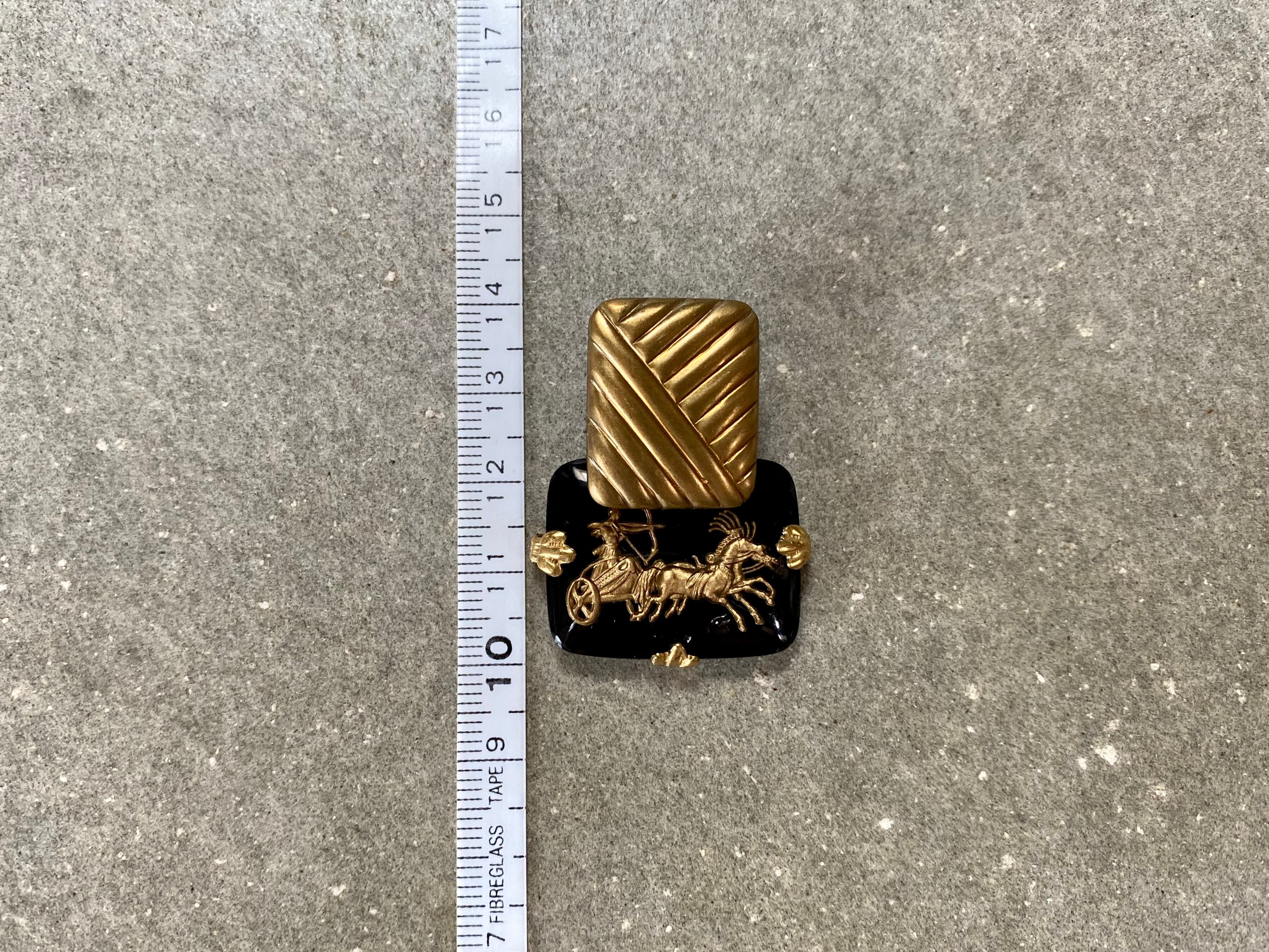 幾何学的な模様の真鍮パーツをカボションに、チャリオットが描かれているクラシカルなインタグリオを添えました。