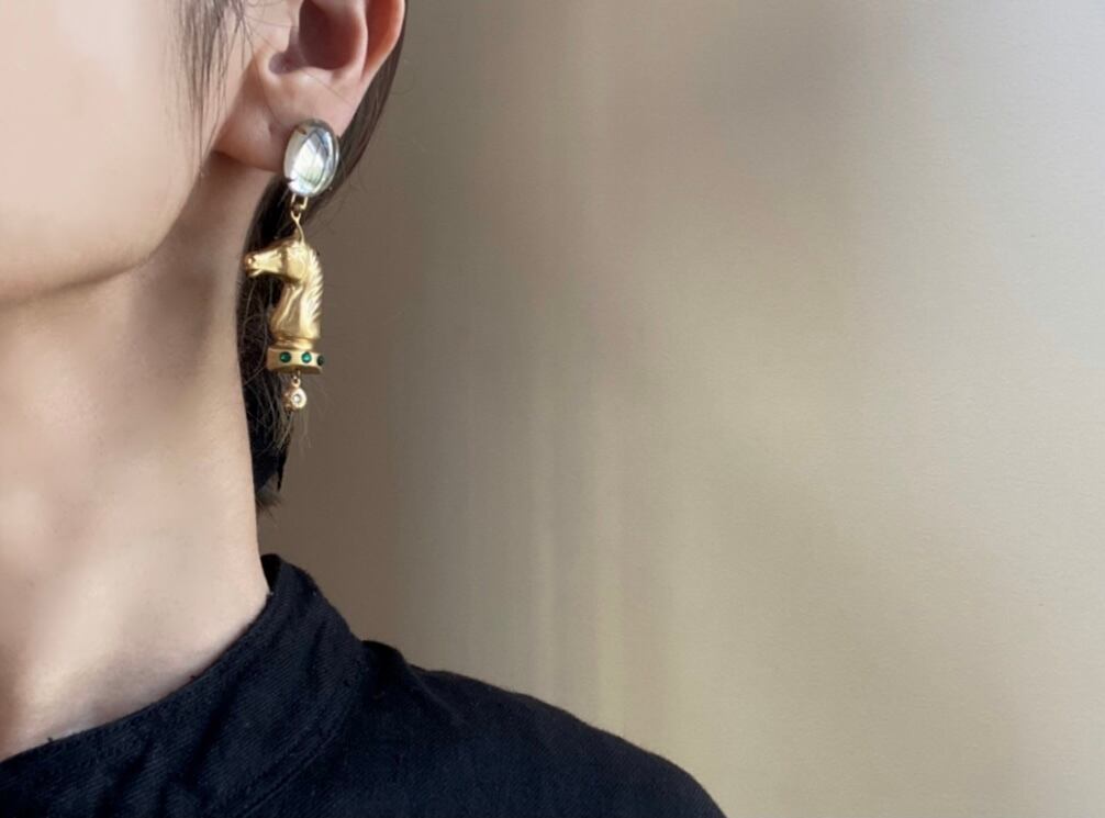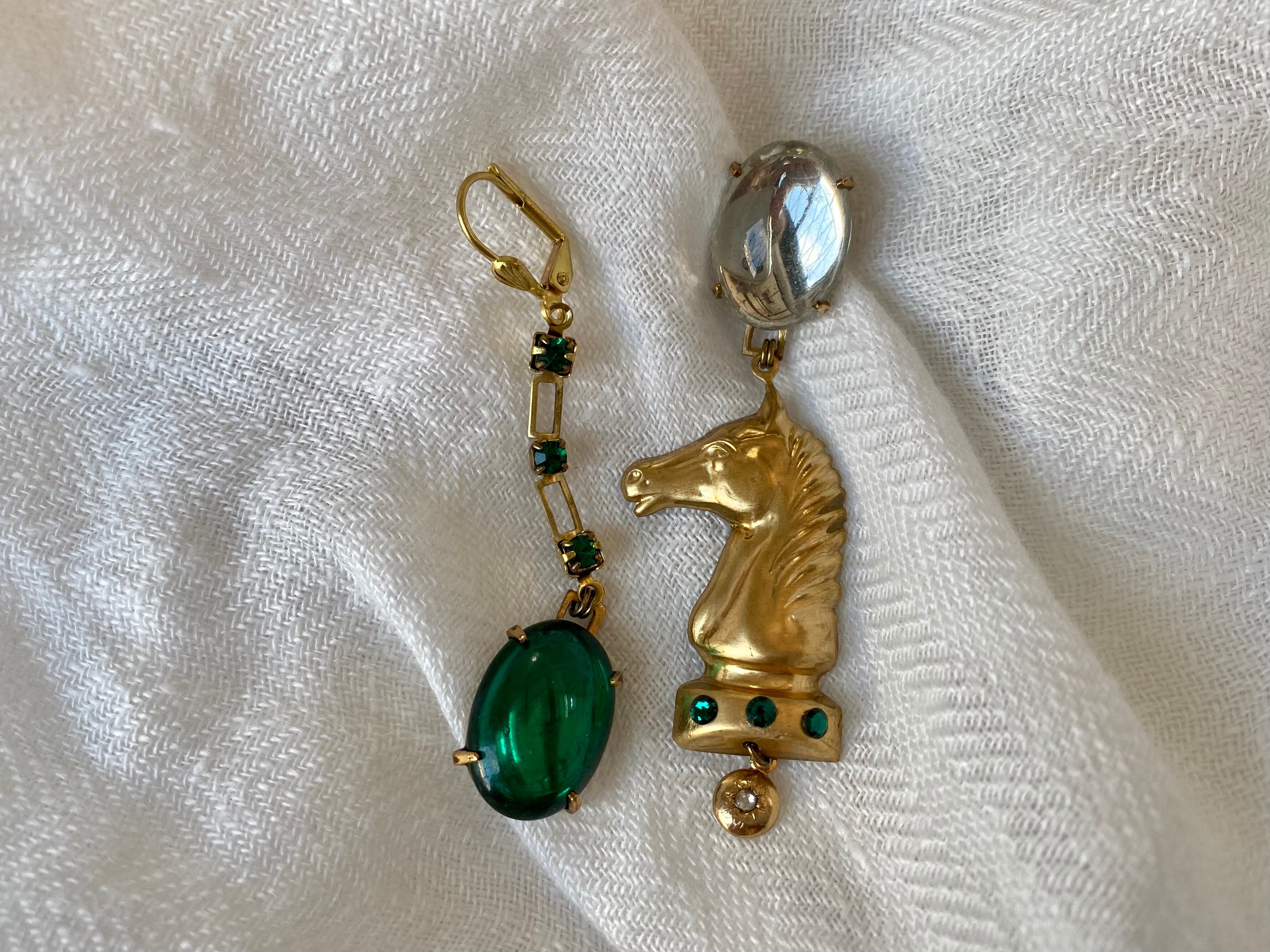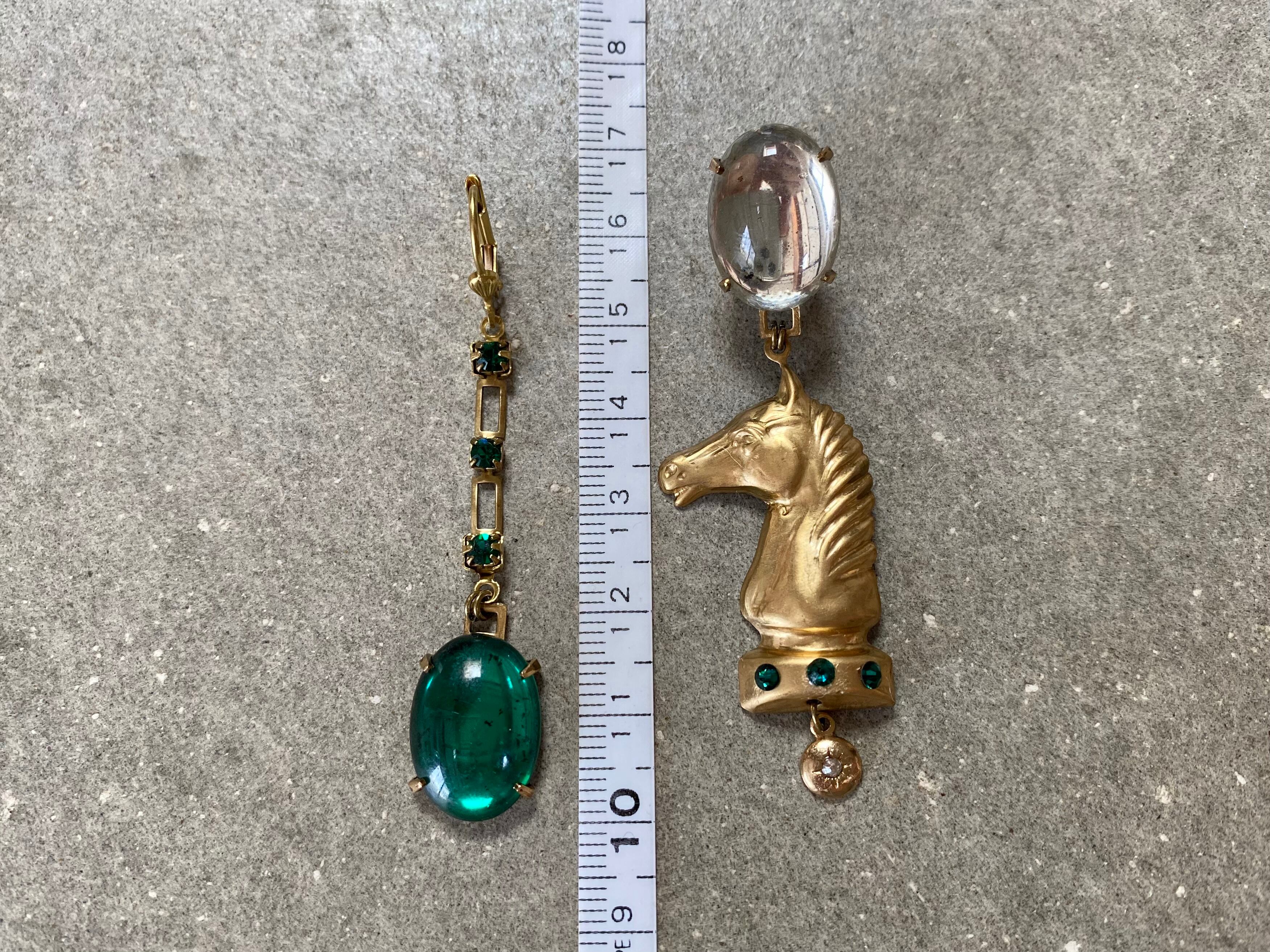 ヴィンテージパーツを使用して、アシンメトリーなピアスを作りました。