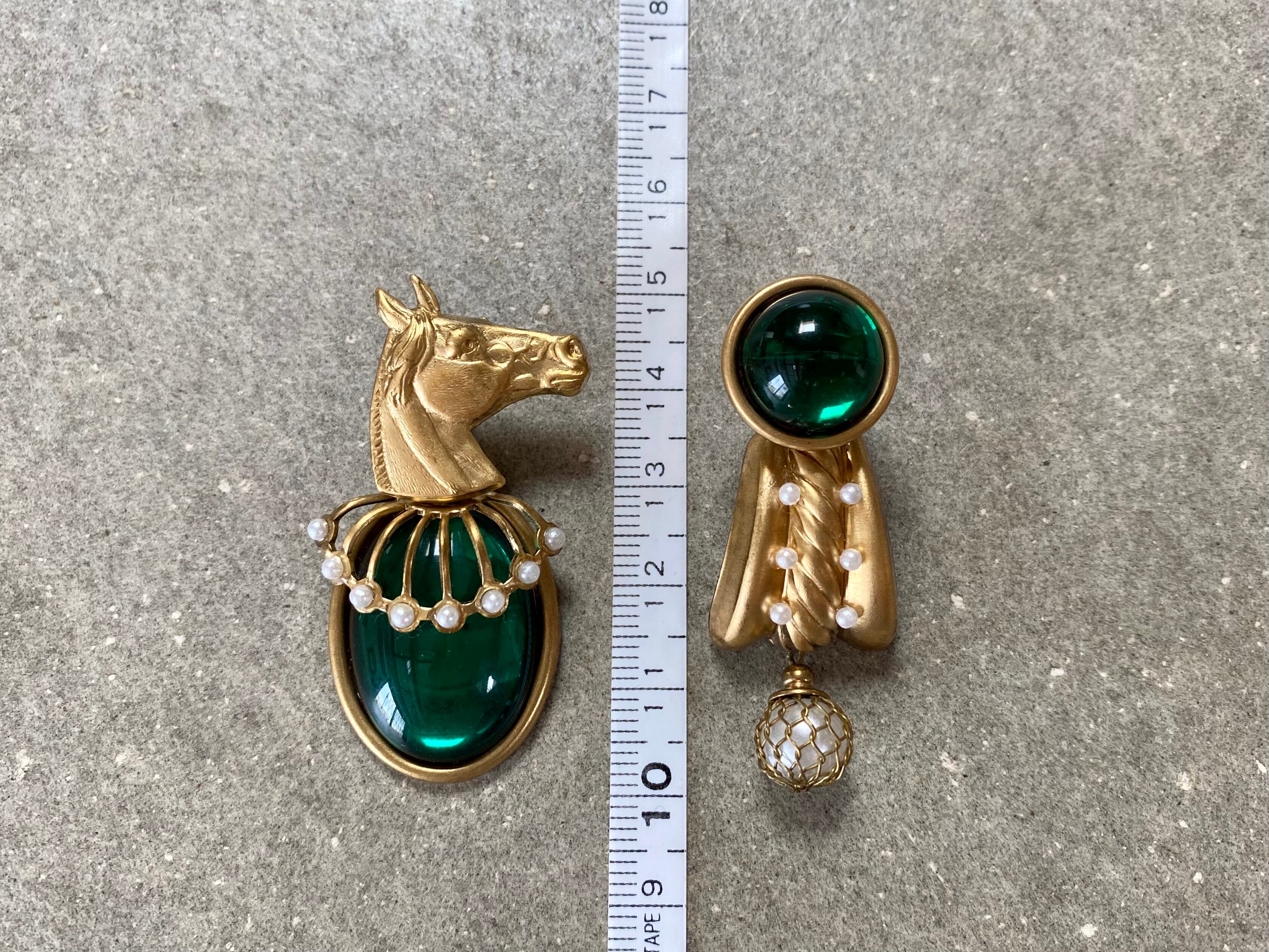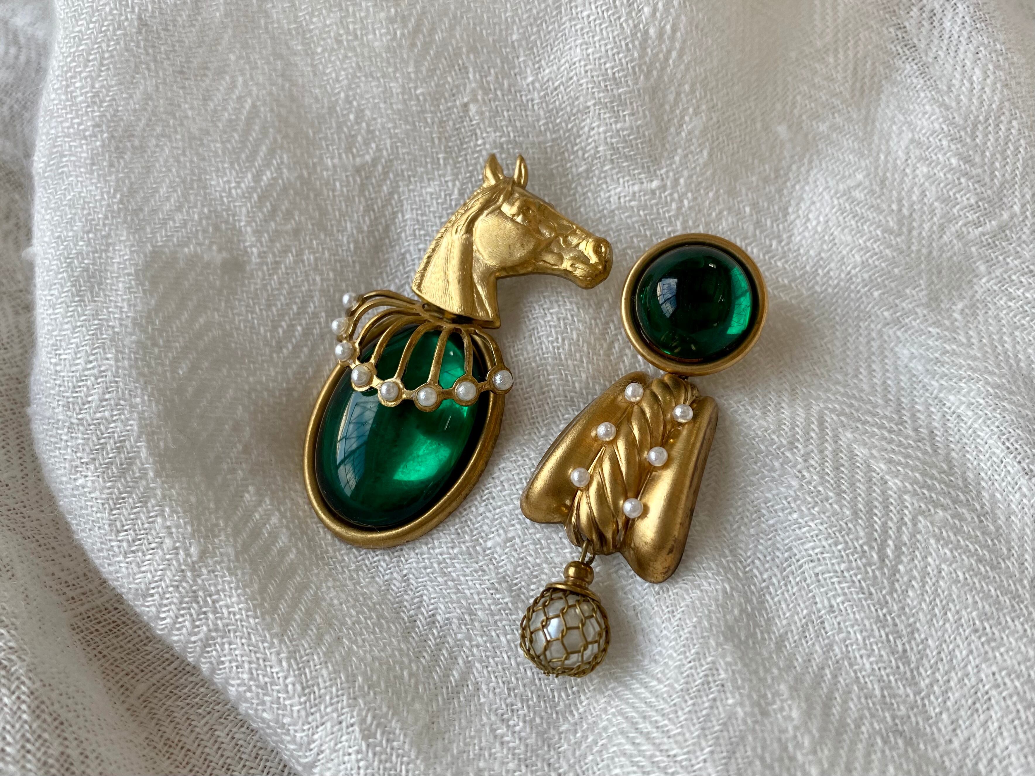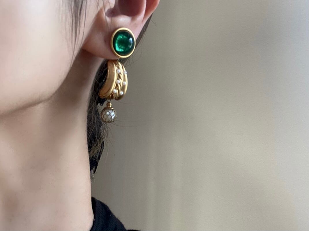 鮮やかなエメラルドカラーのガラスカボションに、可憐なパールが並んでいます。