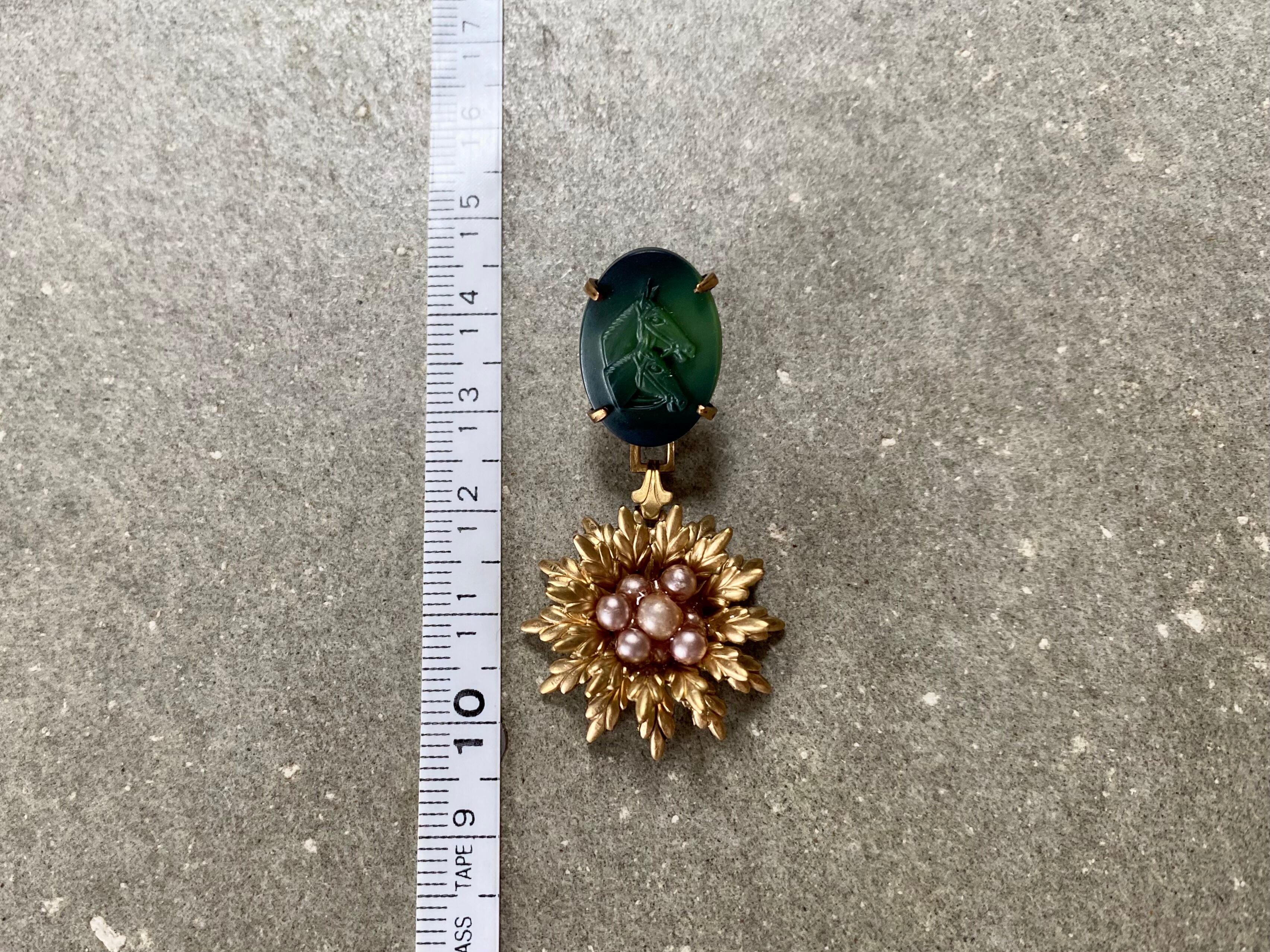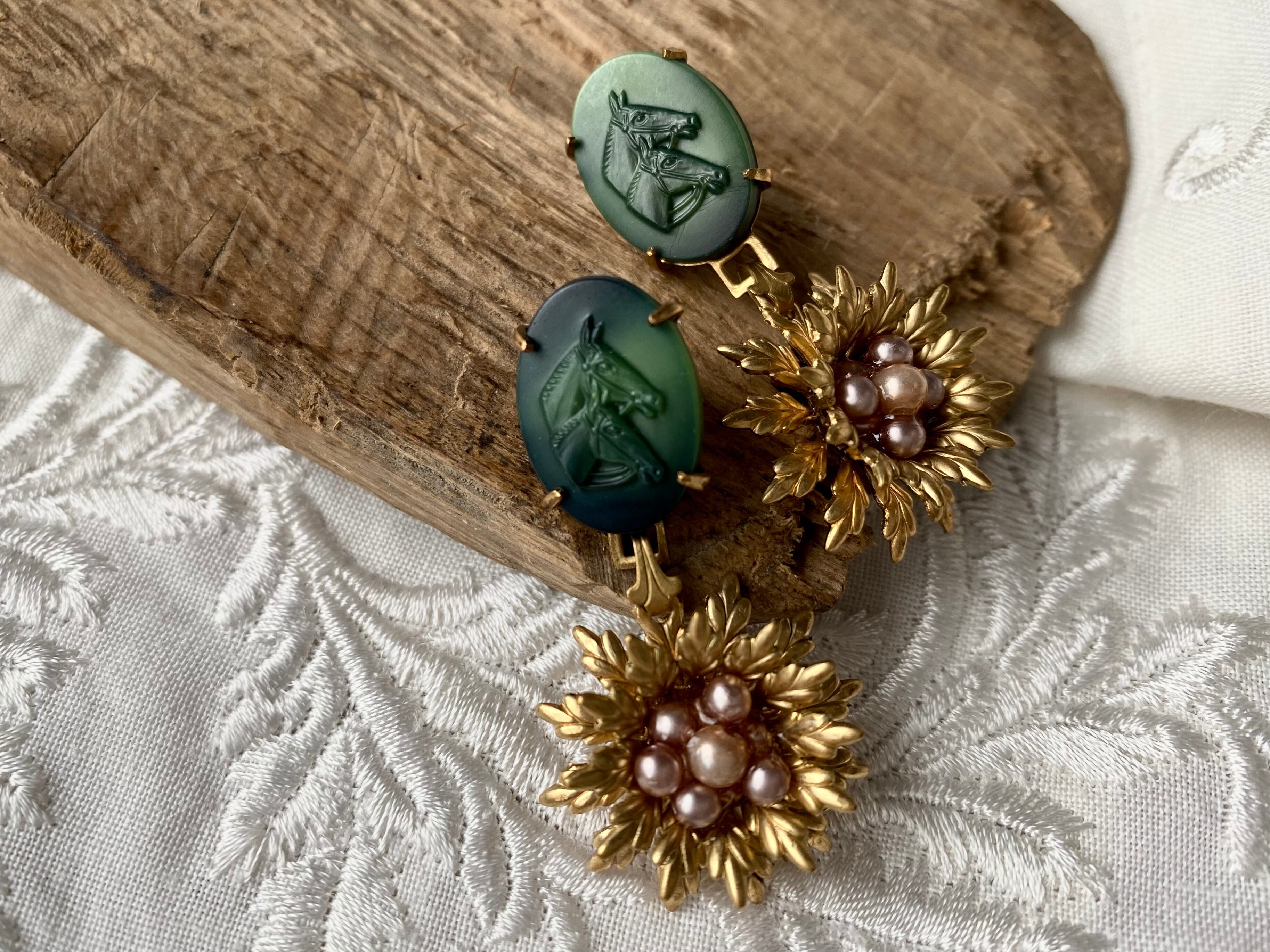 深いグリーンのガラスカボションには連なる馬が浮き彫りになっていて、クラシカルな雰囲気です。