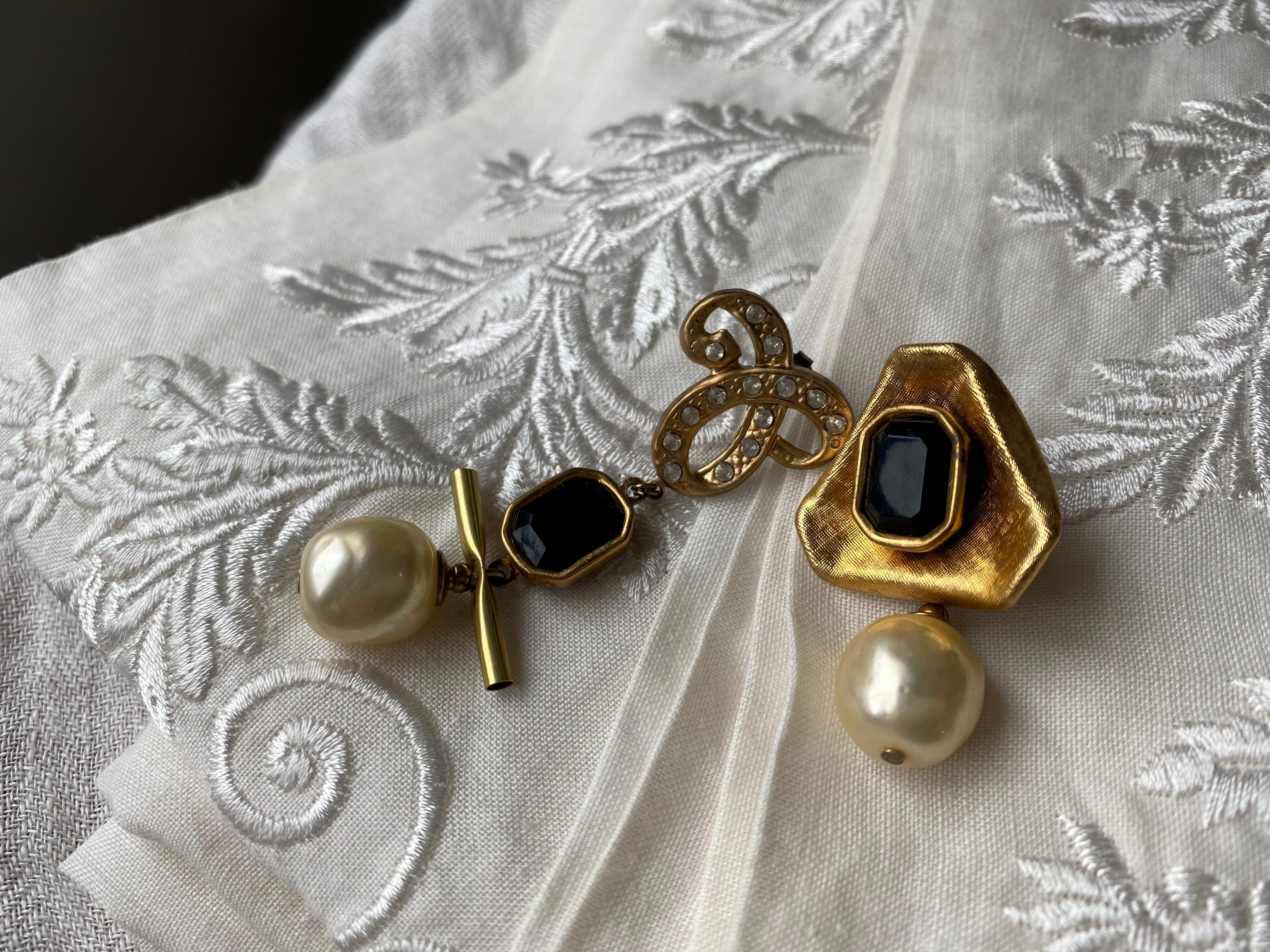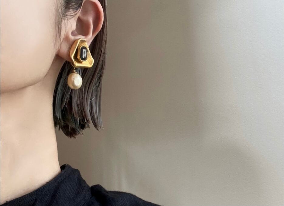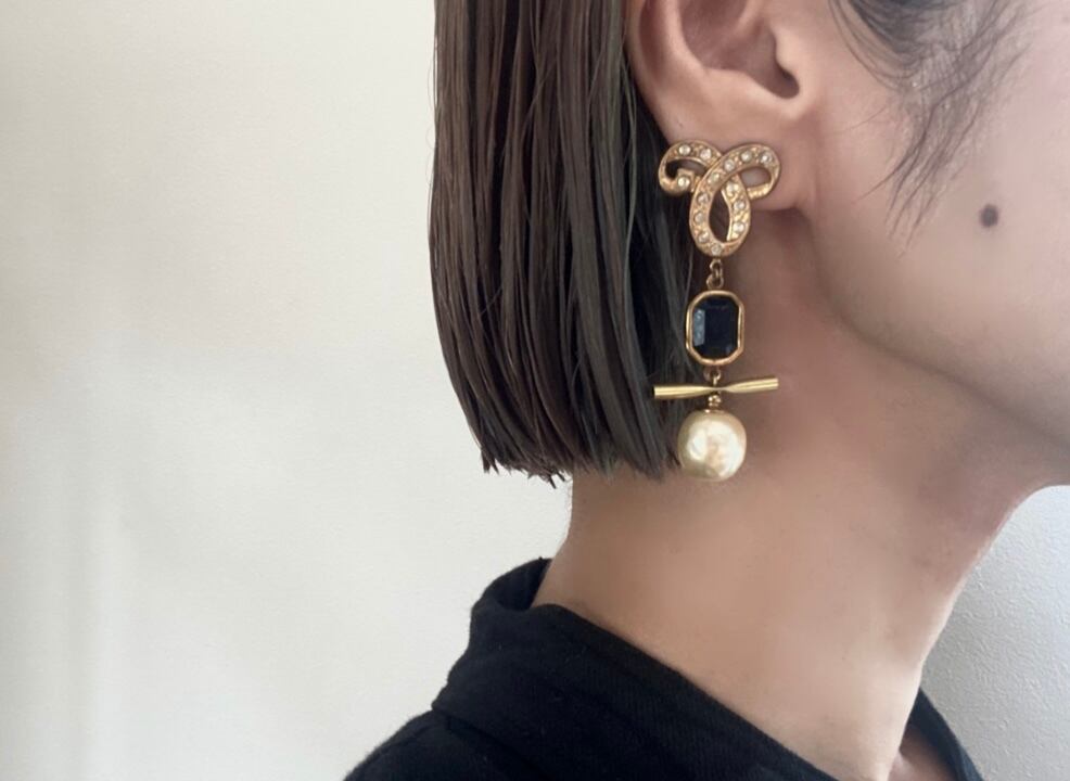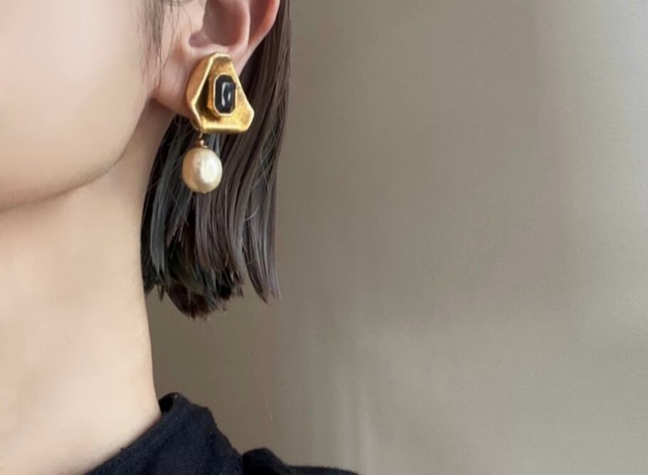 ヴィンテージパーツを使用してアシンメトリーなピアスを作りました。