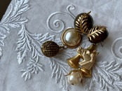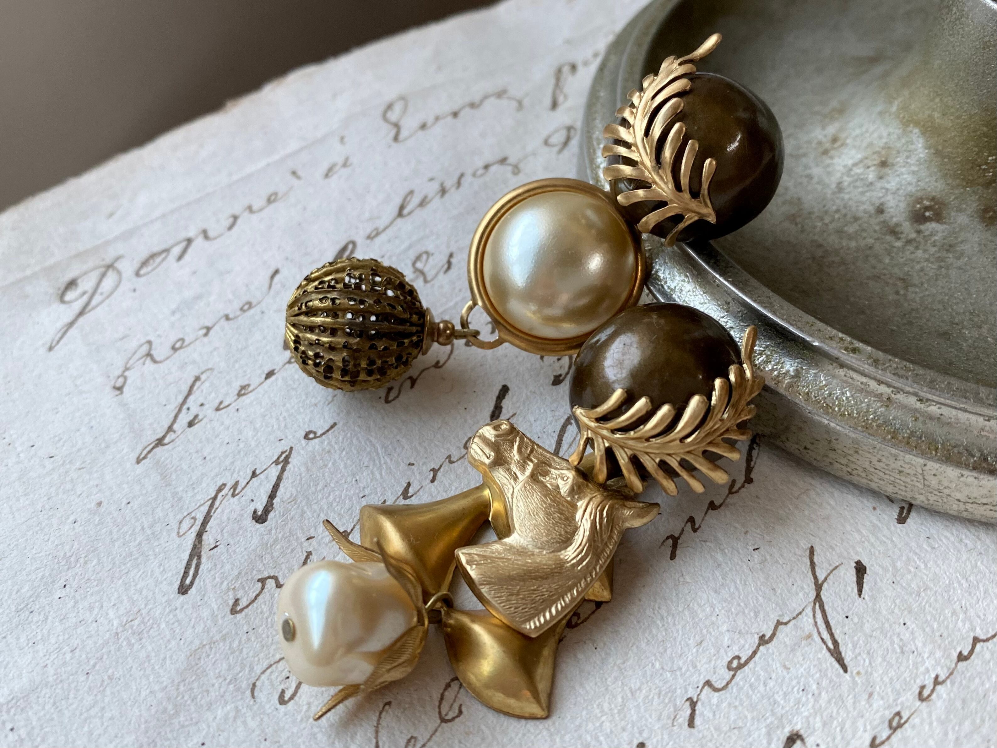 ヴィンテージパーツを使用してアシンメトリーなピアスを作りました。