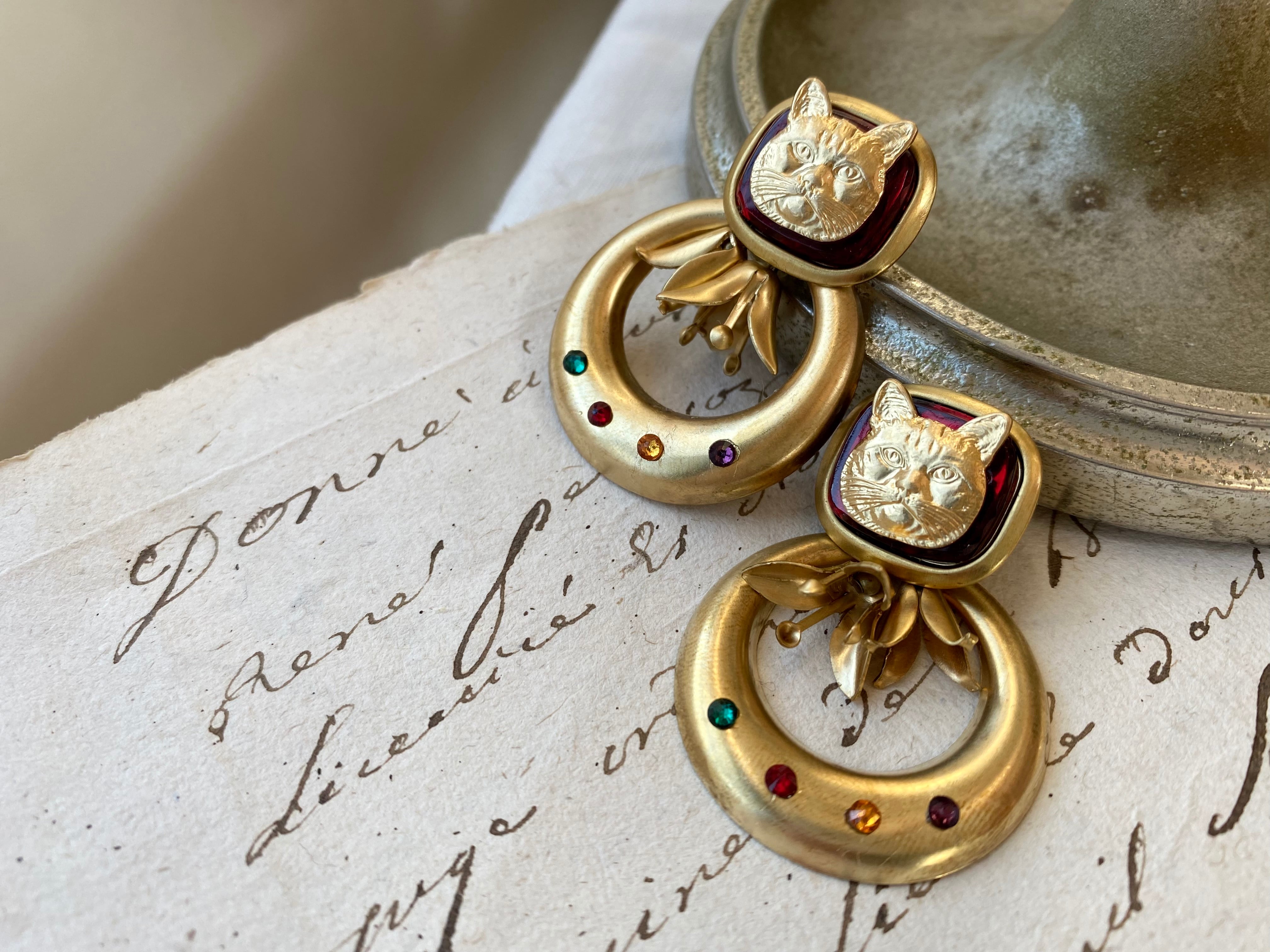 赤いガラスに猫モチーフの真鍮パーツを置いて、お茶目でミステリアスな雰囲気を出しました。