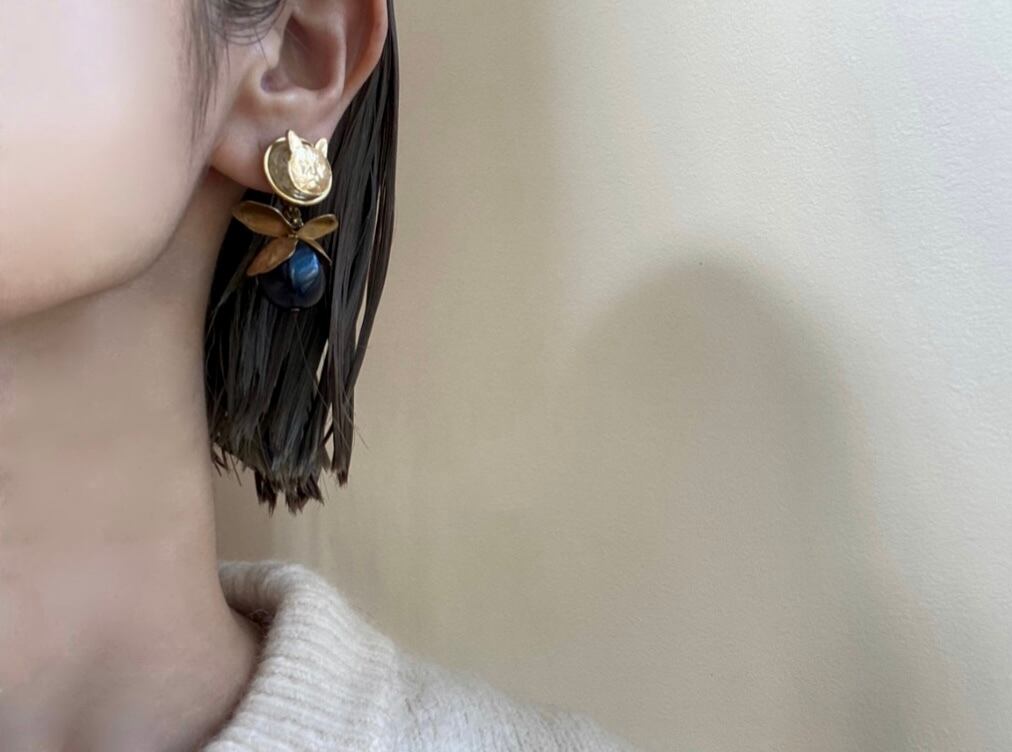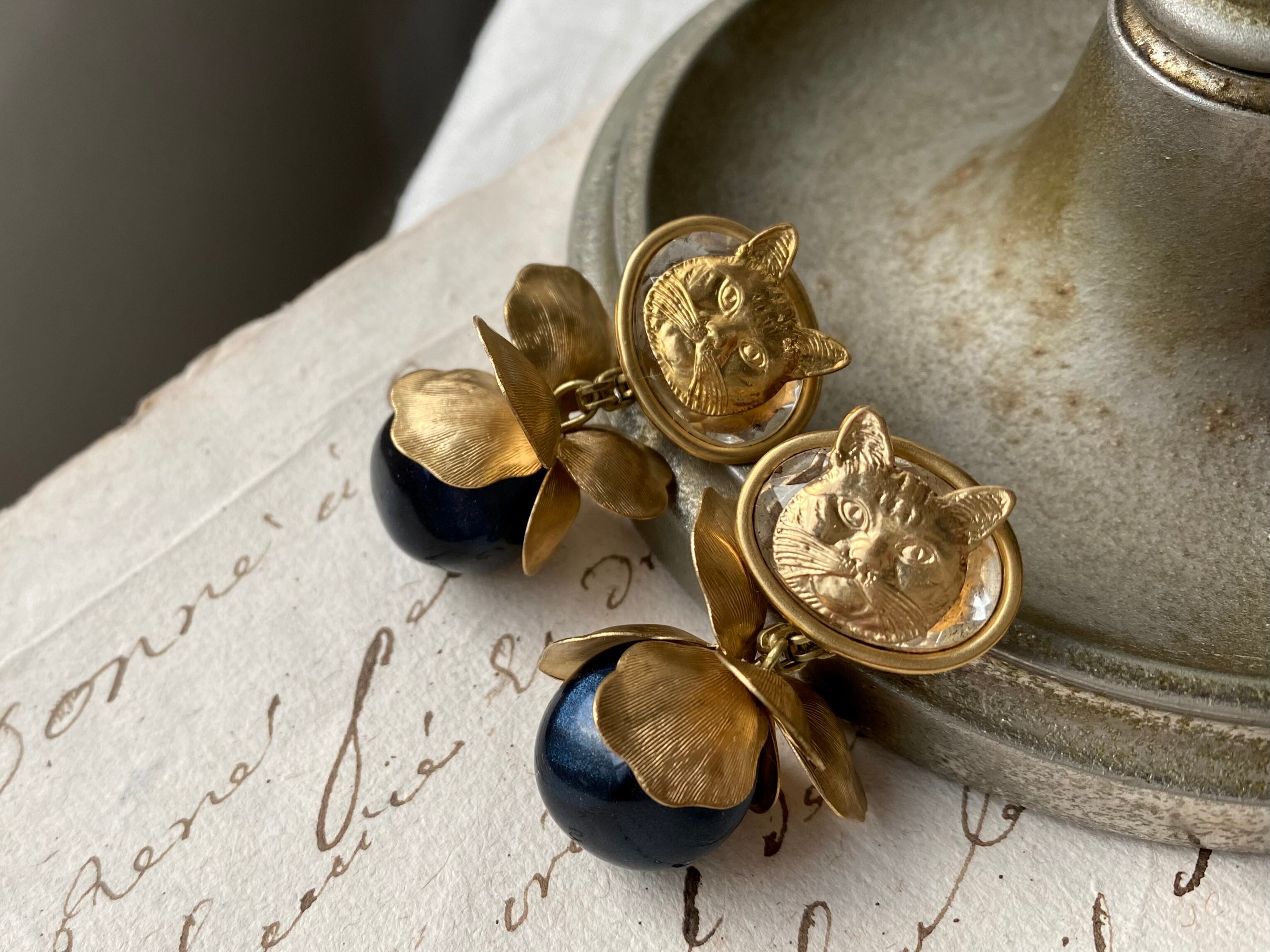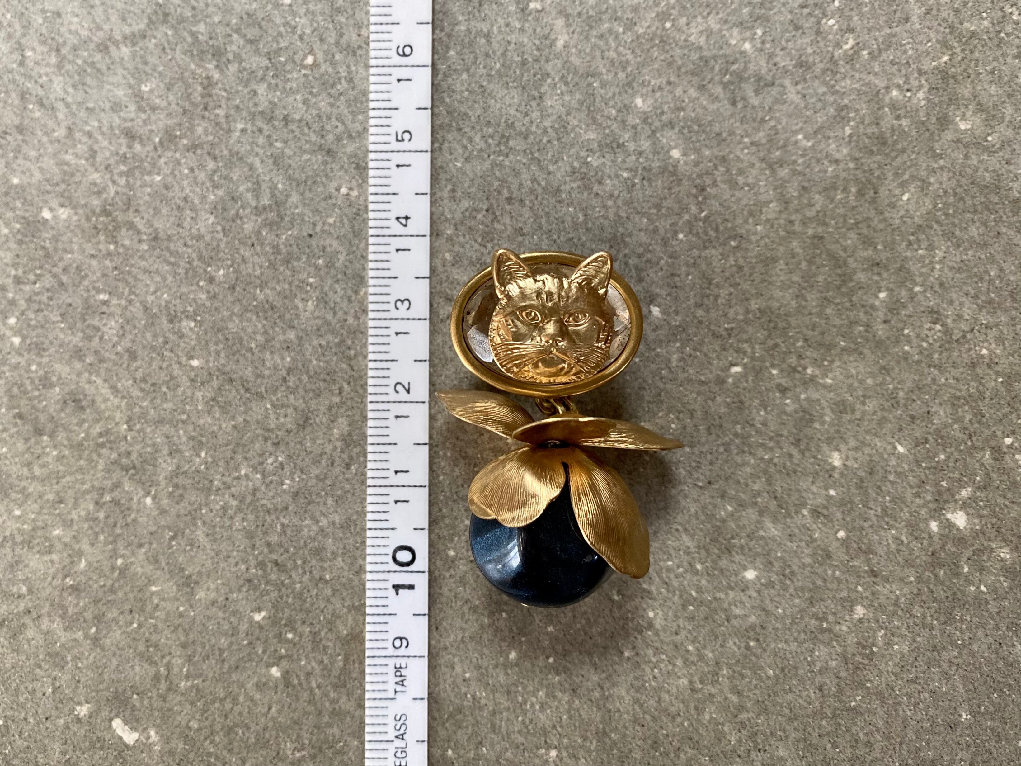 花びらに包まれた深いメタリックカラーのビーズがカボションに置かれたネコのクールな表情と好相性です。