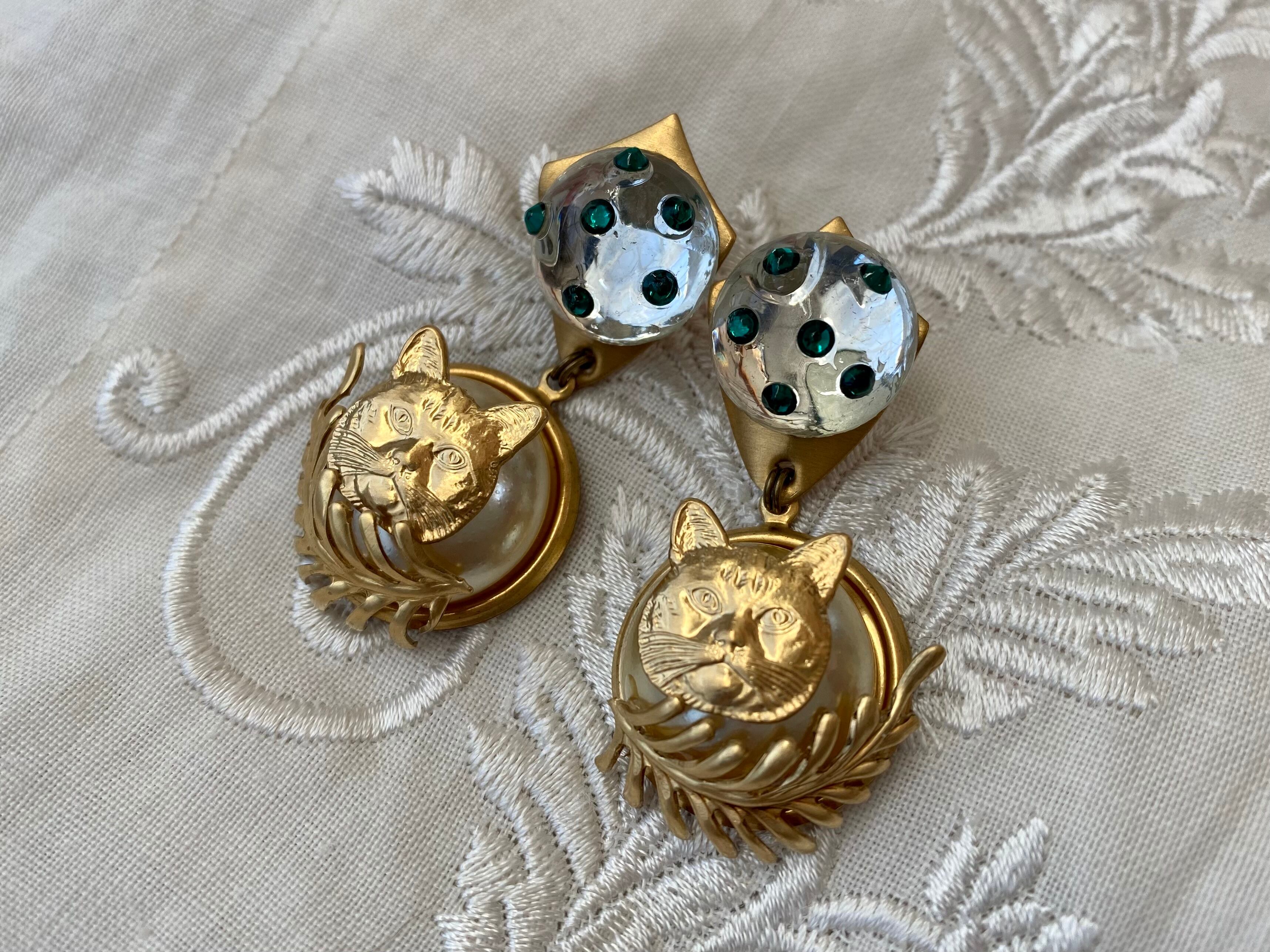 美しいガラスカボションにグリーンのスワロフスキーを散らし、個性的なネコとの相性を良くしました。