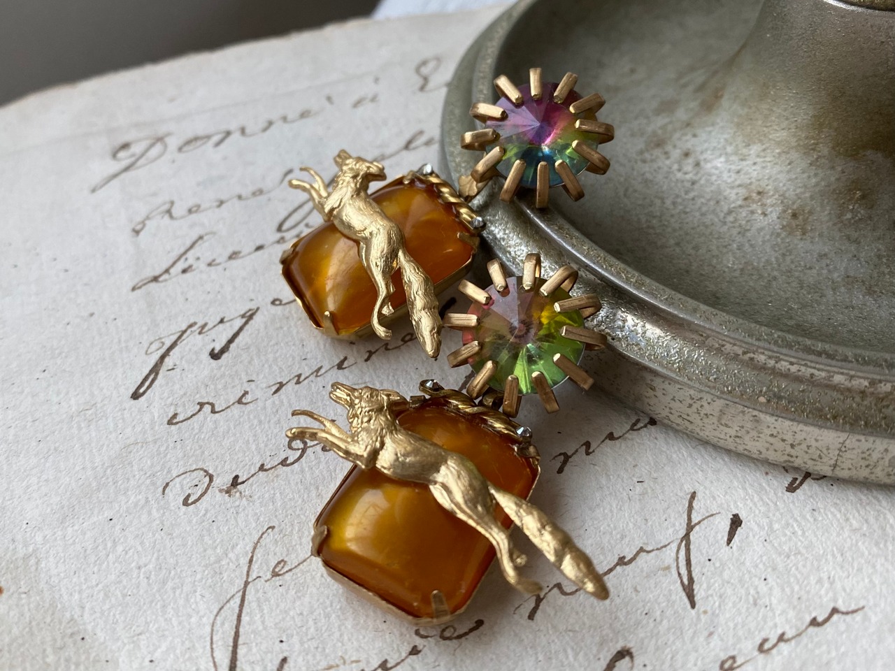 ヴィンテージパーツを使用してピアスをつくりました。