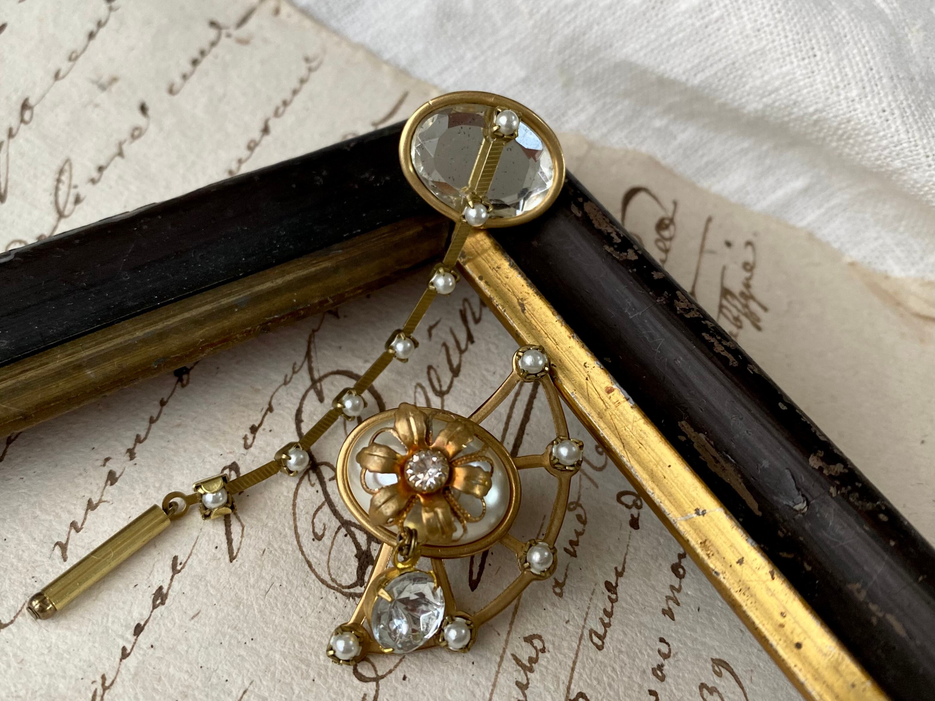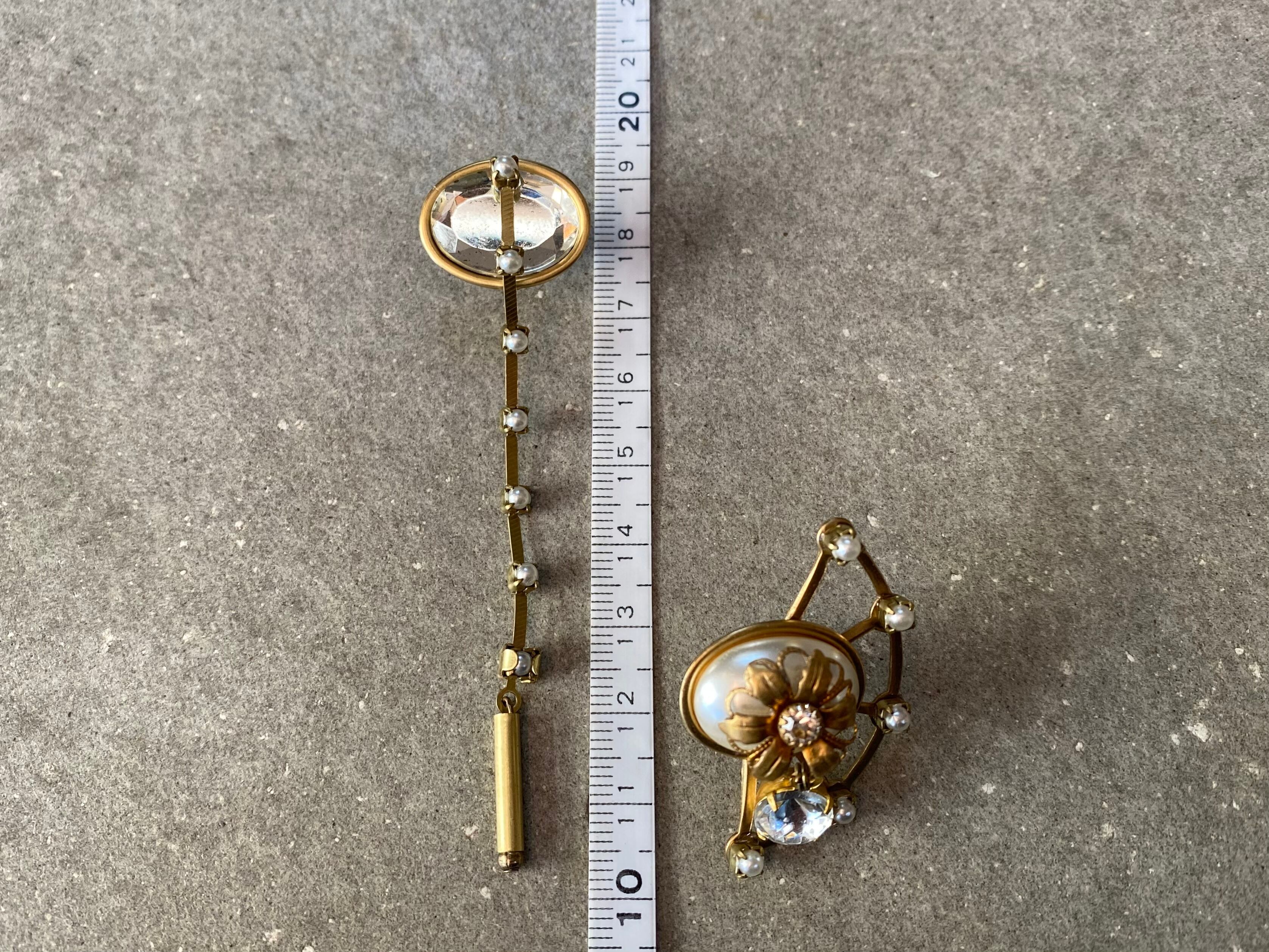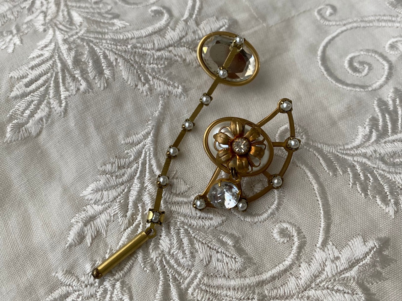 ヴィンテージパーツを使用してアシンメトリーなピアスを作りました。