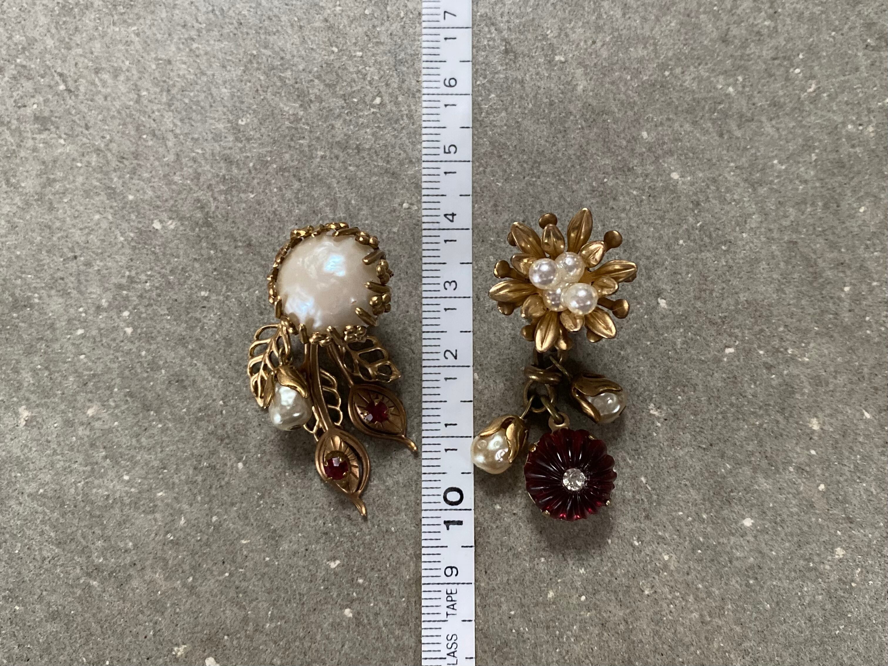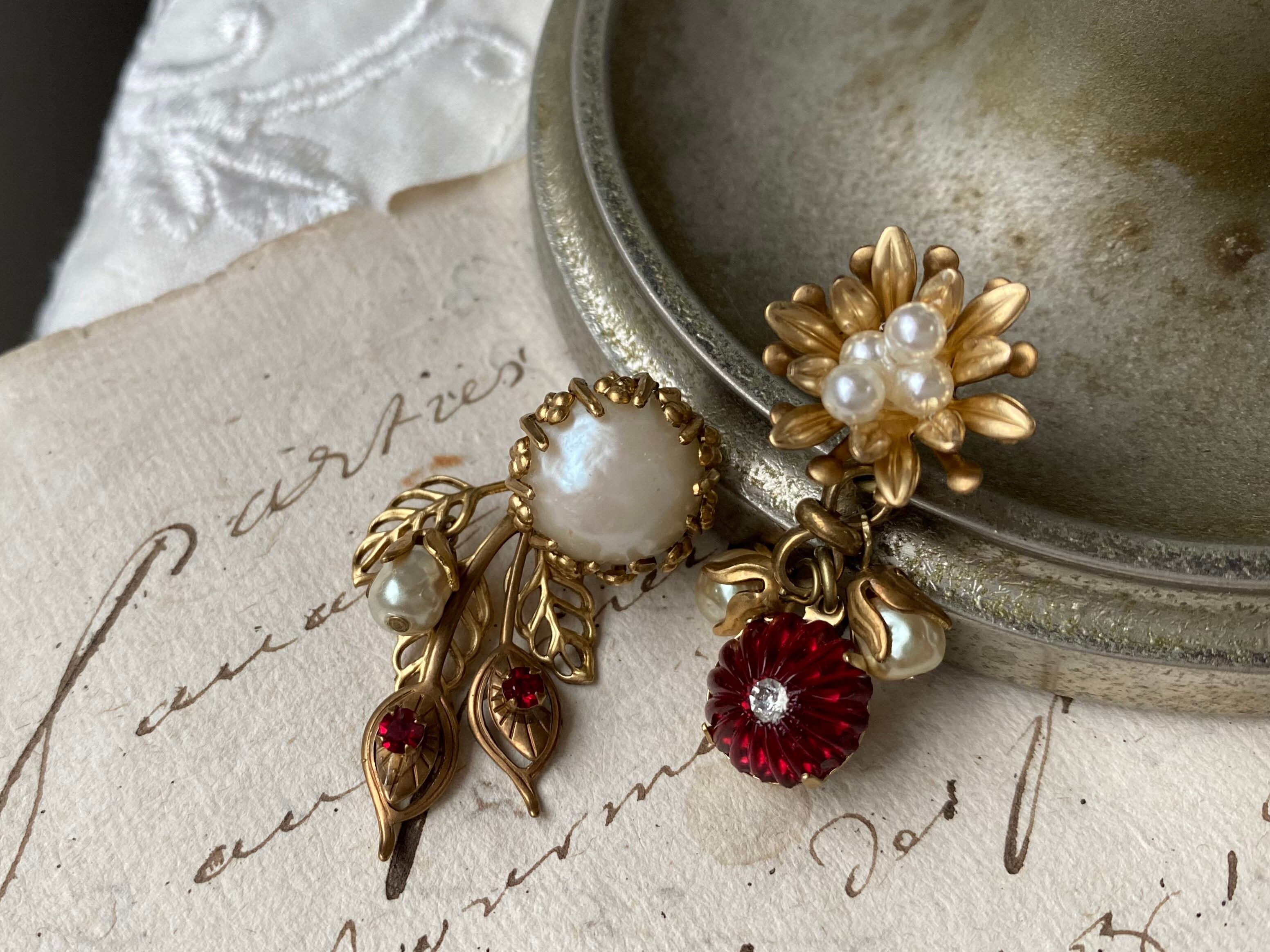 ヴィンテージパーツを使用してアシンメトリーなピアスを作りました。