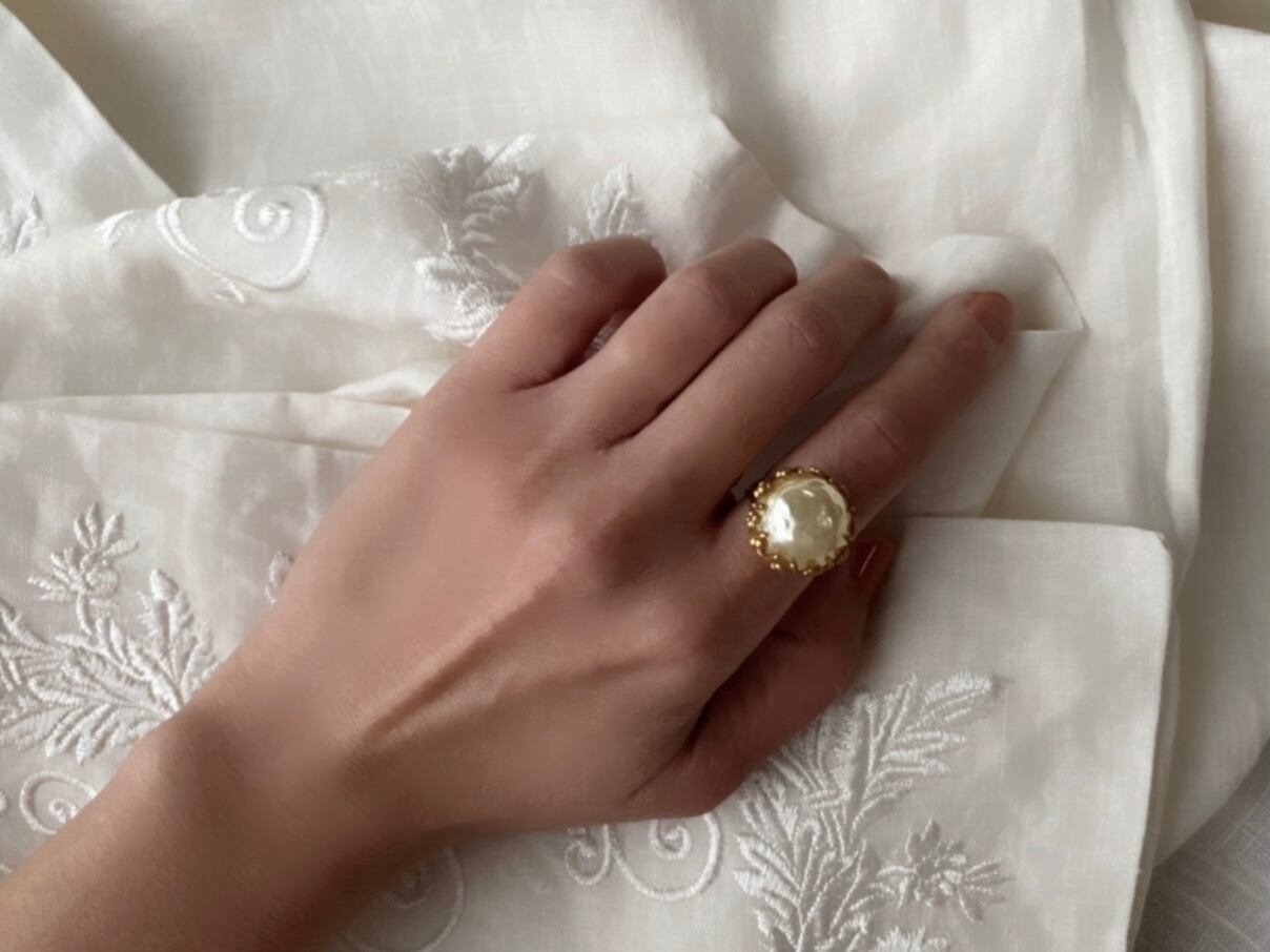 ミリアムハスケルの大粒パールを、やはりミリアムハスケルのセッティングでパールを包み込み、シンプルな一粒リングに仕上げました。