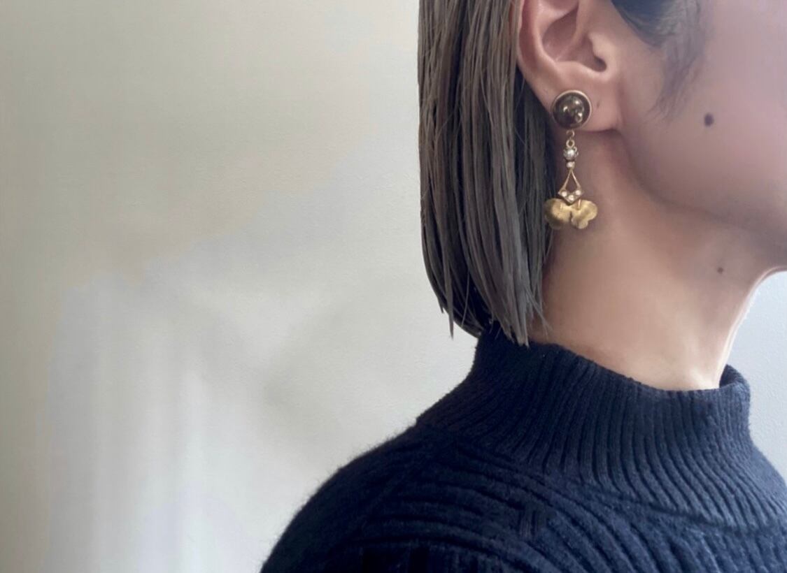 ヴィンテージパーツを使用してアシンメトリーなピアスを作りました。