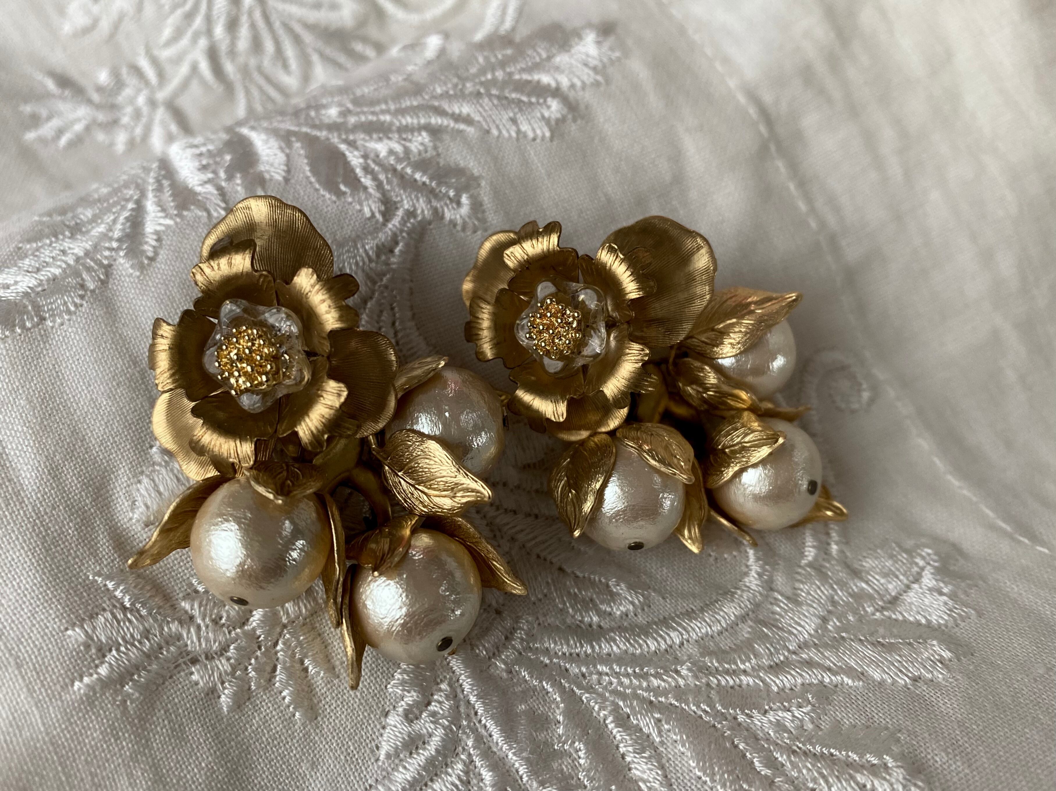 カボションに収められたクリアガラスがみずみずしく、またゴージャスに重ねられたボタニカルパーツと柔らかなコットンパールの組み合わせが華やかな印象です。