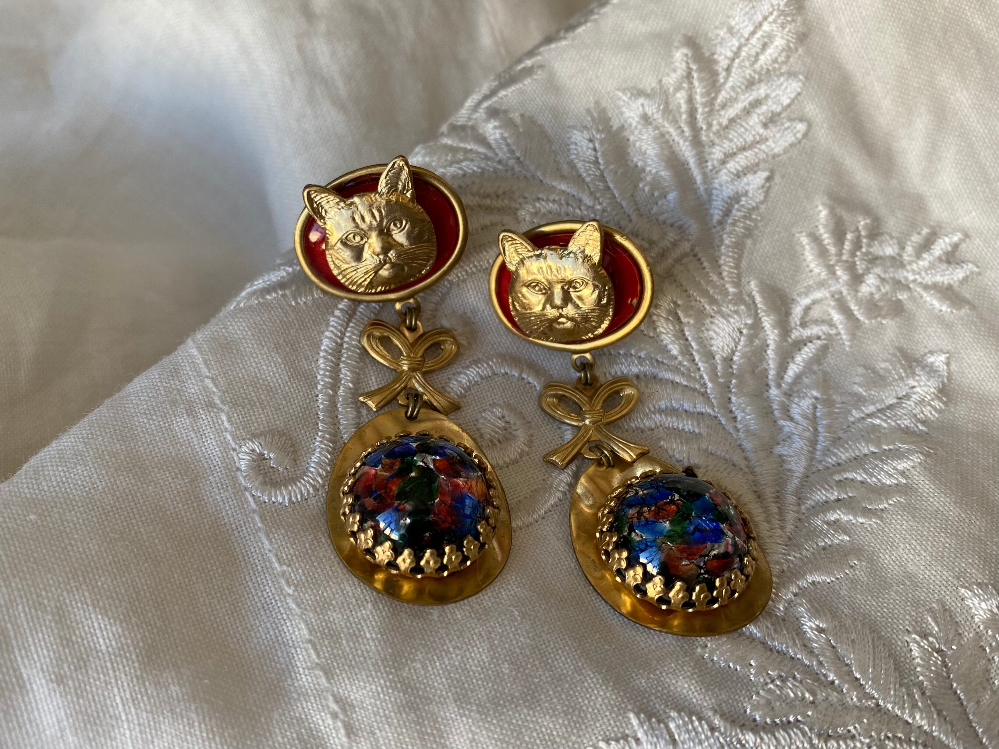 ビビットな赤いガラスカボションにキュートなネコのチャームが良く映えます。