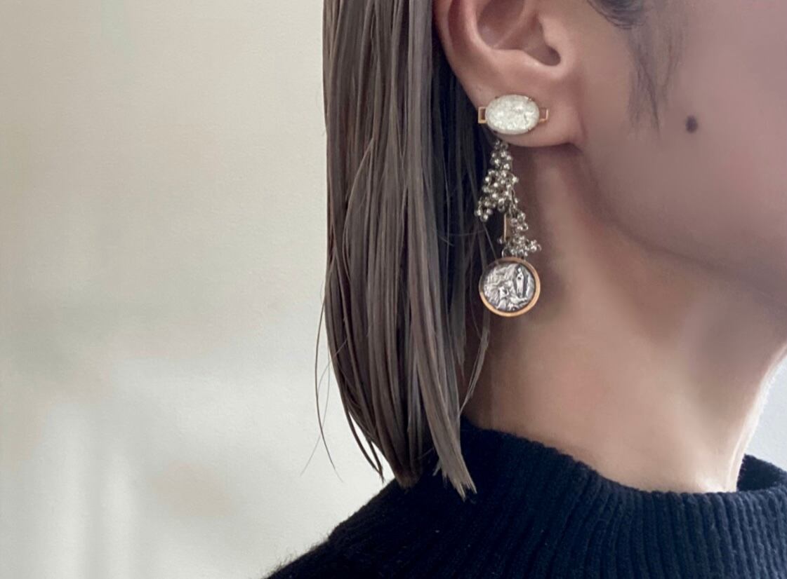 ヴィンテージパーツを使用してアシンメトリーなピアスを作りました。