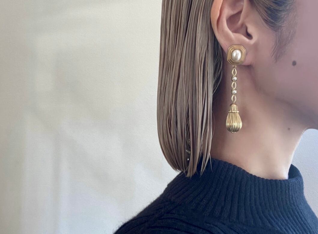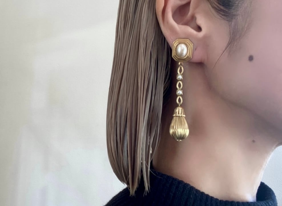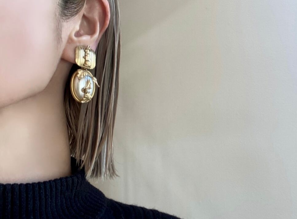ヴィンテージパーツを使用してアシンメトリーなピアスを作りました。