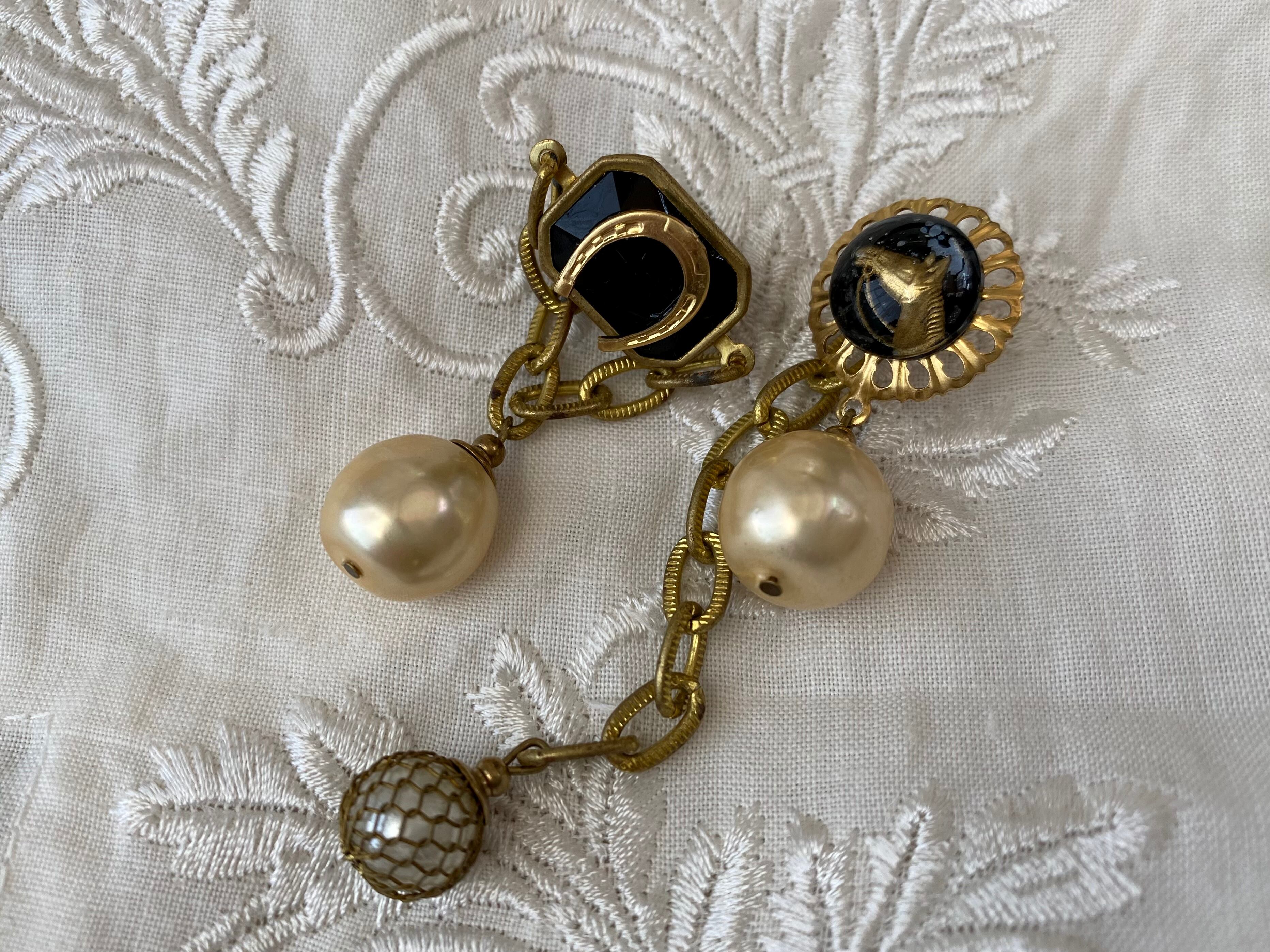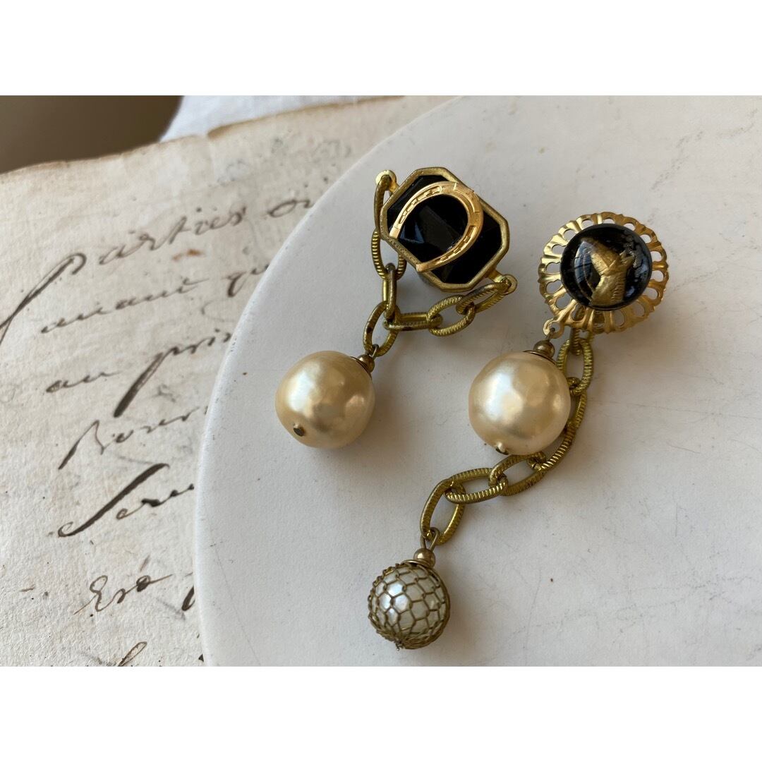 ヴィンテージパーツを使用してアシンメトリーなピアスを作りました。