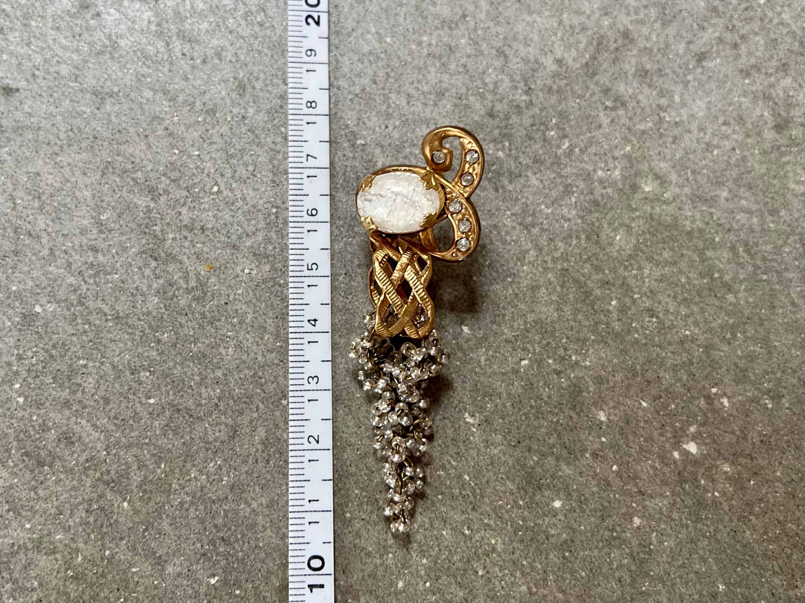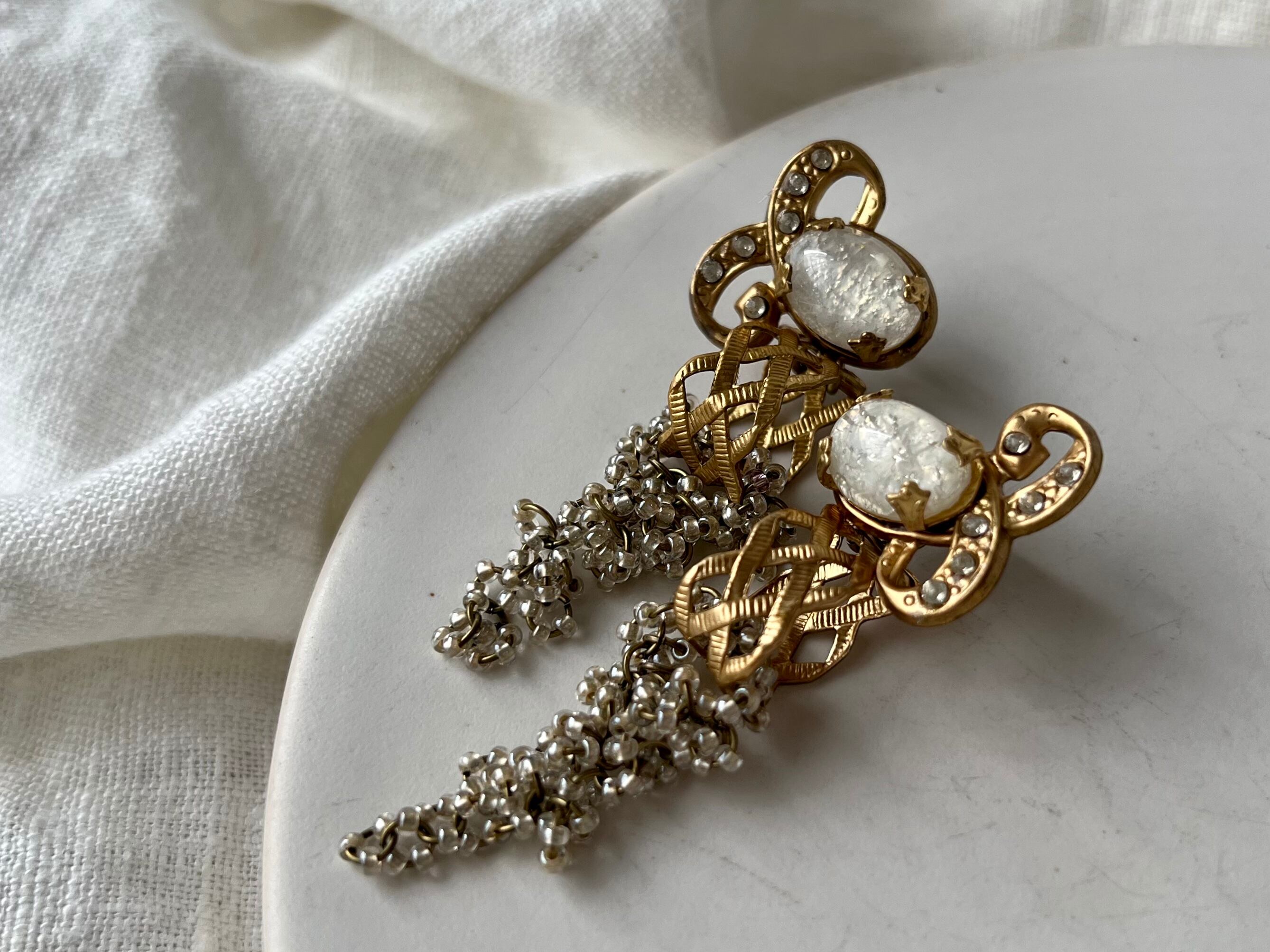 カボションと繊細なガラスビーズを繋ぐ真鍮パーツも透かしの入ったリボンのようで、全体的にとても優美な雰囲気です。