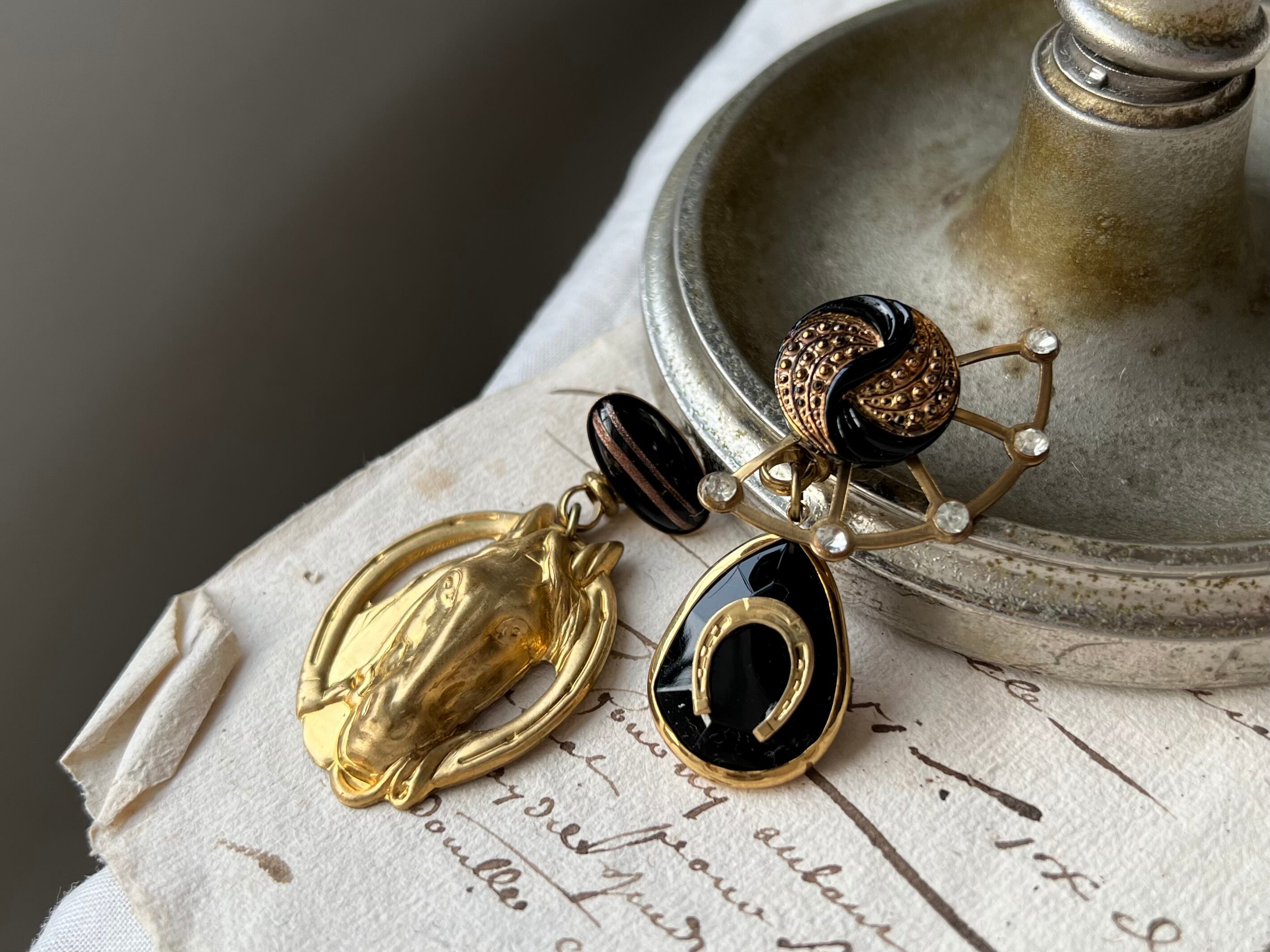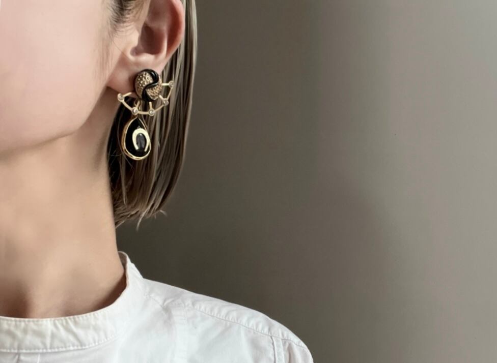 ヴィンテージパーツを使用して、アシンメトリーなピアスを作りました。