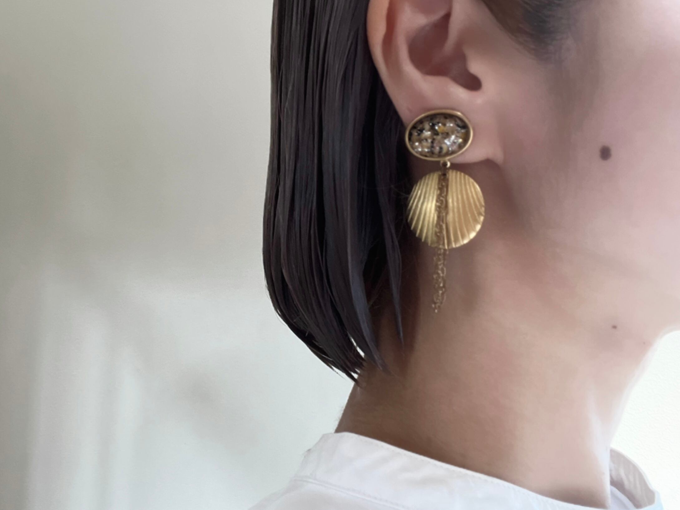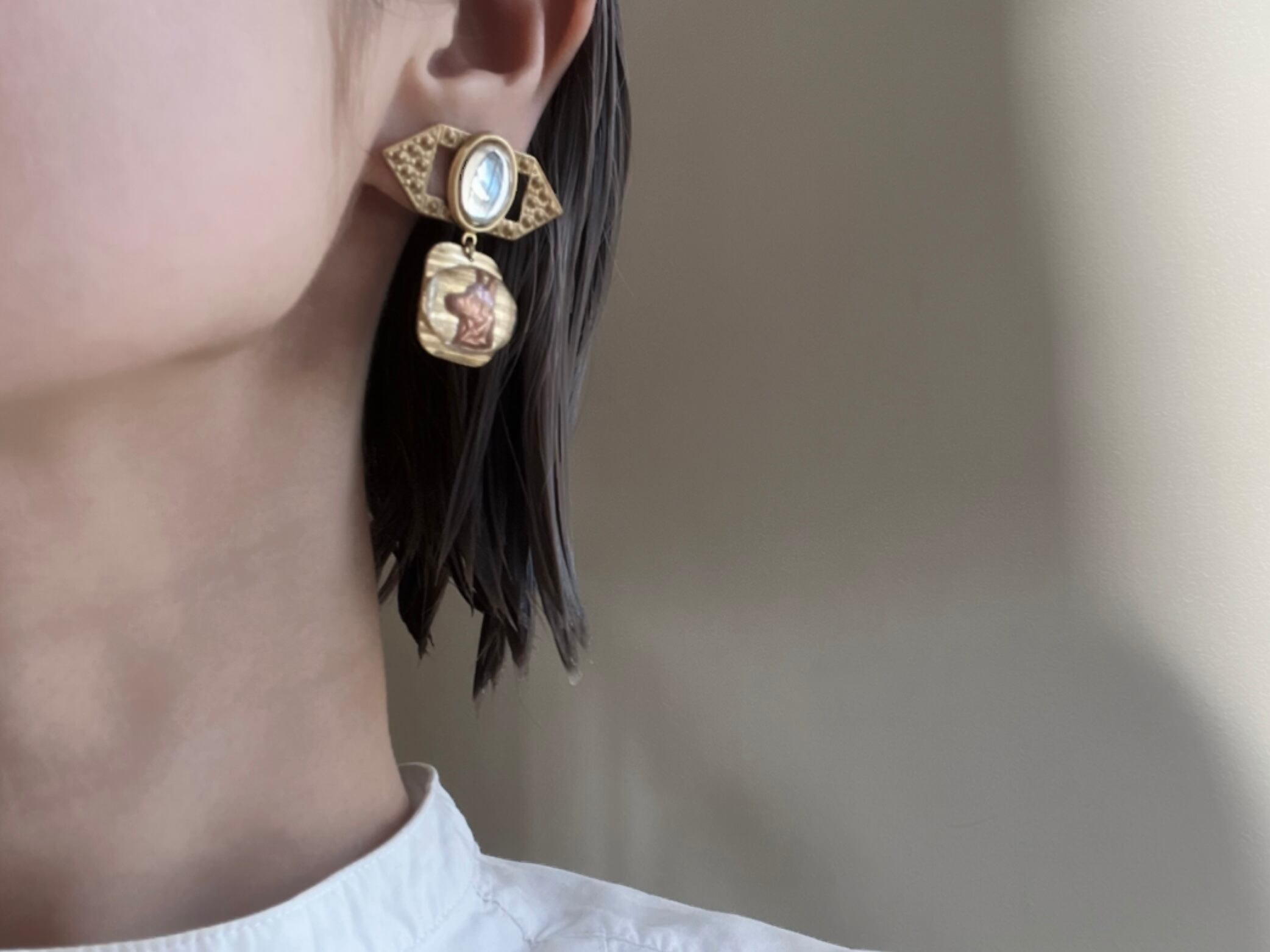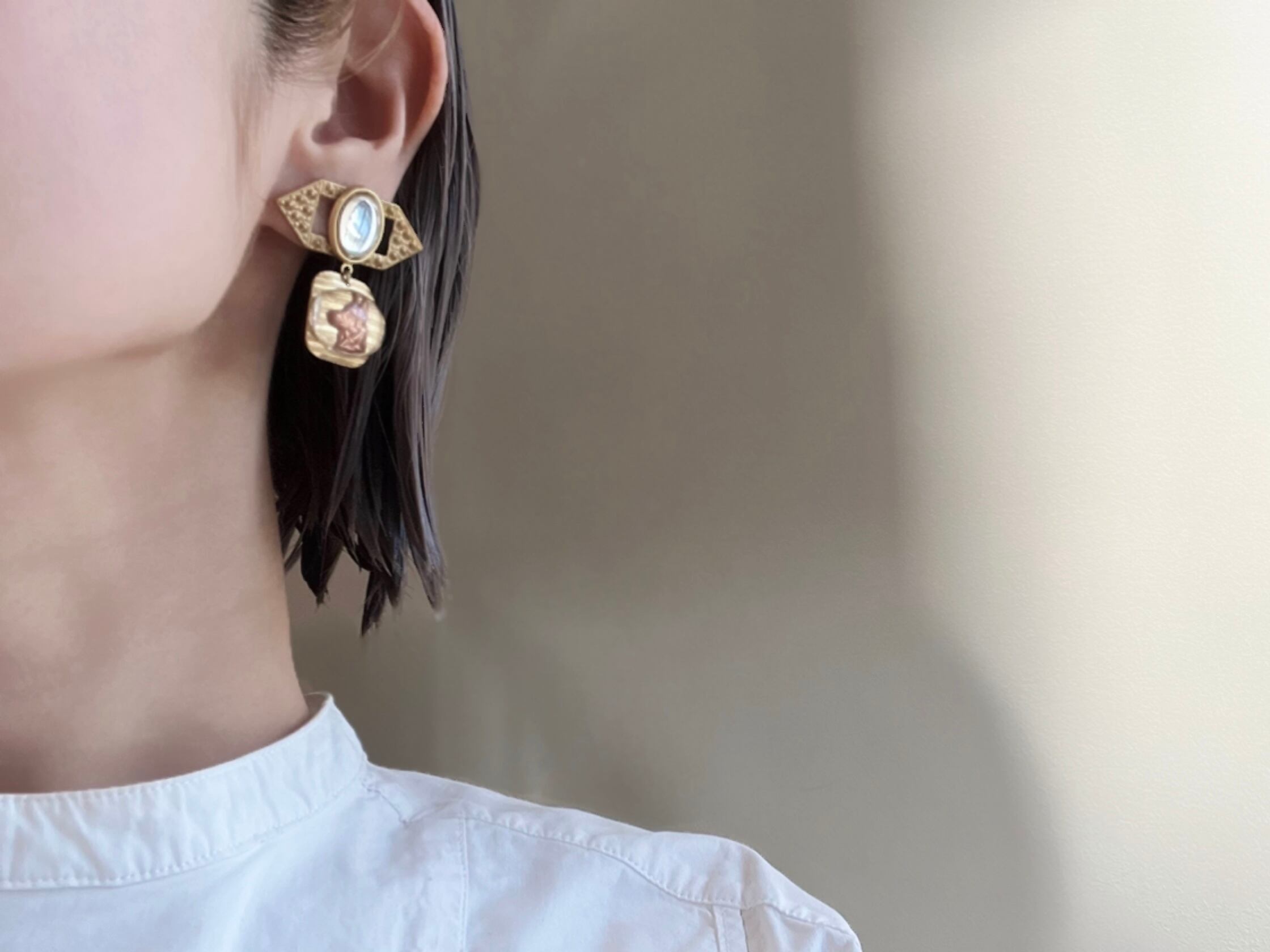 ヴィンテージパーツを使用してアシンメトリーなピアスを作りました。