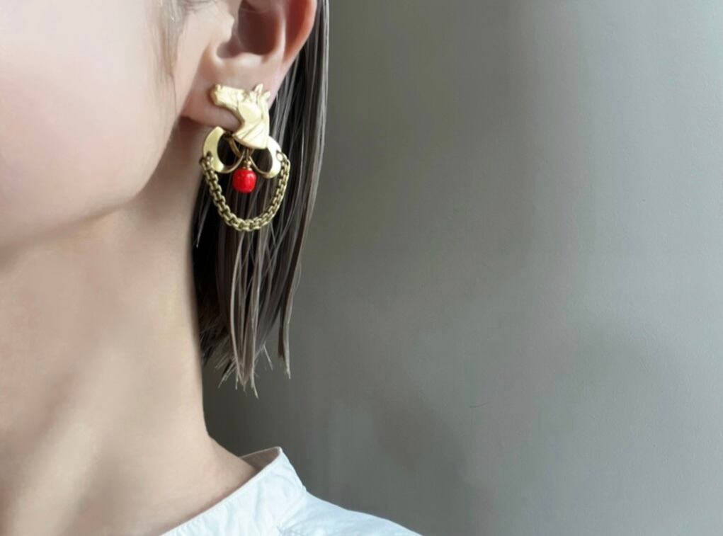 そこにキリッとした赤いガラスビーズがアクセントとなり、お顔周りをパッと明るくしてくれます。