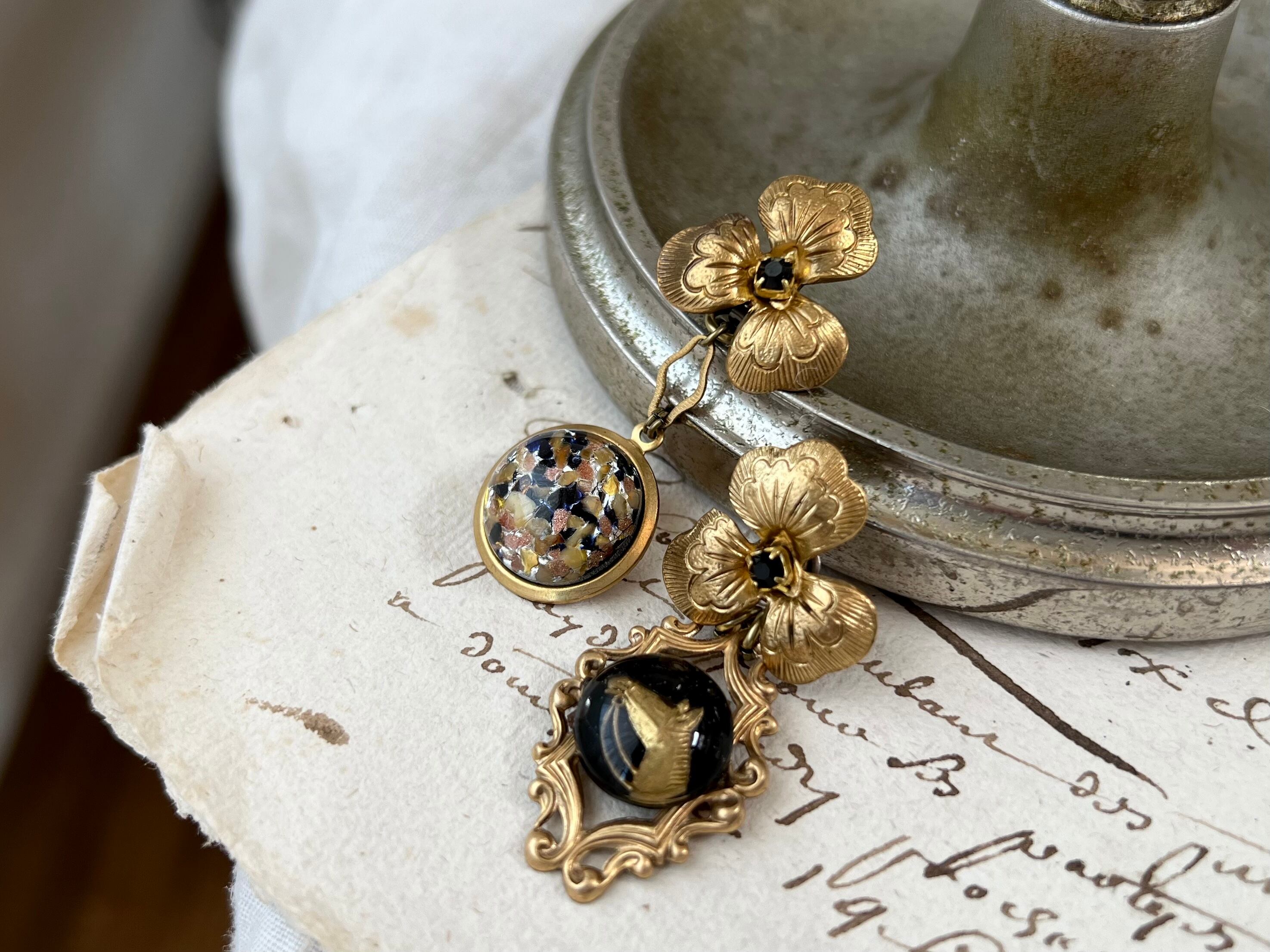 ヴィンテージパーツを使用してアシンメトリーなピアスを作りました。