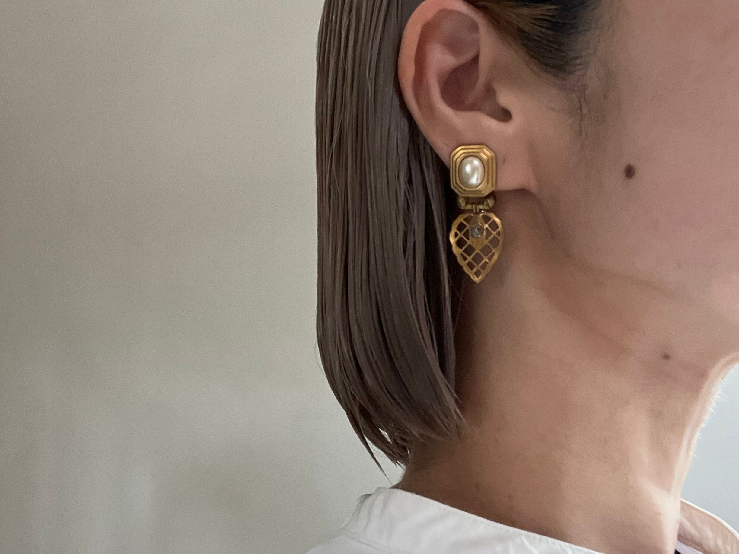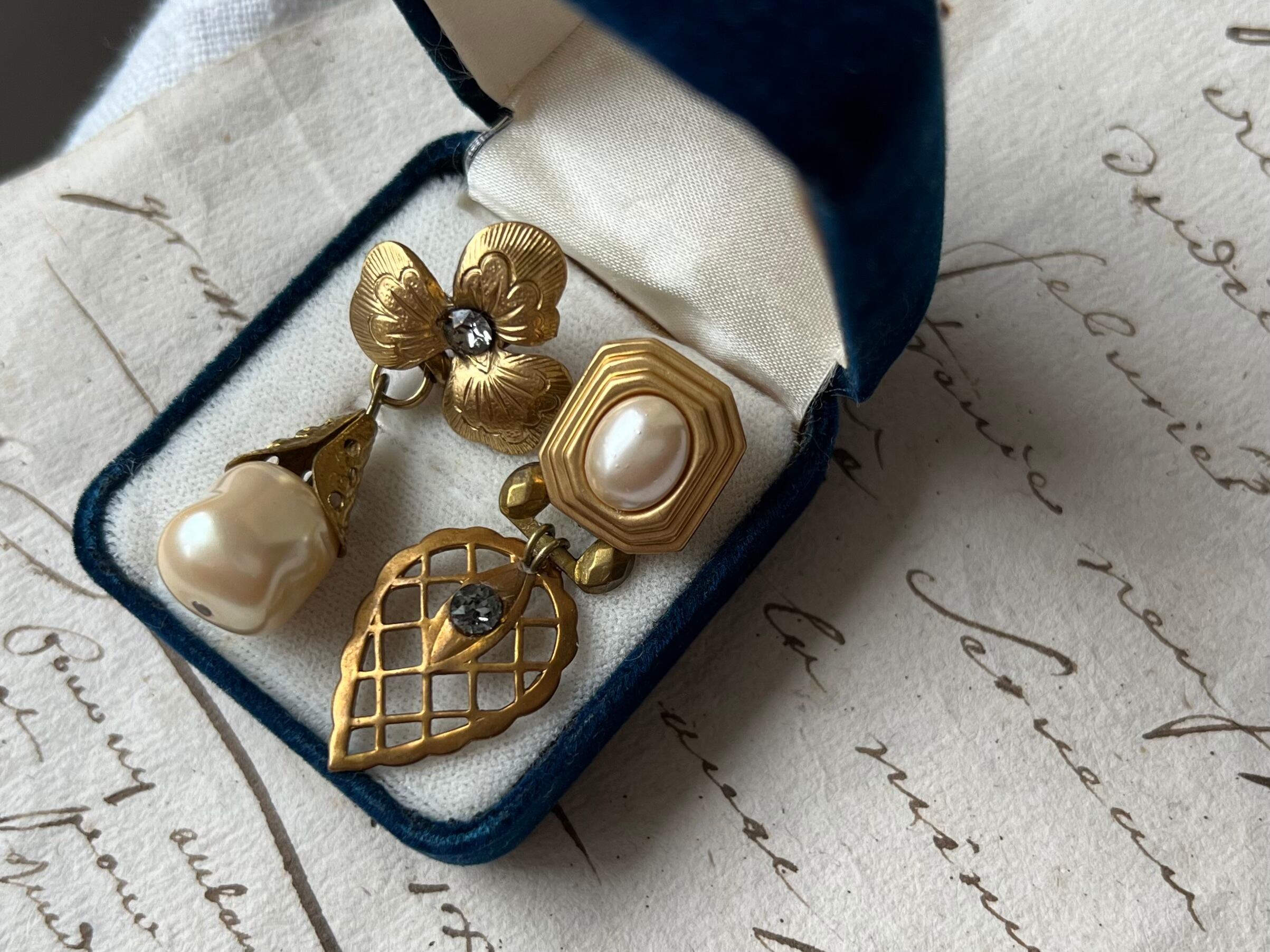 ヴィンテージパーツを使用してアシンメトリーなピアスです。